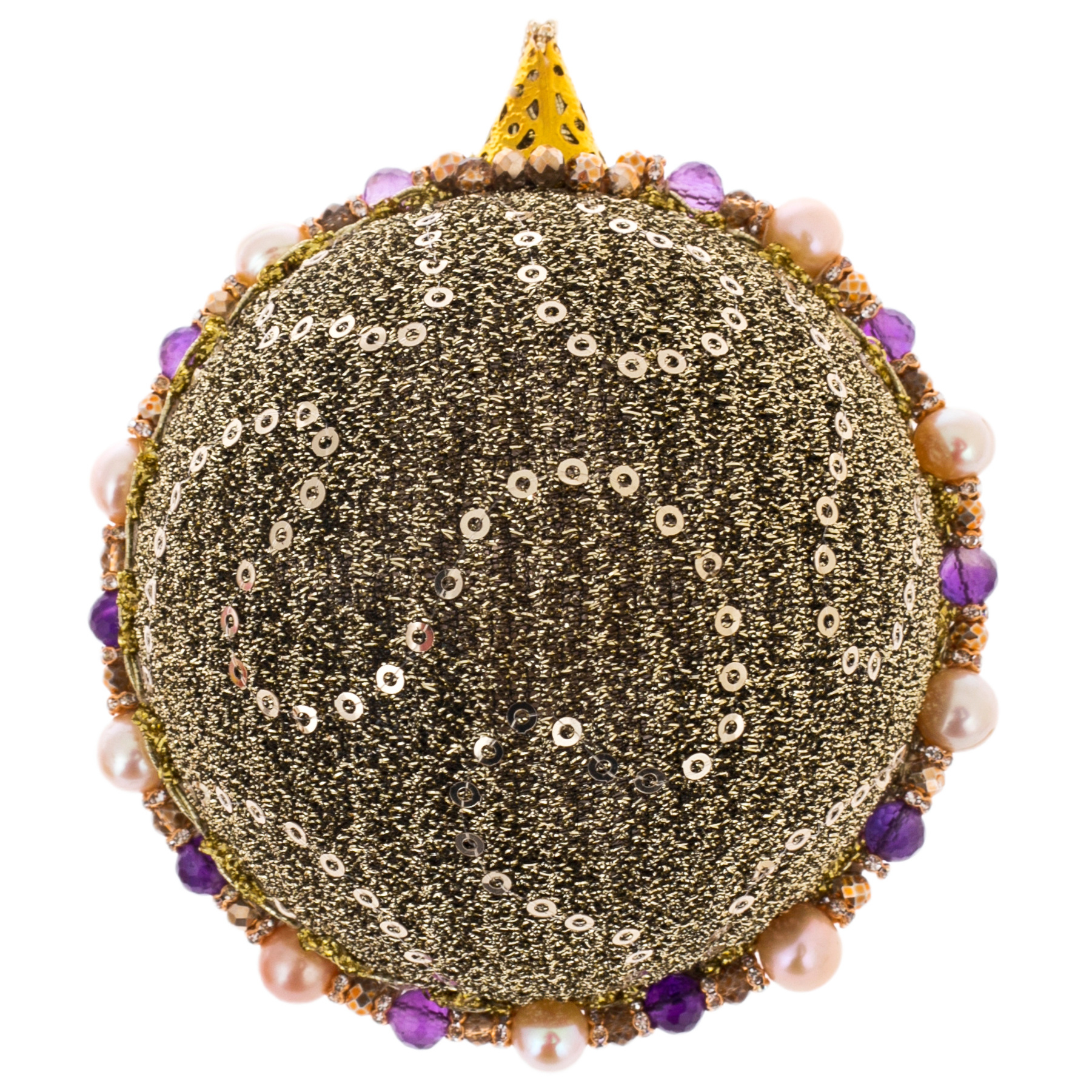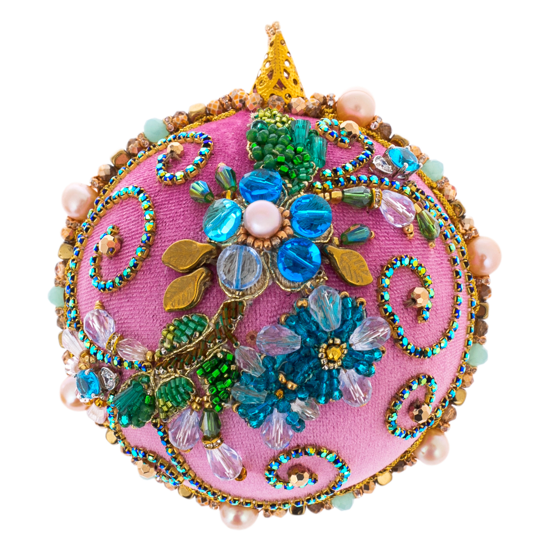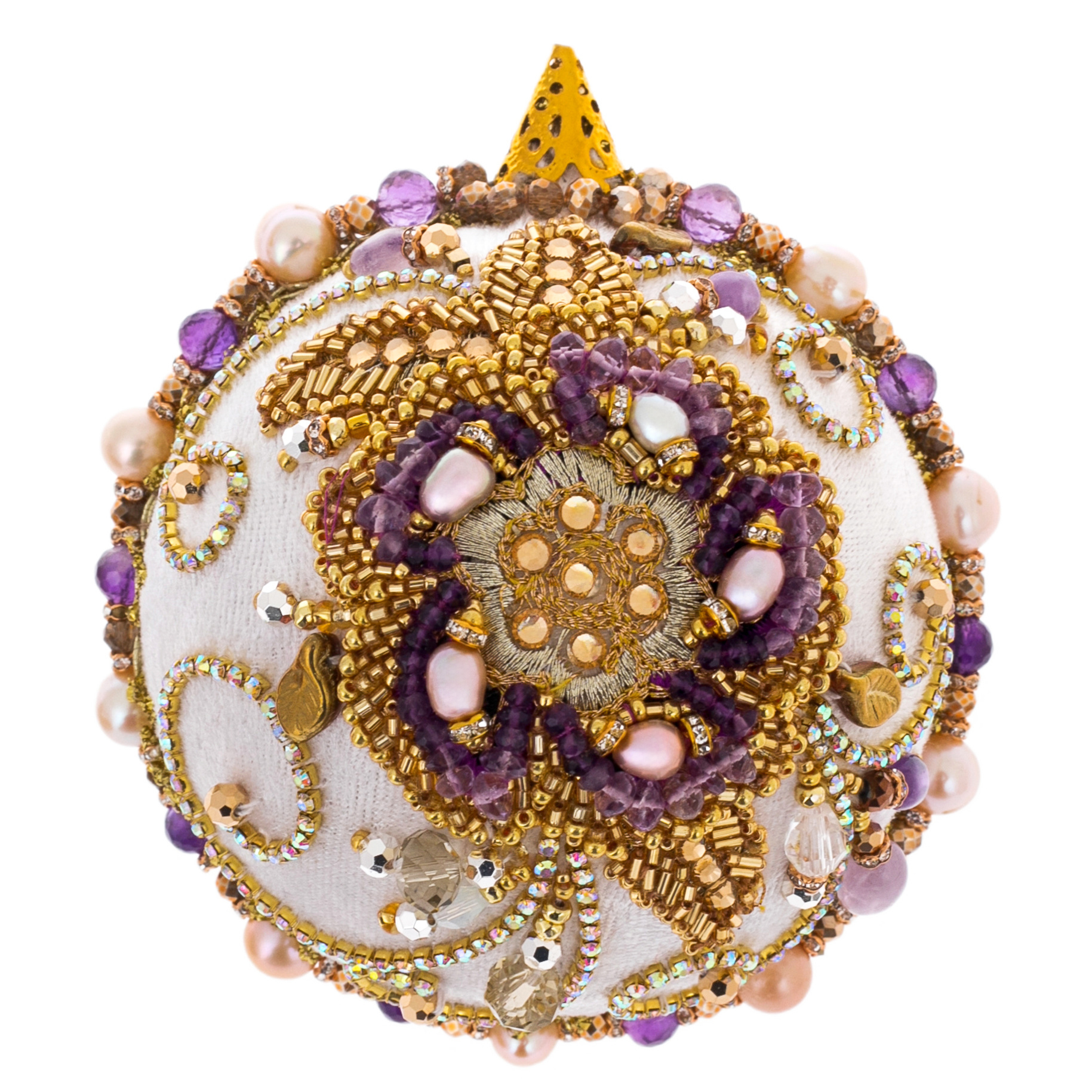 The rich texture highlights the depth and richness of the colors, evoking memories of grand balls and social gatherings. Gold chains and inlaid pearls wrap around the balls like necklaces adorning the empress' neck.