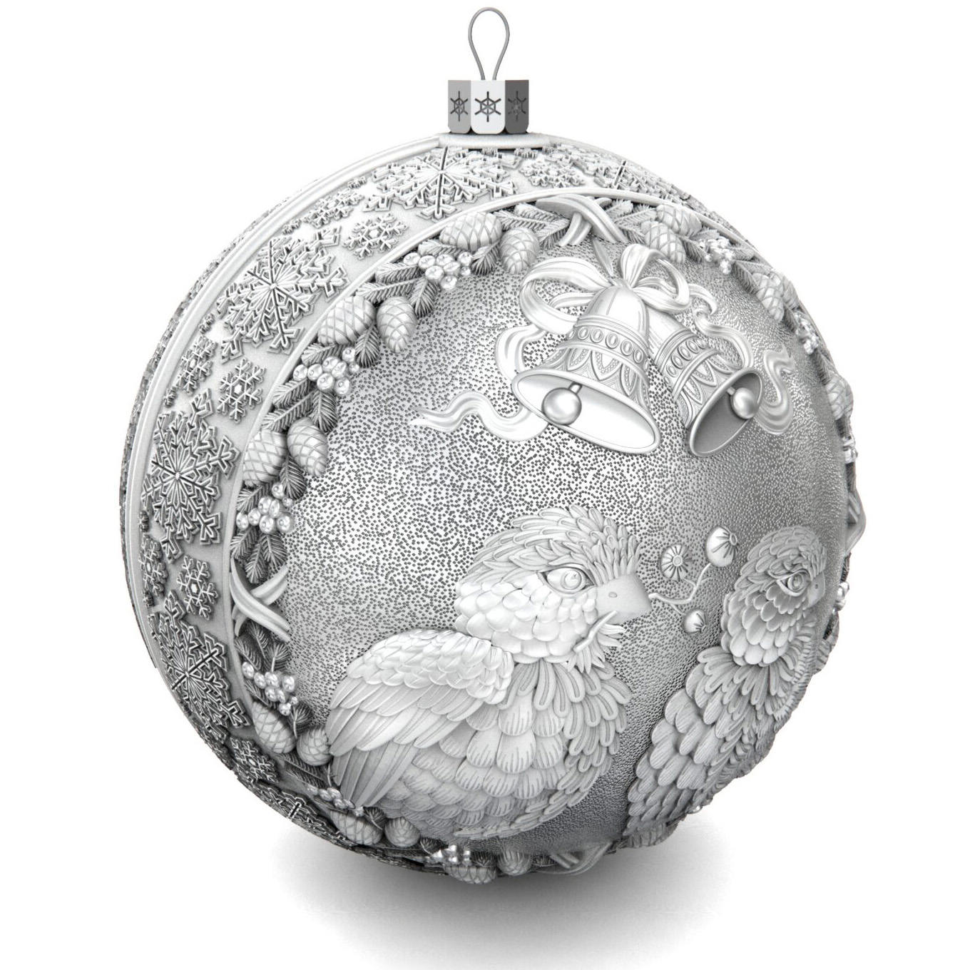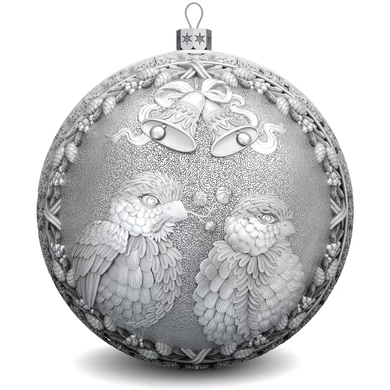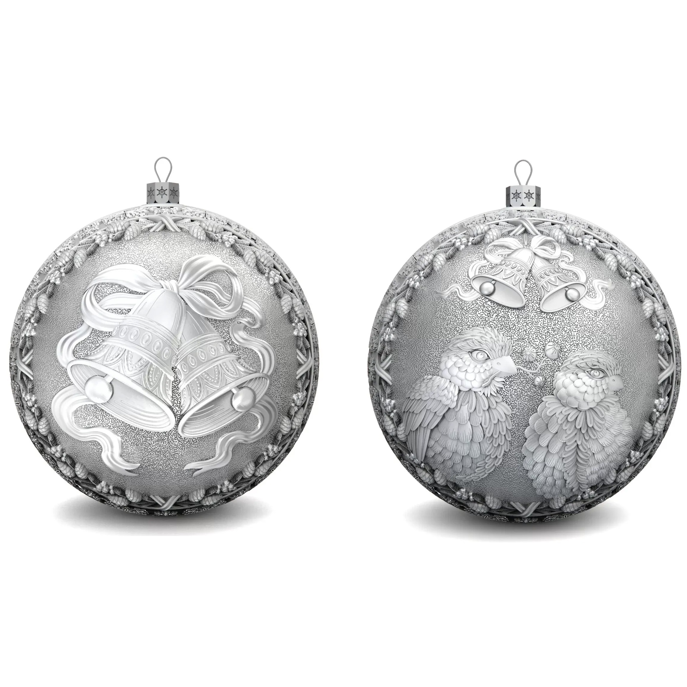 Set of 2 silver Christmas balls "Bells and Bullfinches"