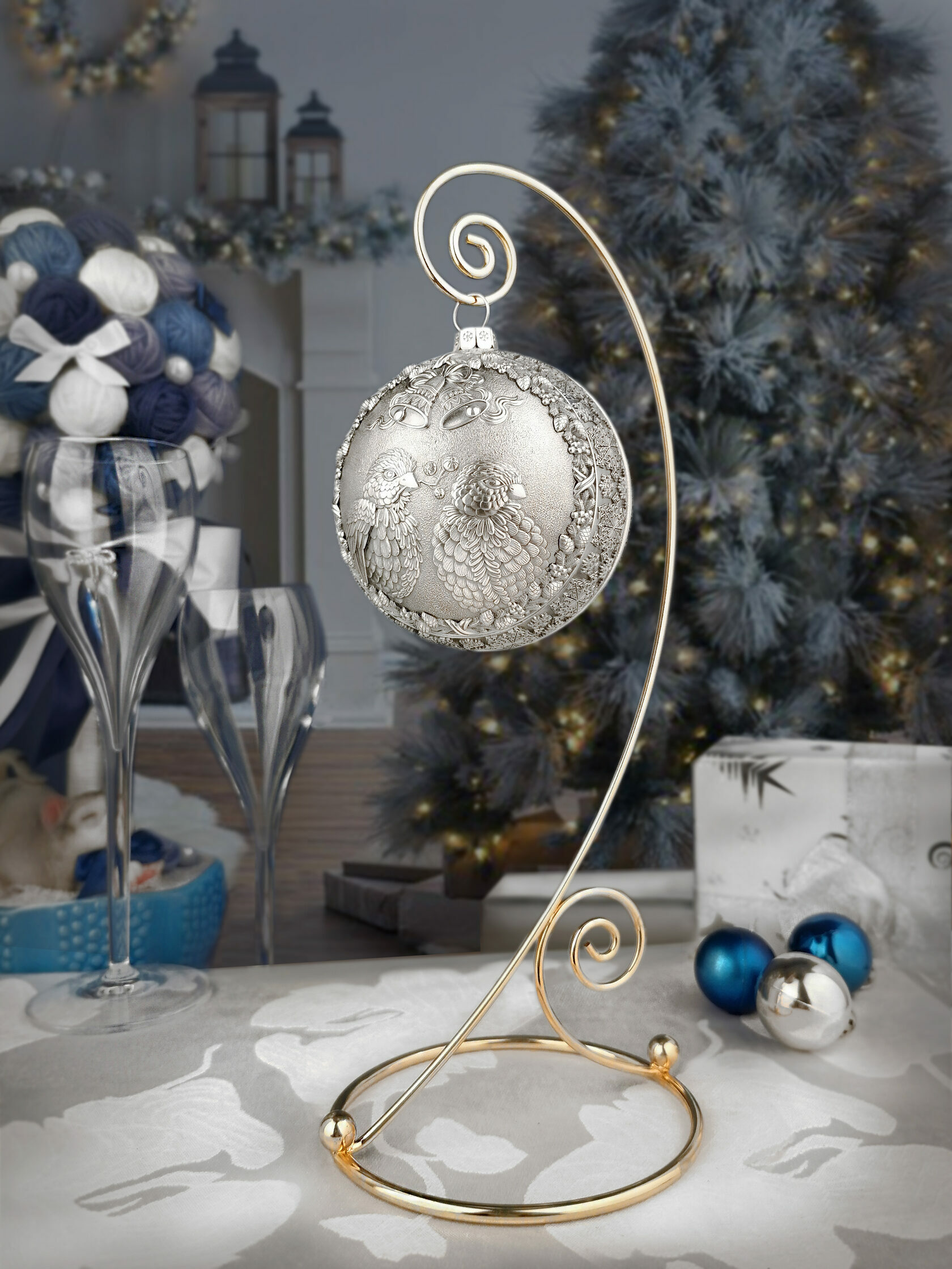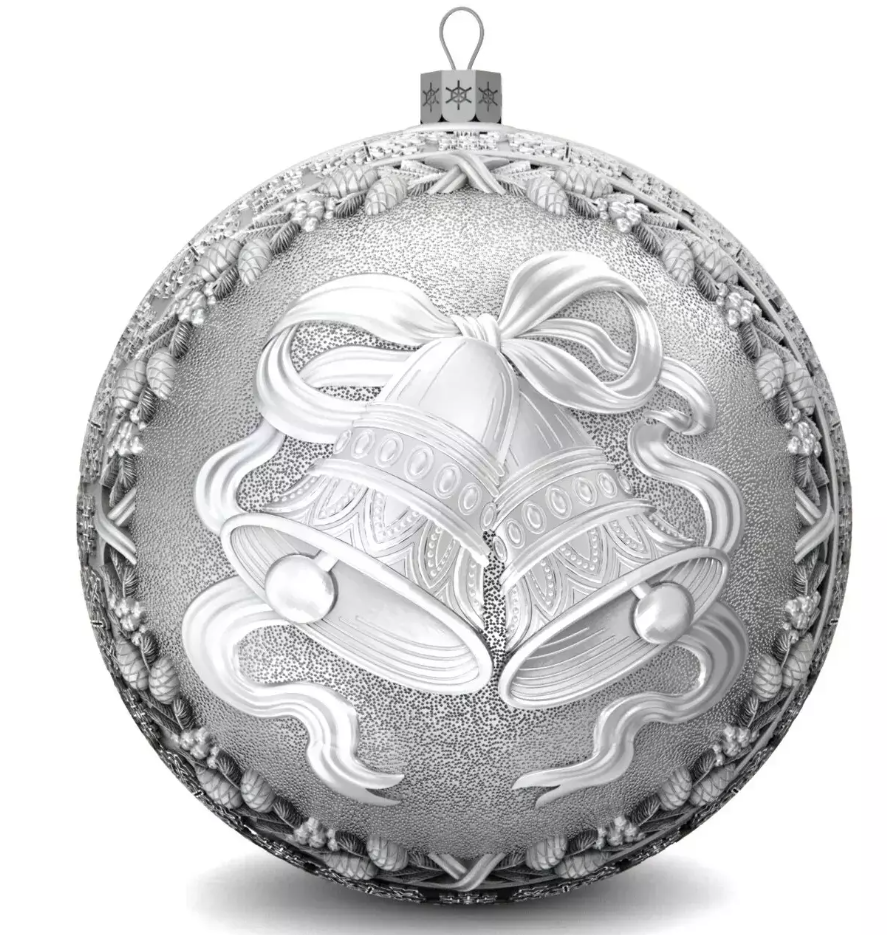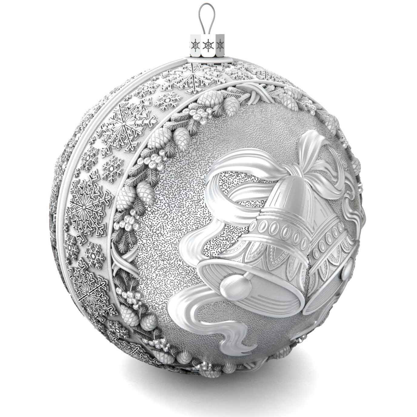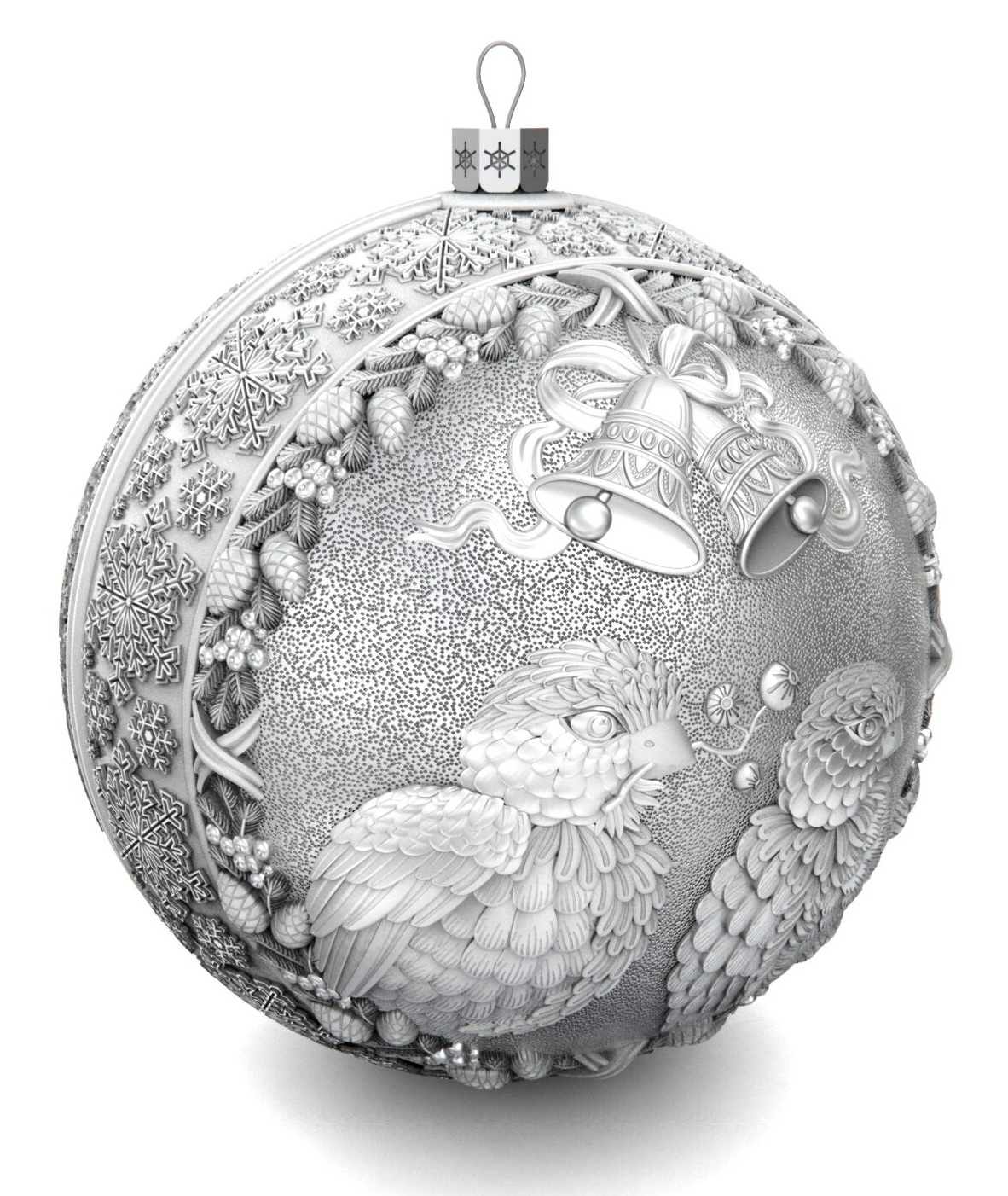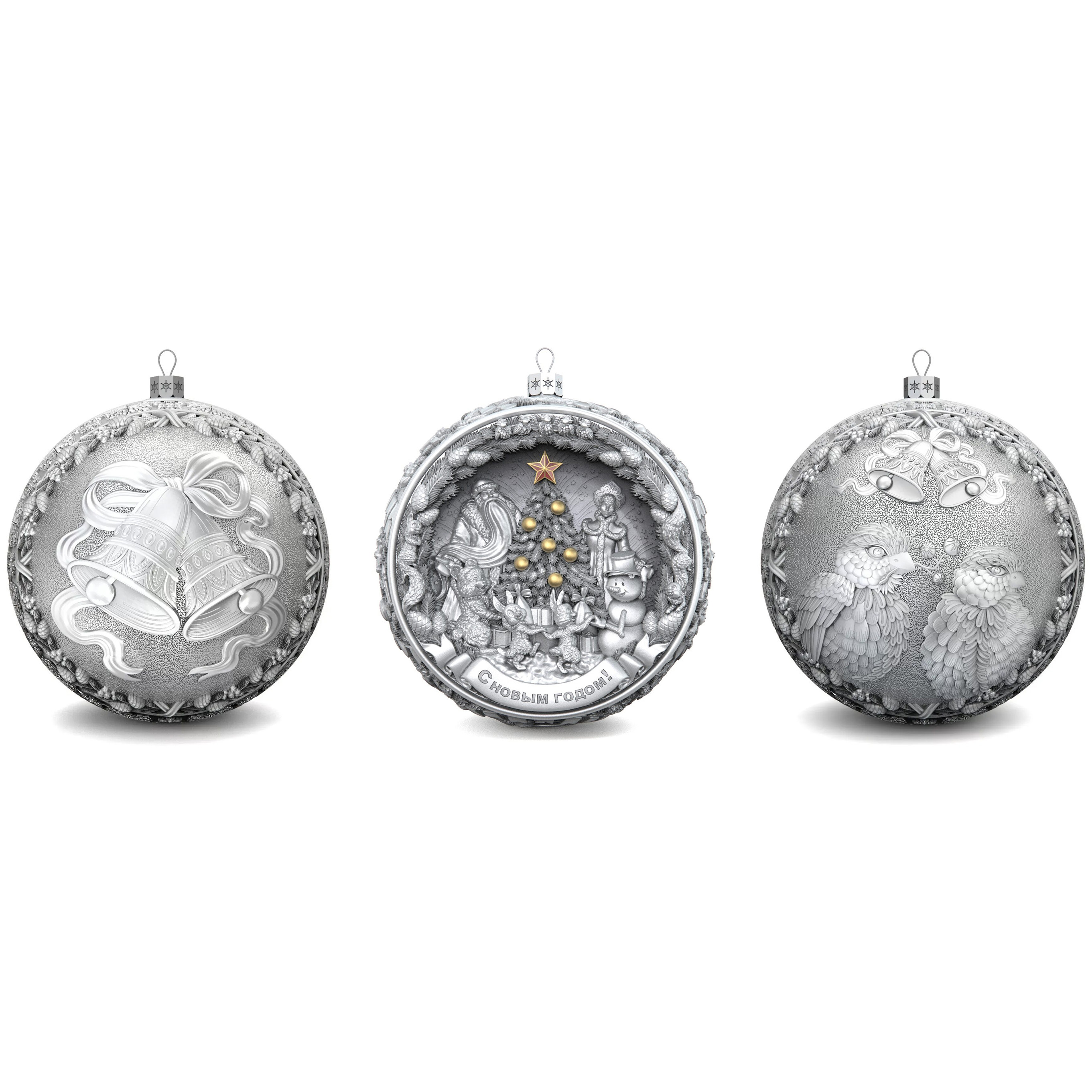 Set of 3 silver Christmas balls "Bells, Happy childhood and Bullfinches"