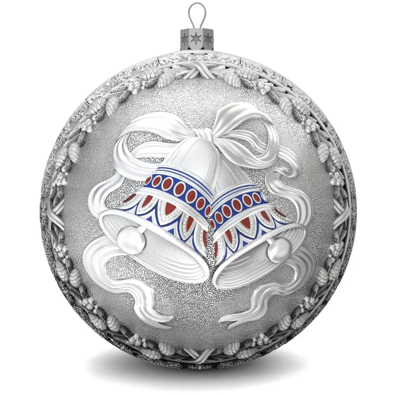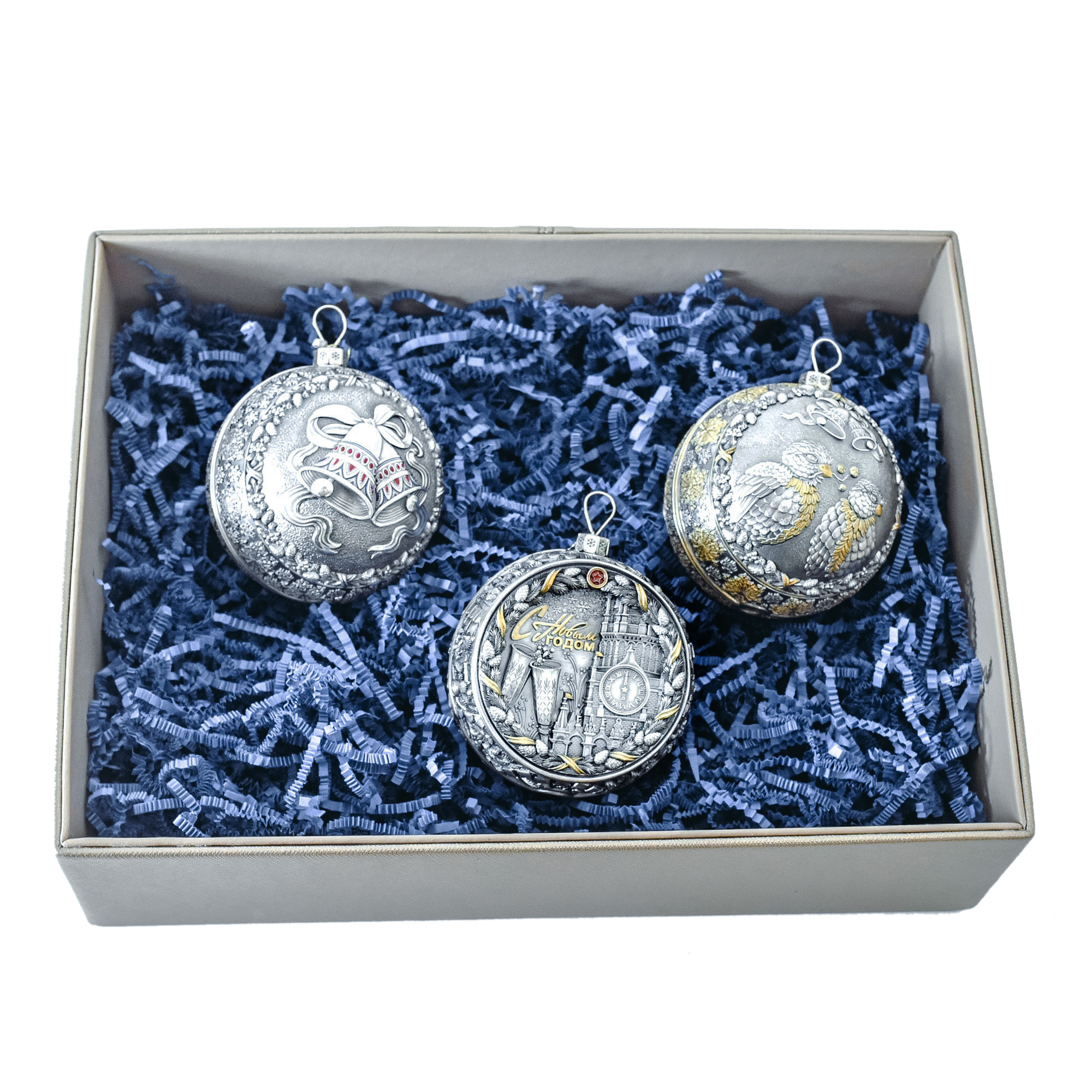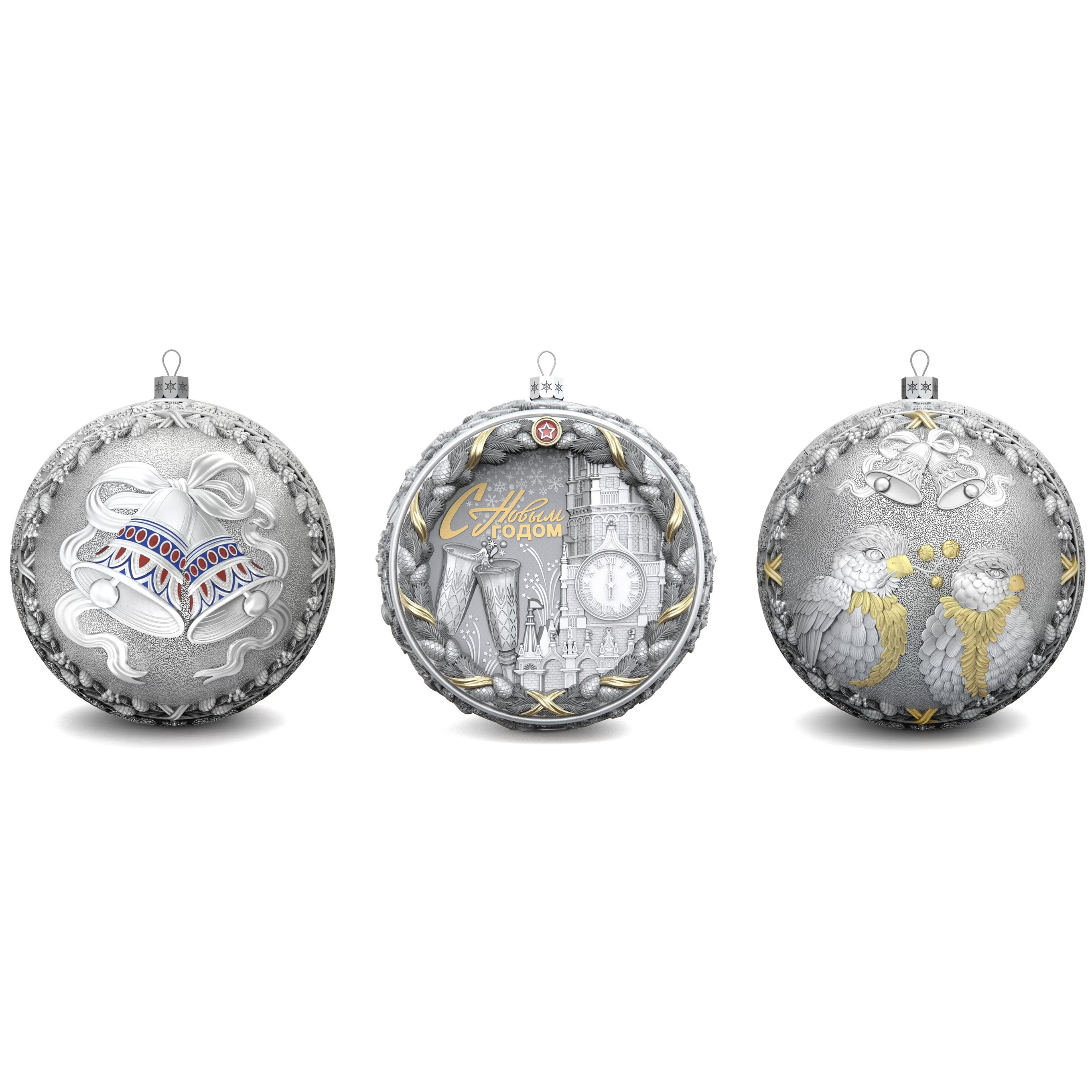 Set of 3 silver Christmas balls "Bells, Bullfinches and Nostalgia"