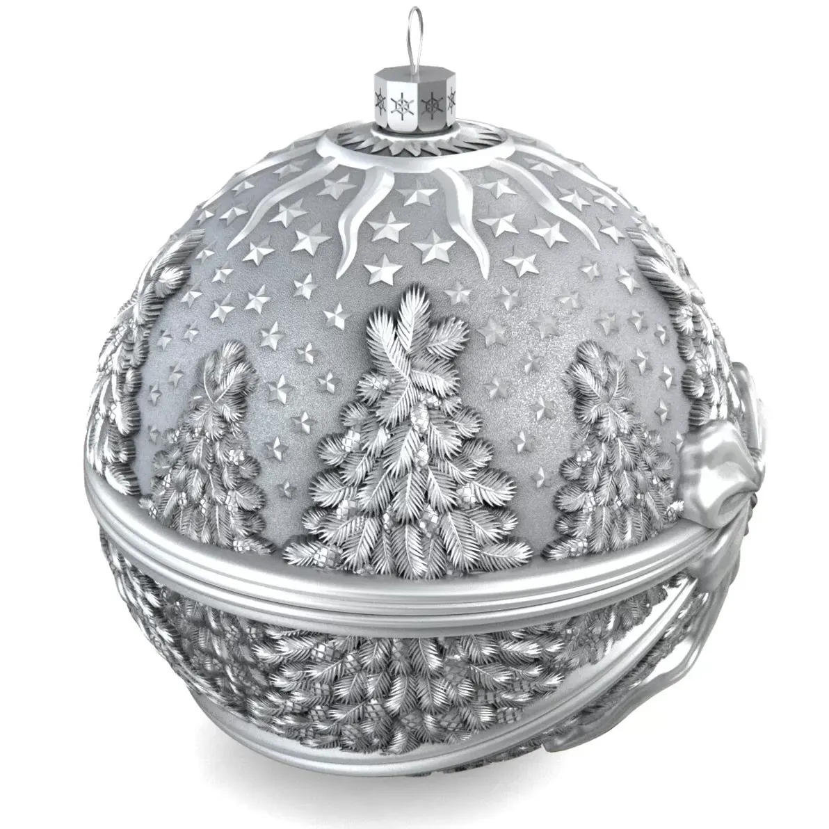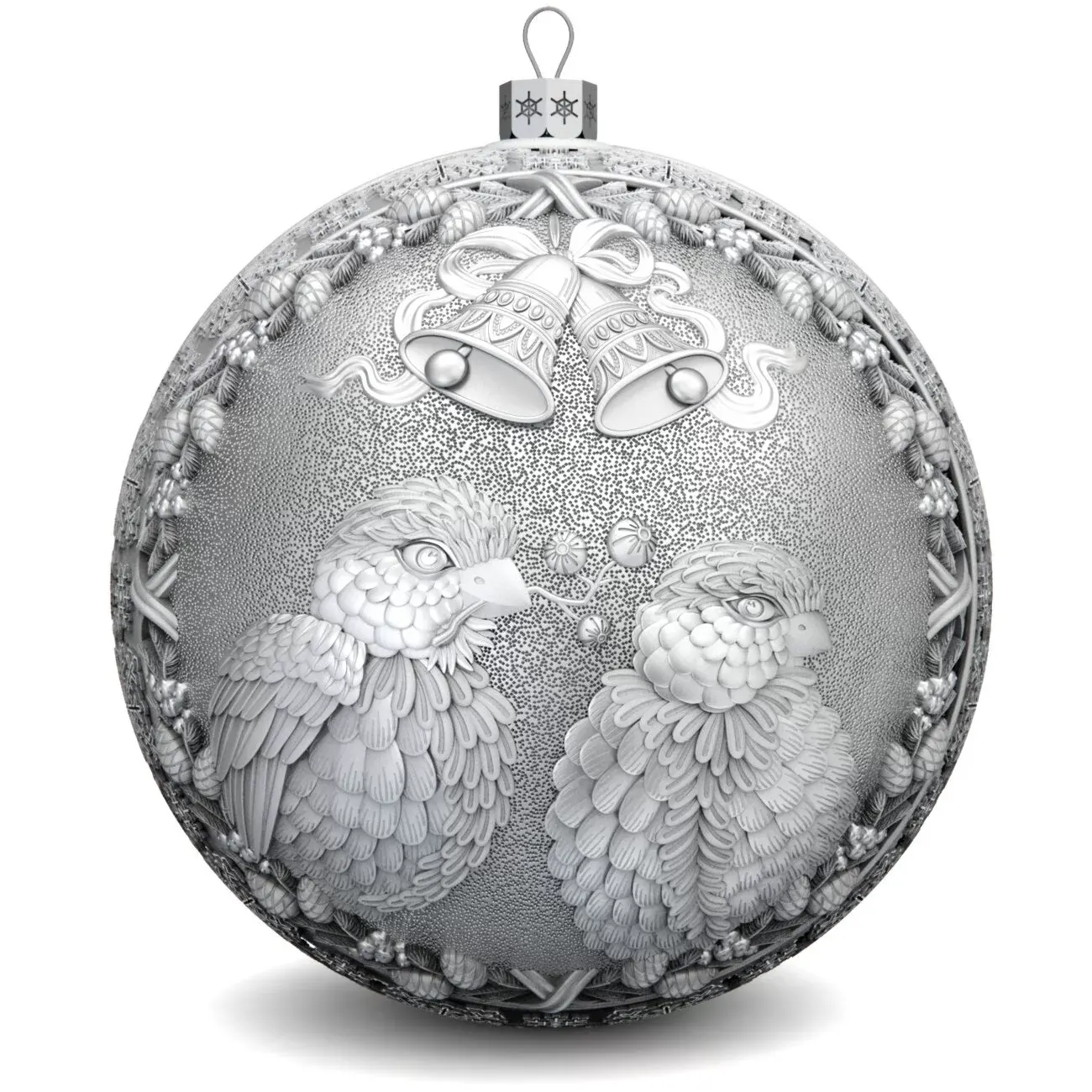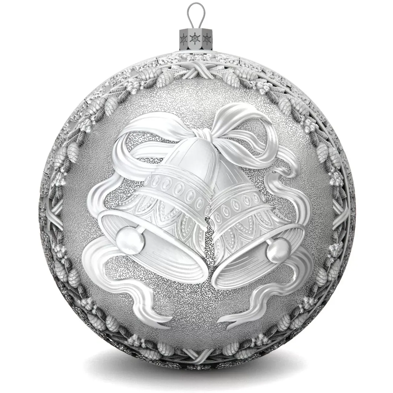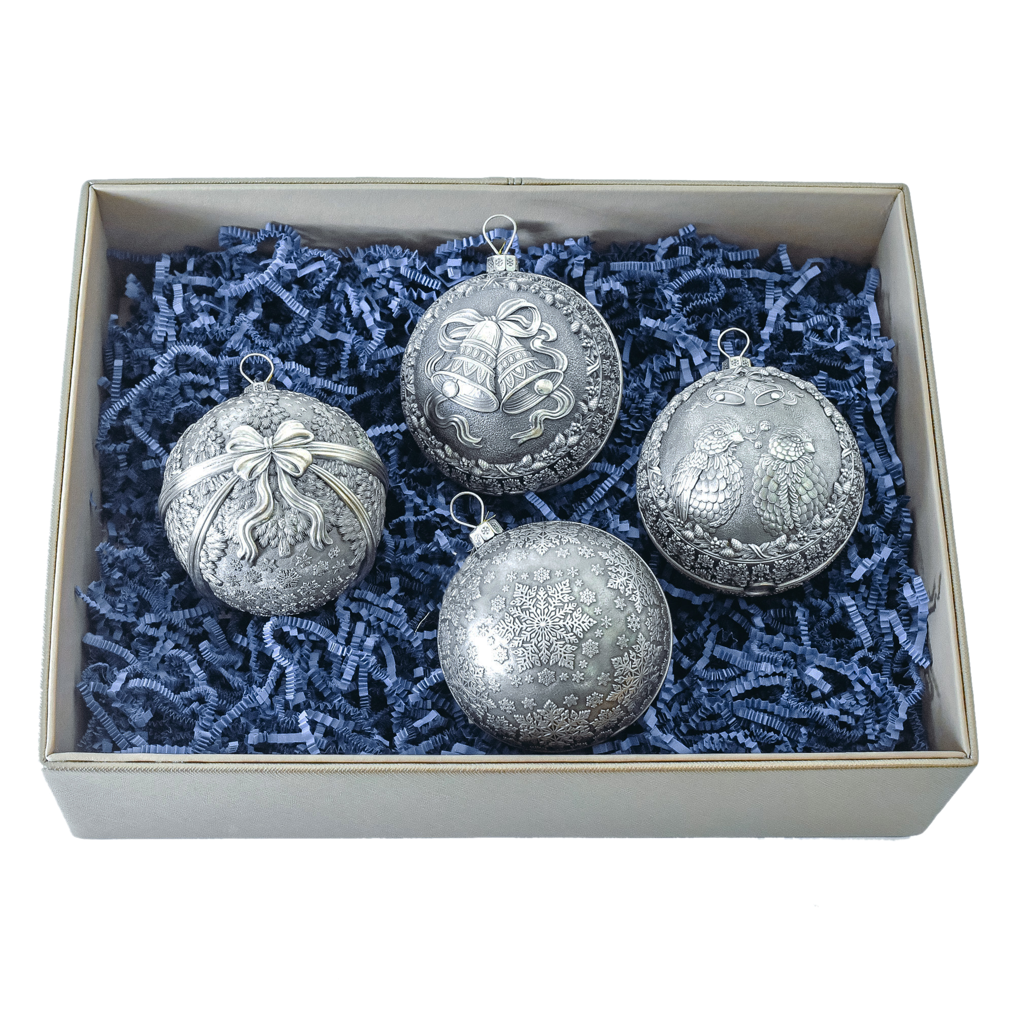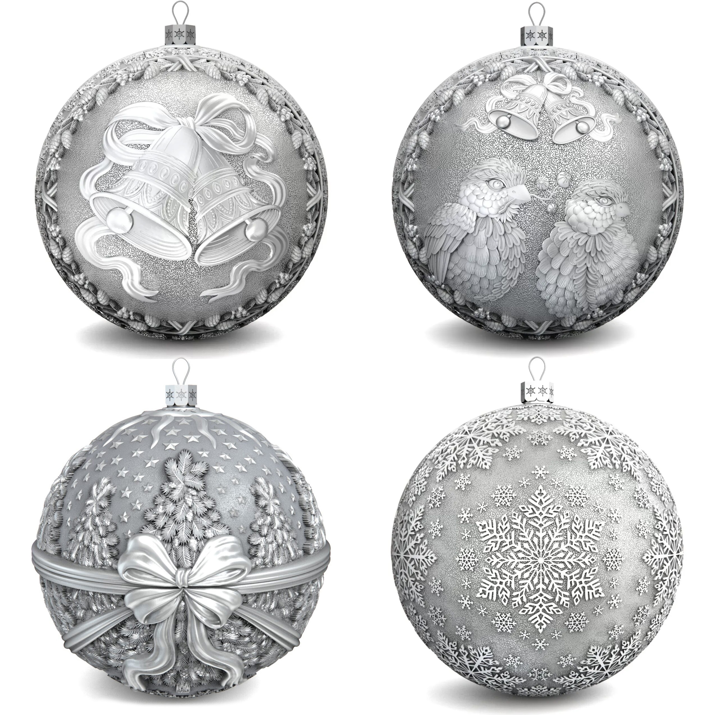 Set of 4 silver Christmas balls "Bells, Bullfinches, Snowflakes and a Winter fairy tale"