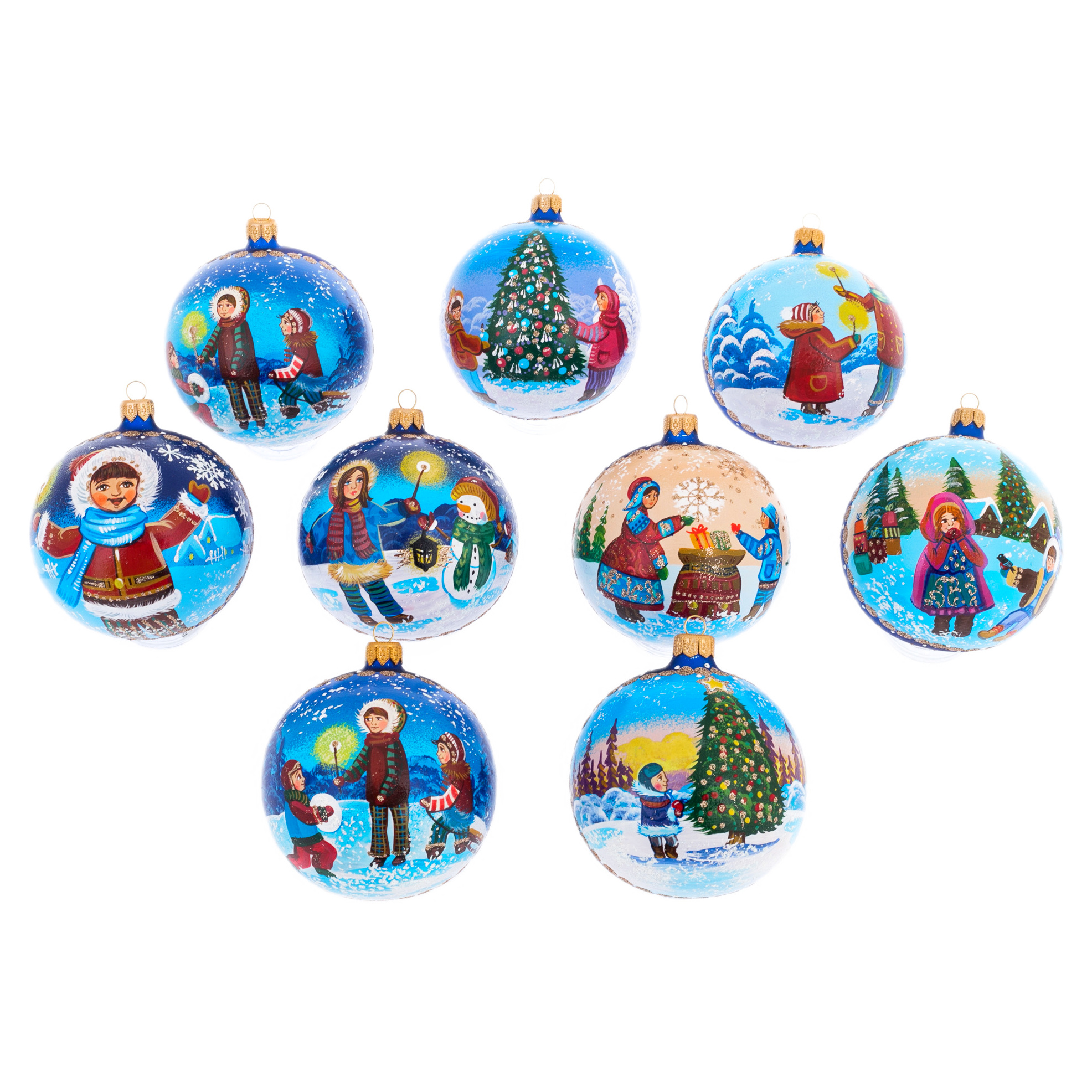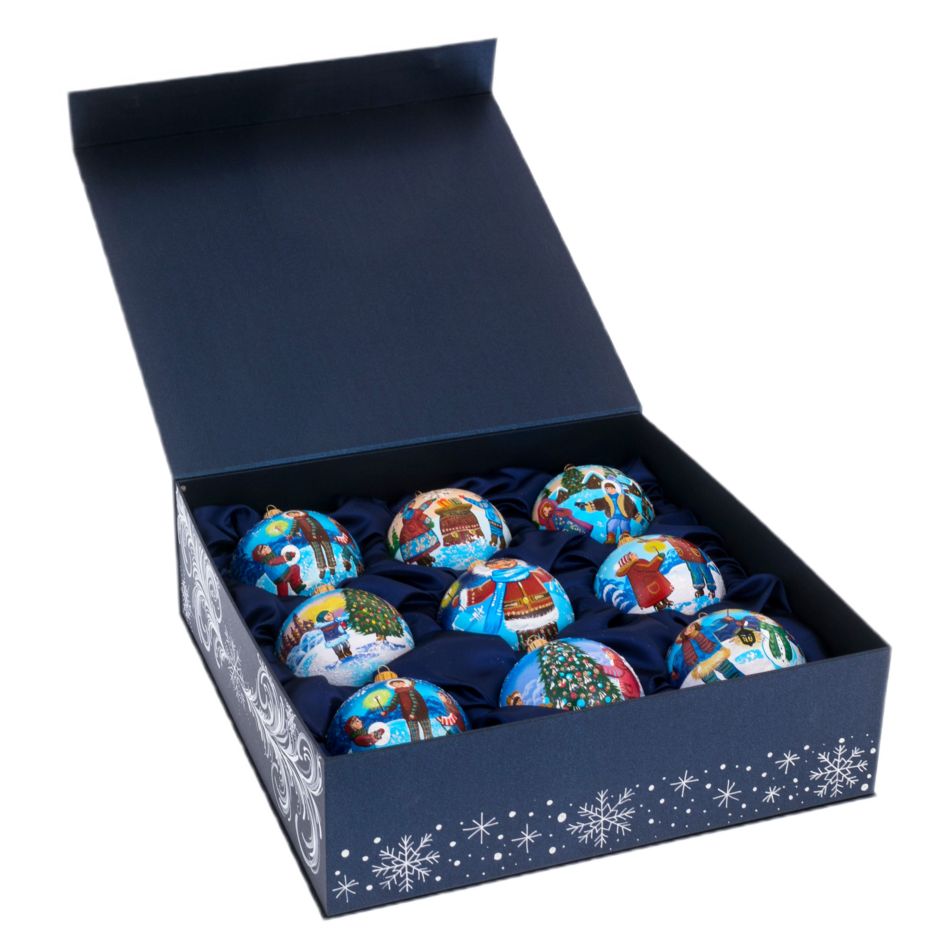 Set of 9 Christmas balls "Winter Holidays" in a musical painted box