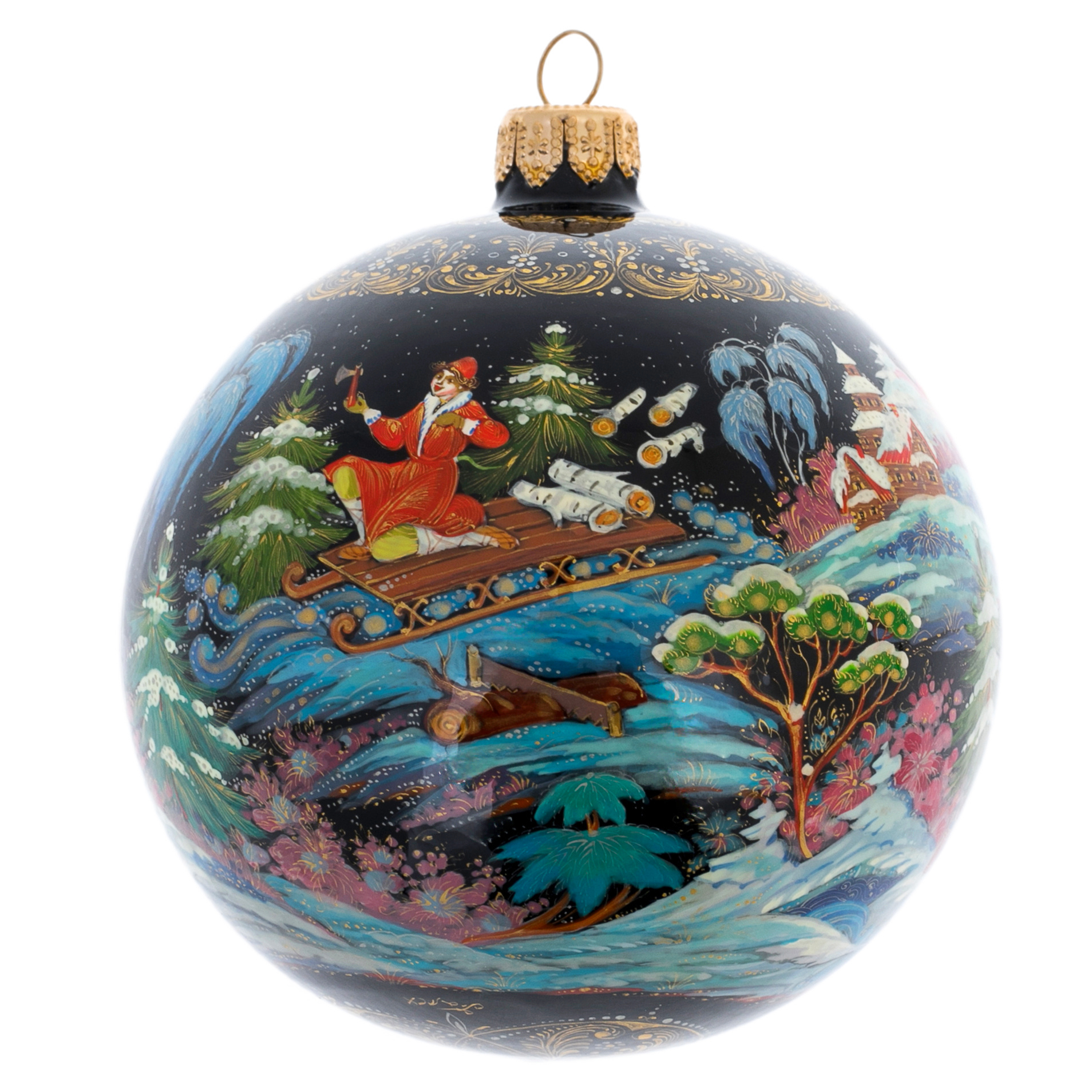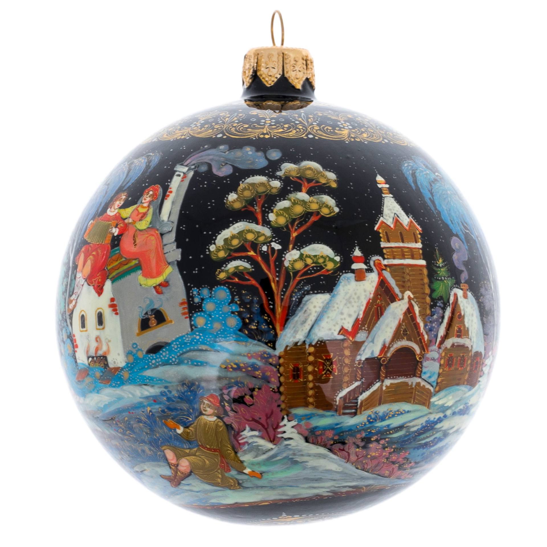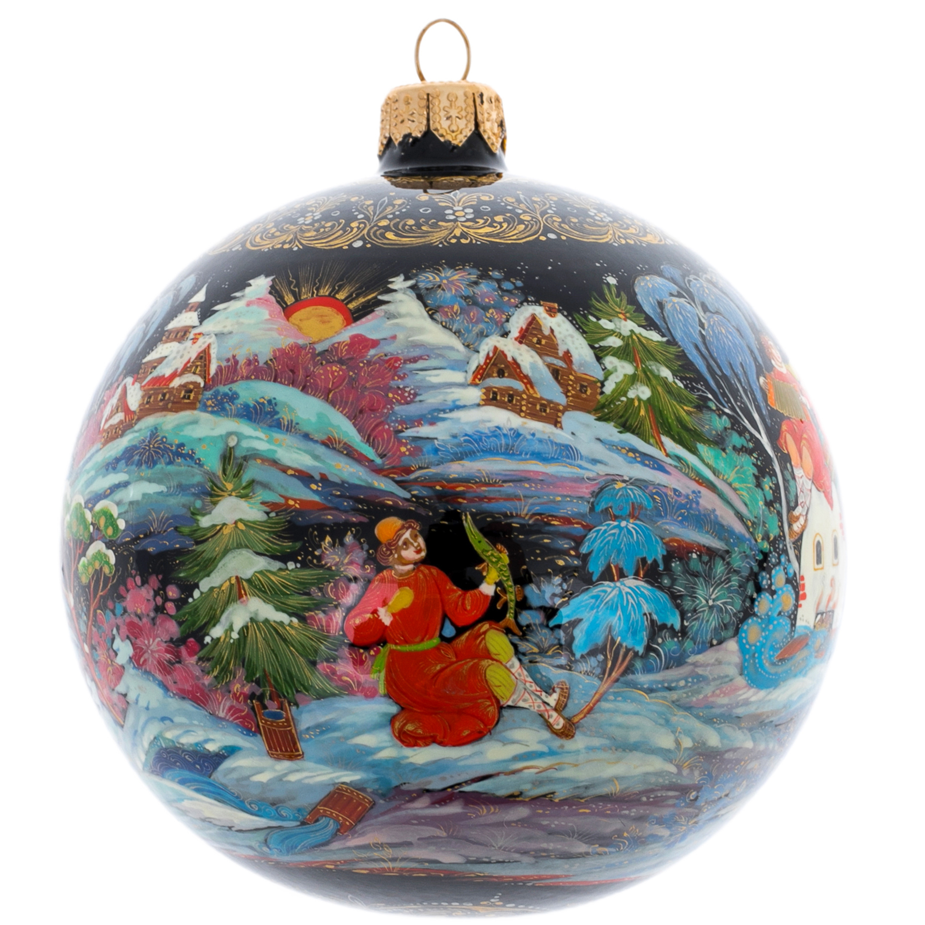 Этот елочный шар создан в традициях палехской миниатюры, прославившейся филигранной прорисовкой деталей и глубокой поэтичностью образов. Ручная роспись ложится на идеальную поверхность шара тонкими, почти ювелирными линиями, придавая ему характер художественного объекта, а не просто праздничного аксессуара. Каждая мазковая тень, каждая золотая нить орнамента вписывается в канон лаковой живописи, формируя впечатление драгоценной миниатюры, перенесенной на объемную сферу.