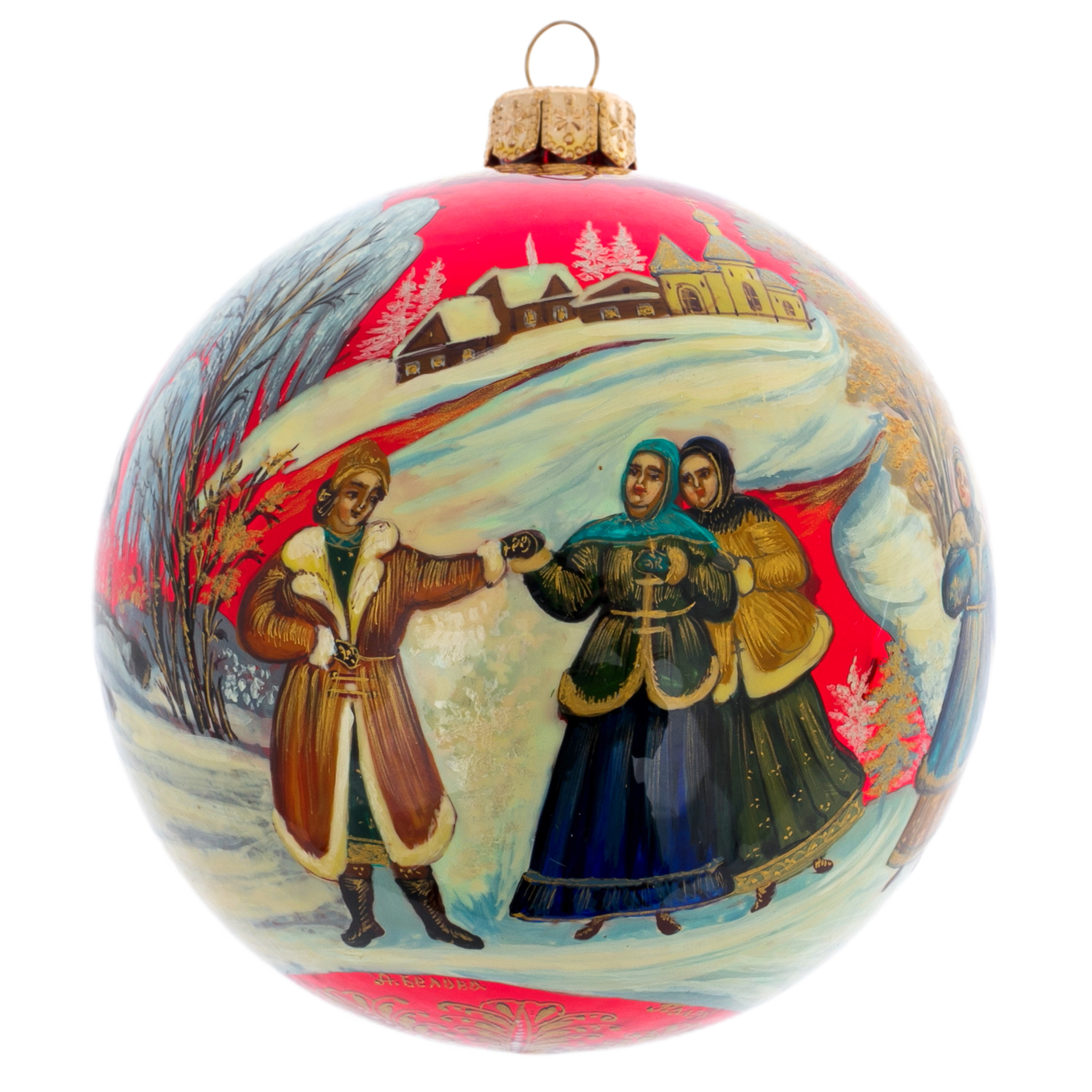 Этот елочный шар создан в традициях палехской миниатюры, прославившейся филигранной прорисовкой деталей и глубокой поэтичностью образов. Ручная роспись ложится на идеальную поверхность шара тонкими, почти ювелирными линиями, придавая ему характер художественного объекта, а не просто праздничного аксессуара. Каждая мазковая тень, каждая золотая нить орнамента вписывается в канон лаковой живописи, формируя впечатление драгоценной миниатюры, перенесенной на объемную сферу.