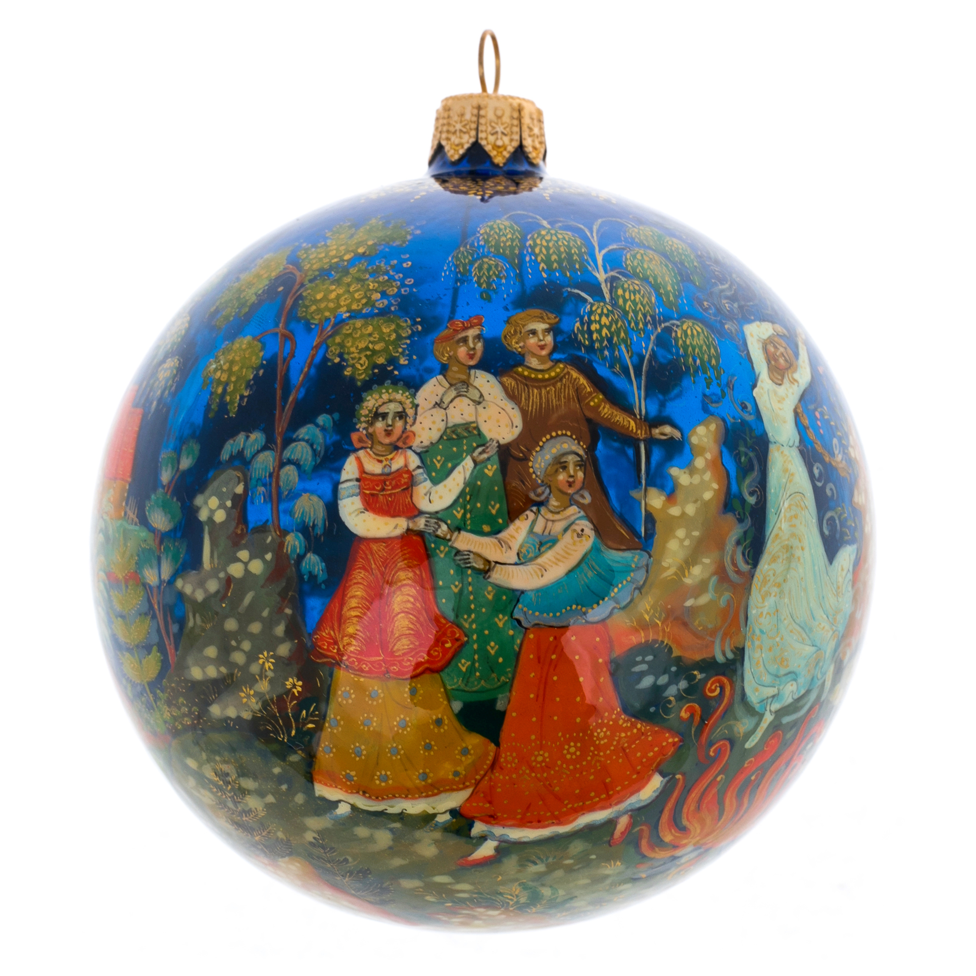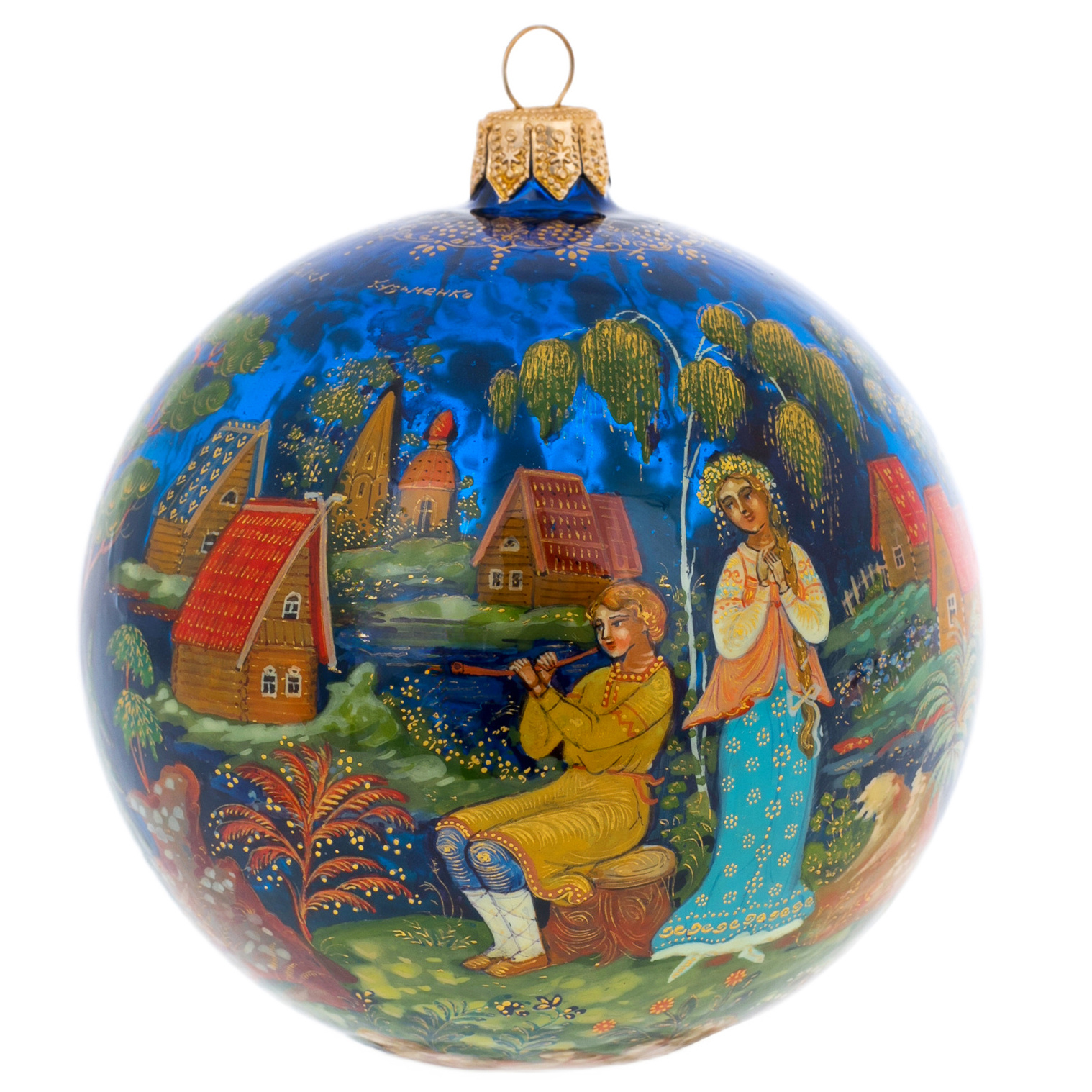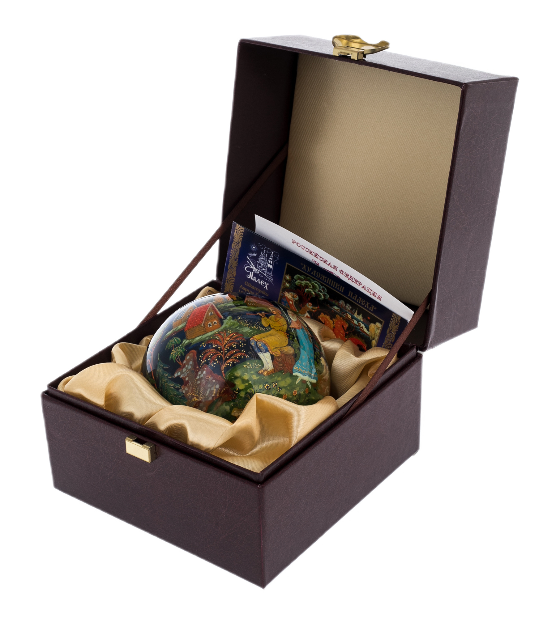 Этот елочный шар создан в традициях палехской миниатюры, прославившейся филигранной прорисовкой деталей и глубокой поэтичностью образов. Ручная роспись ложится на идеальную поверхность шара тонкими, почти ювелирными линиями, придавая ему характер художественного объекта, а не просто праздничного аксессуара. Каждая мазковая тень, каждая золотая нить орнамента вписывается в канон лаковой живописи, формируя впечатление драгоценной миниатюры, перенесенной на объемную сферу.