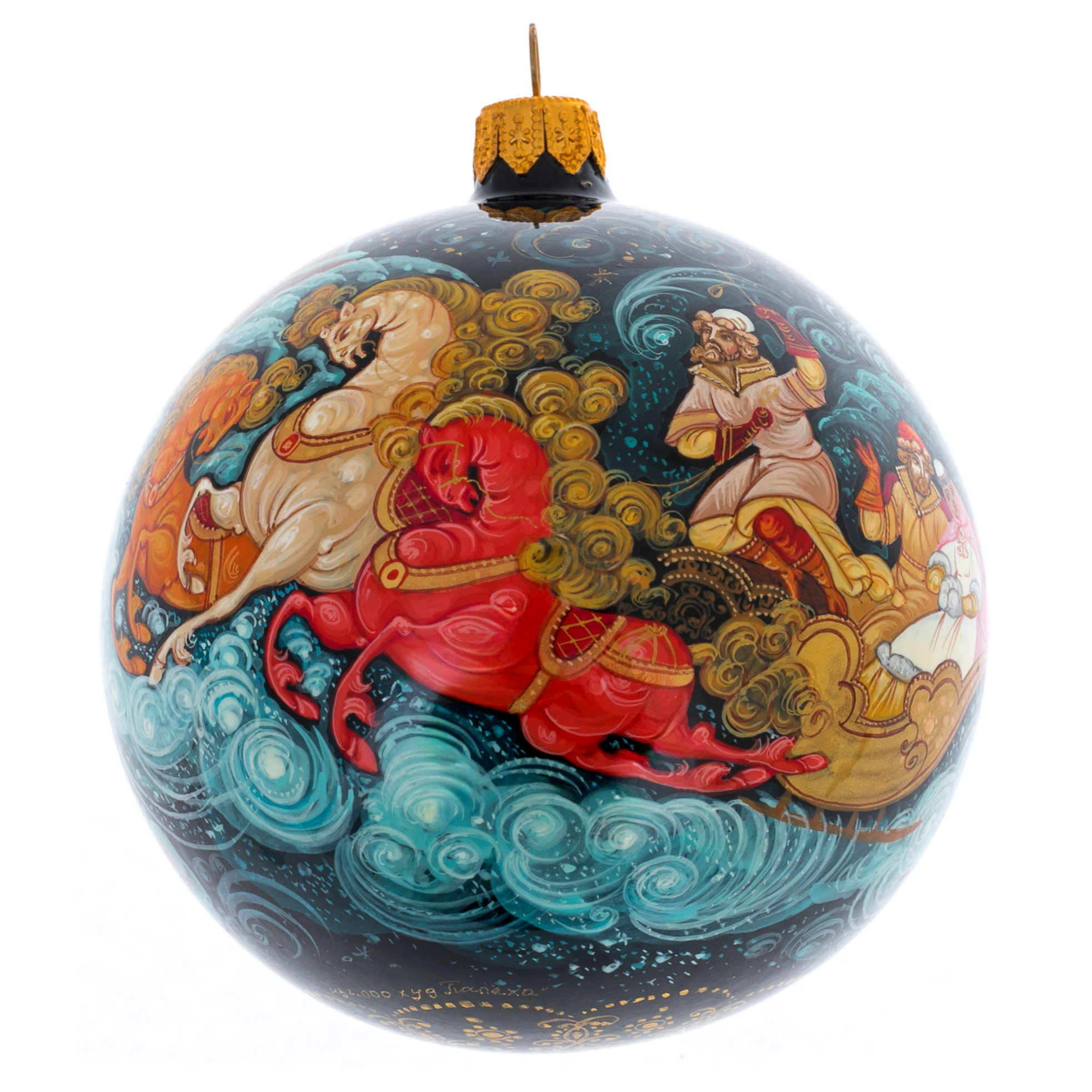 Этот елочный шар создан в традициях палехской миниатюры, прославившейся филигранной прорисовкой деталей и глубокой поэтичностью образов. Ручная роспись ложится на идеальную поверхность шара тонкими, почти ювелирными линиями, придавая ему характер художественного объекта, а не просто праздничного аксессуара. Каждая мазковая тень, каждая золотая нить орнамента вписывается в канон лаковой живописи, формируя впечатление драгоценной миниатюры, перенесенной на объемную сферу.