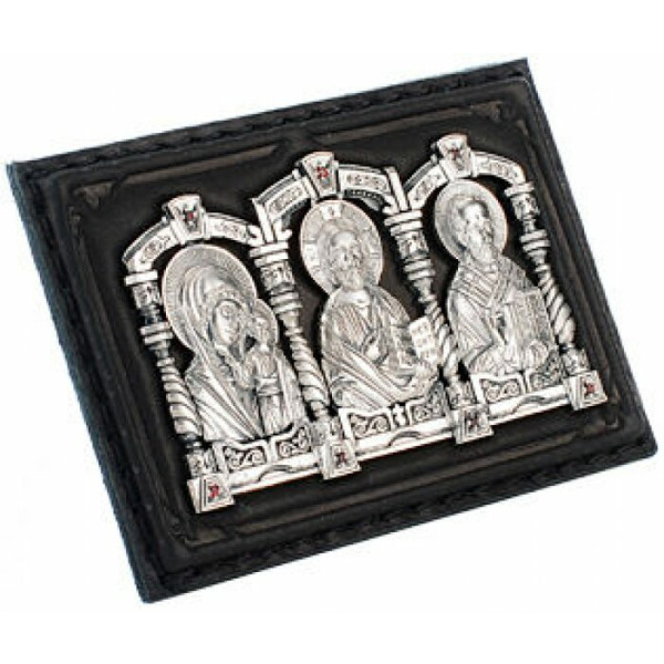 The handmade icon with a silver triptych is made on a calfskin backing. In the center of the triptych, the icon was Saved by the Almighty. To the left of the Savior is the image of the Kazan Mother of God, an assistant in all everyday affairs, a comforter and intercessor. On the right is an icon of St. Nicholas, the patron saint of all travelers.