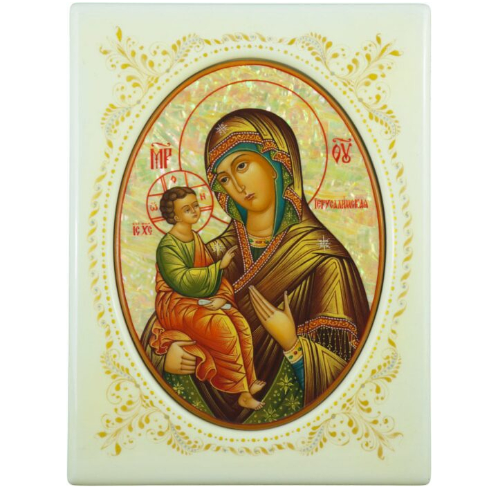 Mother of Pearl icon "Our Lady of Jerusalem" in a white frame