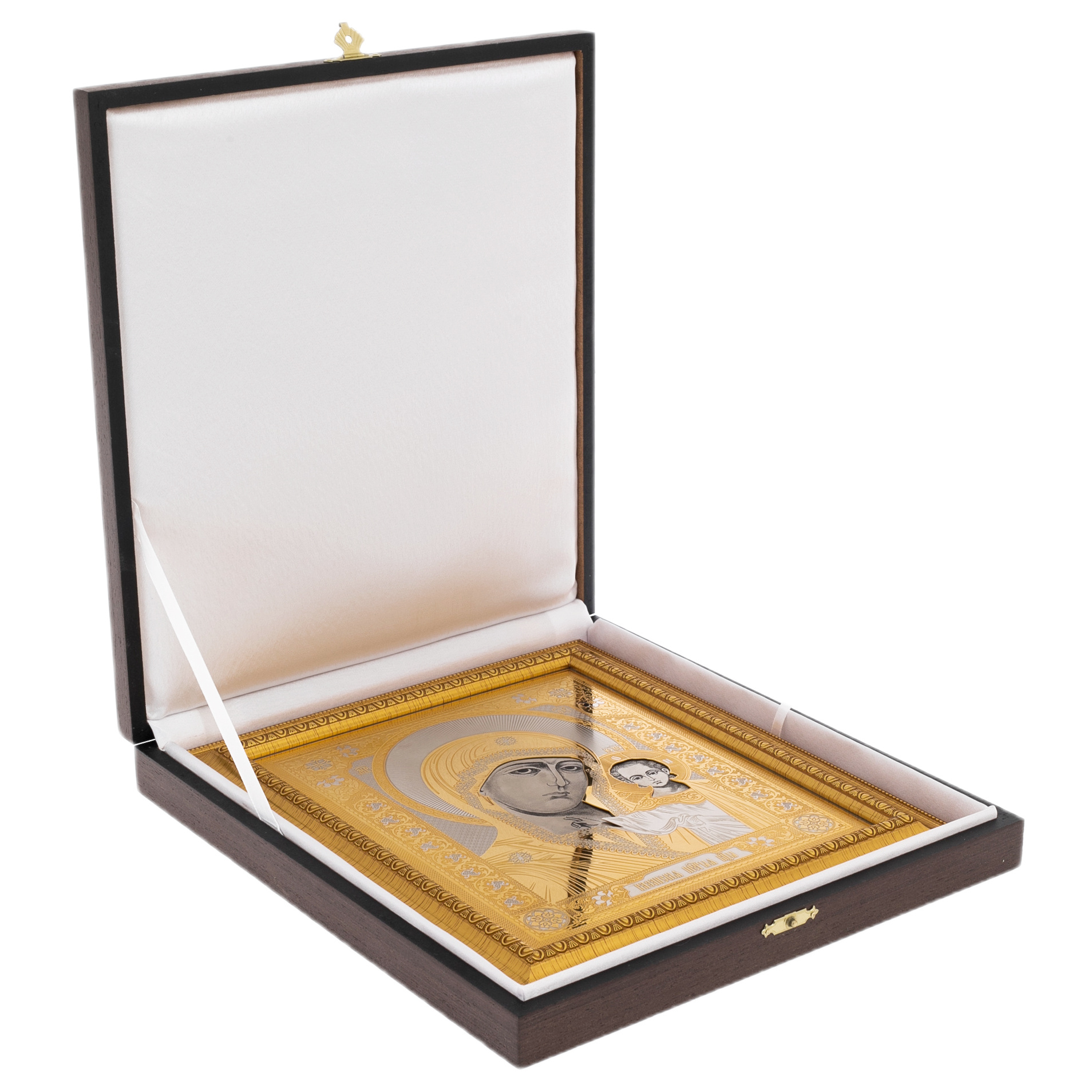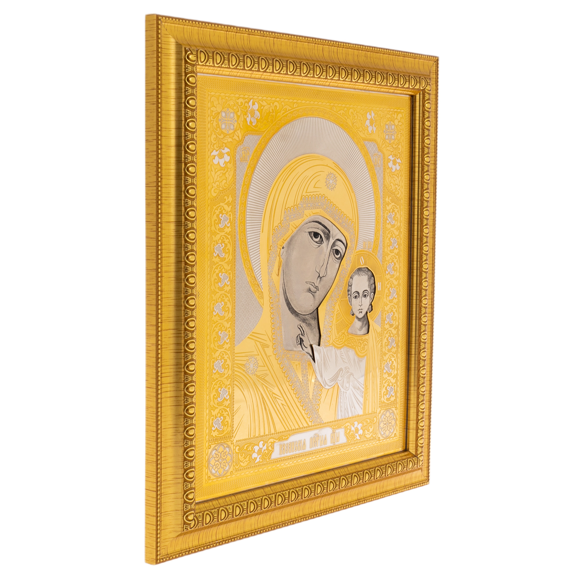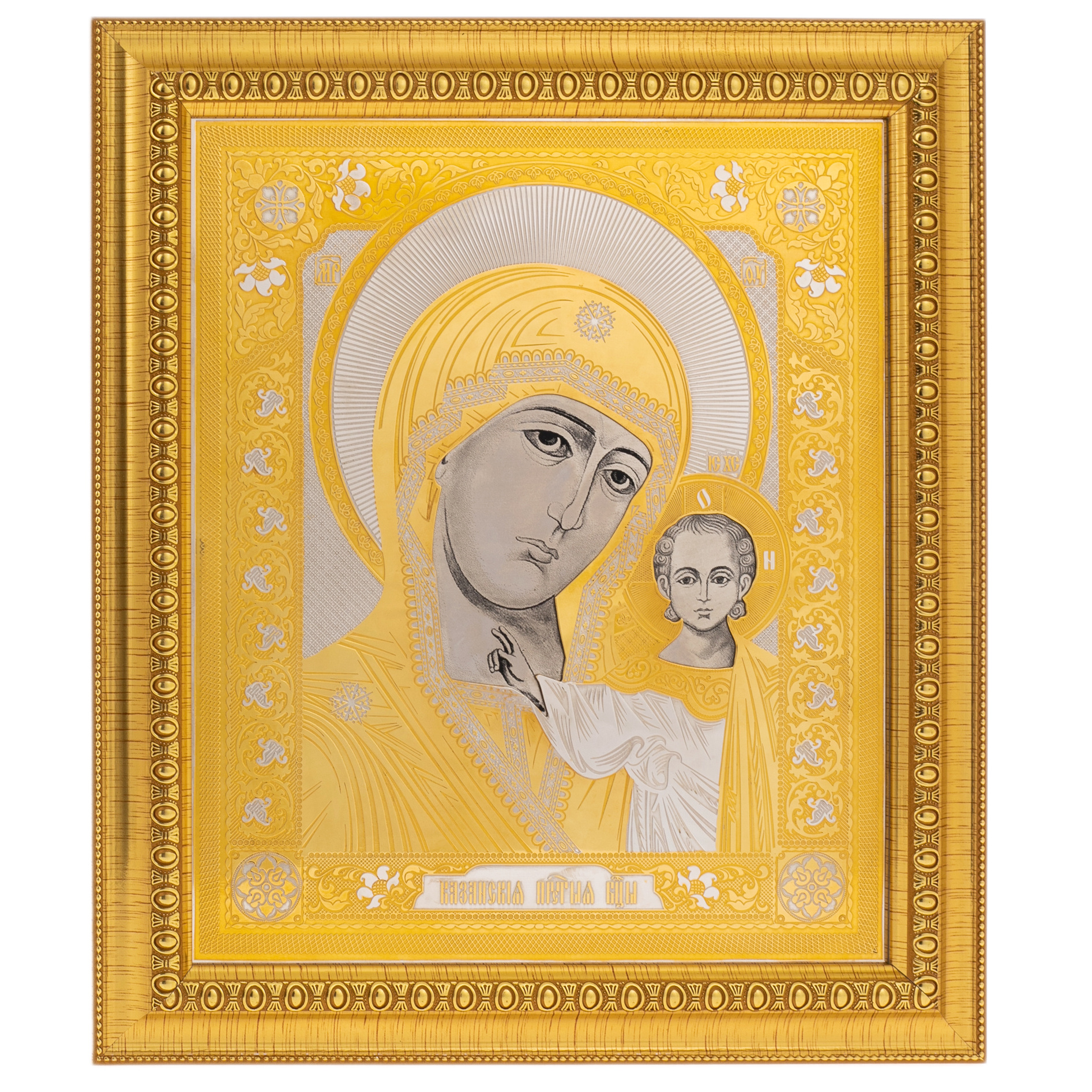 The image of the Kazan Mother of God, encased in shining brass, seems to carry a mystical connection with the sky, where every element, every detail responds with grace. It is not just an icon, but a powerful concentration of sacred energy, embodied in metal and patterns, which awakens ancient spiritual forces.