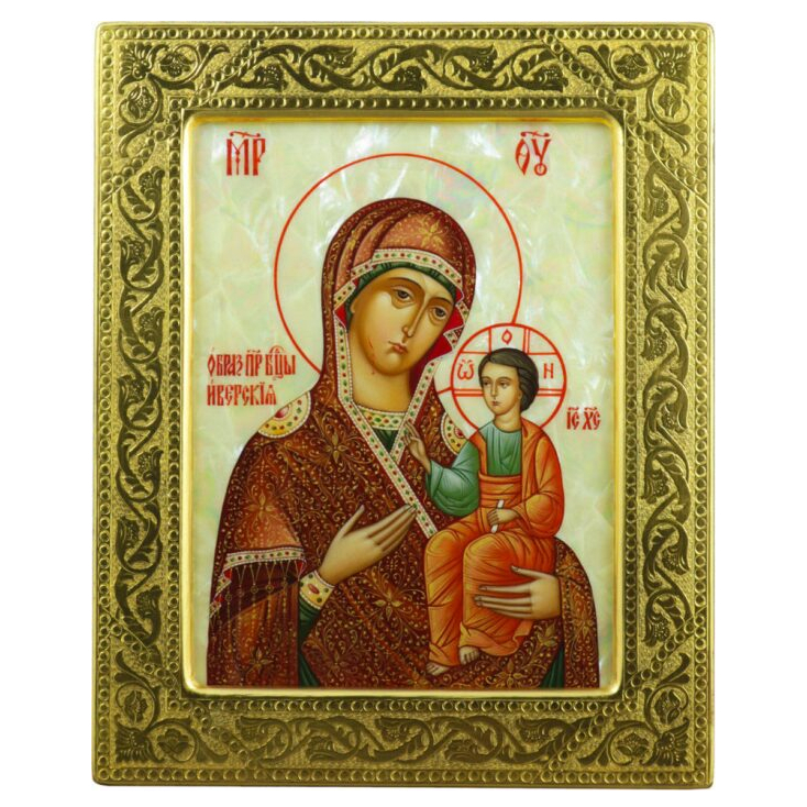 Icon of the Iverian Mother of God on natural mother of pearl in a gold frame