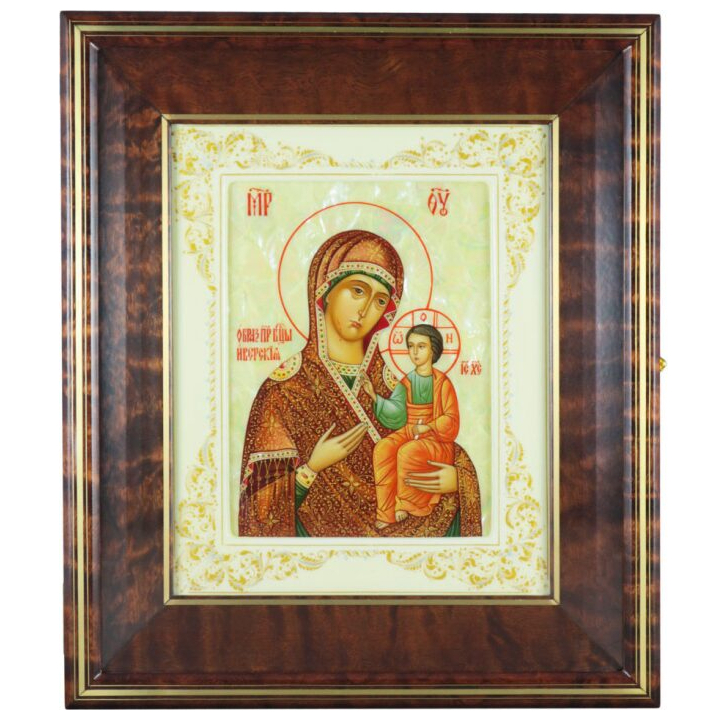 Icon of the Iverian Mother of God in a white frame and a kiosk on natural mother of pearl