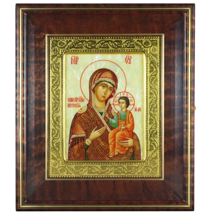 Icon of the Iverian Mother of God in a kiosk and a gold frame on natural mother of pearl