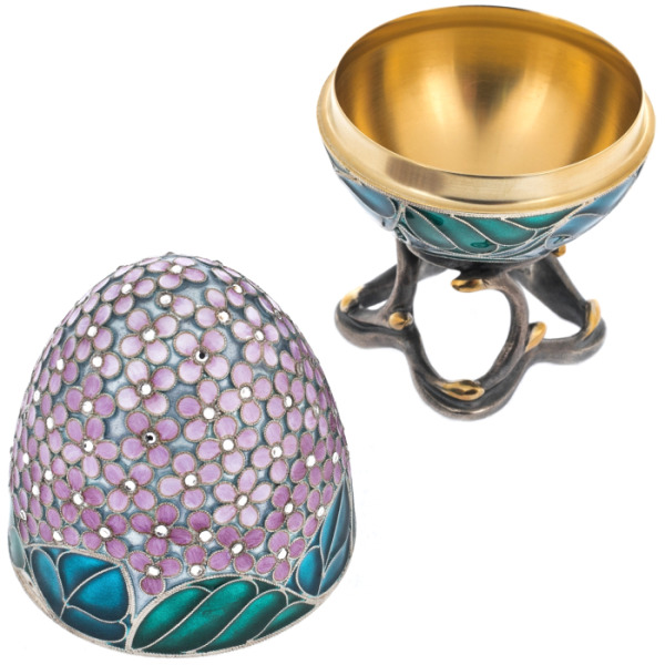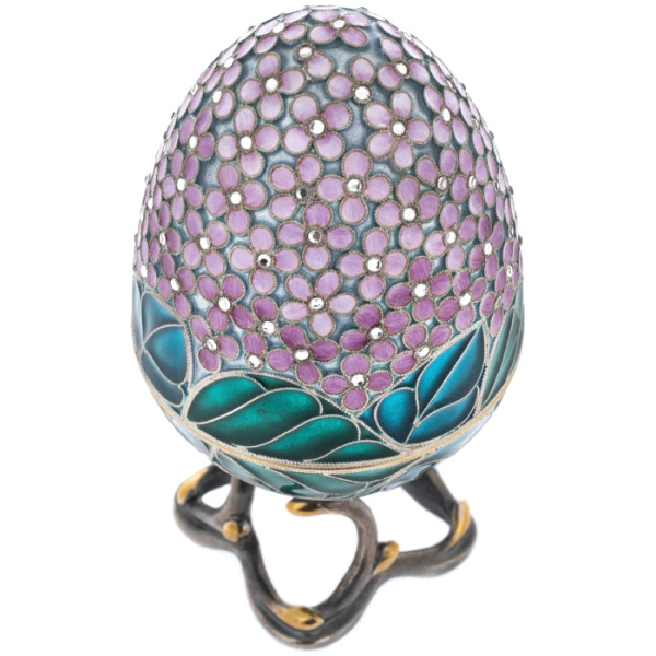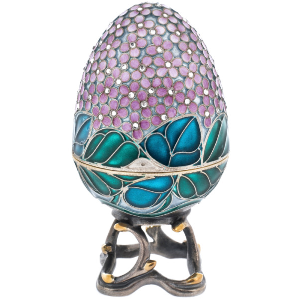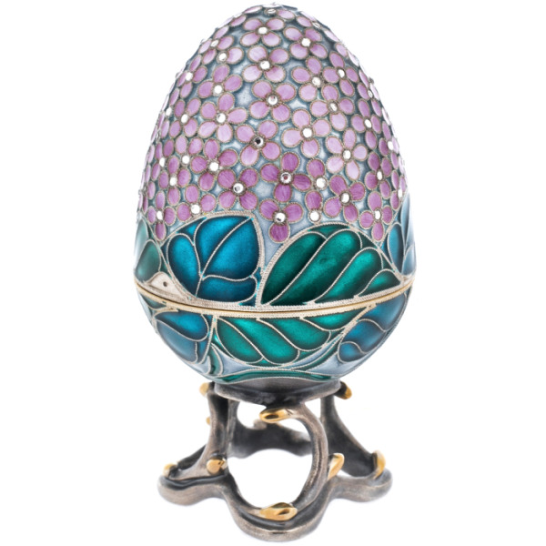 The Purple Lilac Egg box is a piece of jewelry inspired by Faberge's famous Easter eggs. The product is made of 925 sterling silver, decorated with hot enamel of deep purple hue and inlaid with sparkling cubic zirconia. The finest work of the craftsmen is manifested in exquisite patterns and filigree details, creating an impression of lightness and sophistication. The box has a hidden storage space for jewelry or memorabilia, which gives it not only decorative, but also practical value.