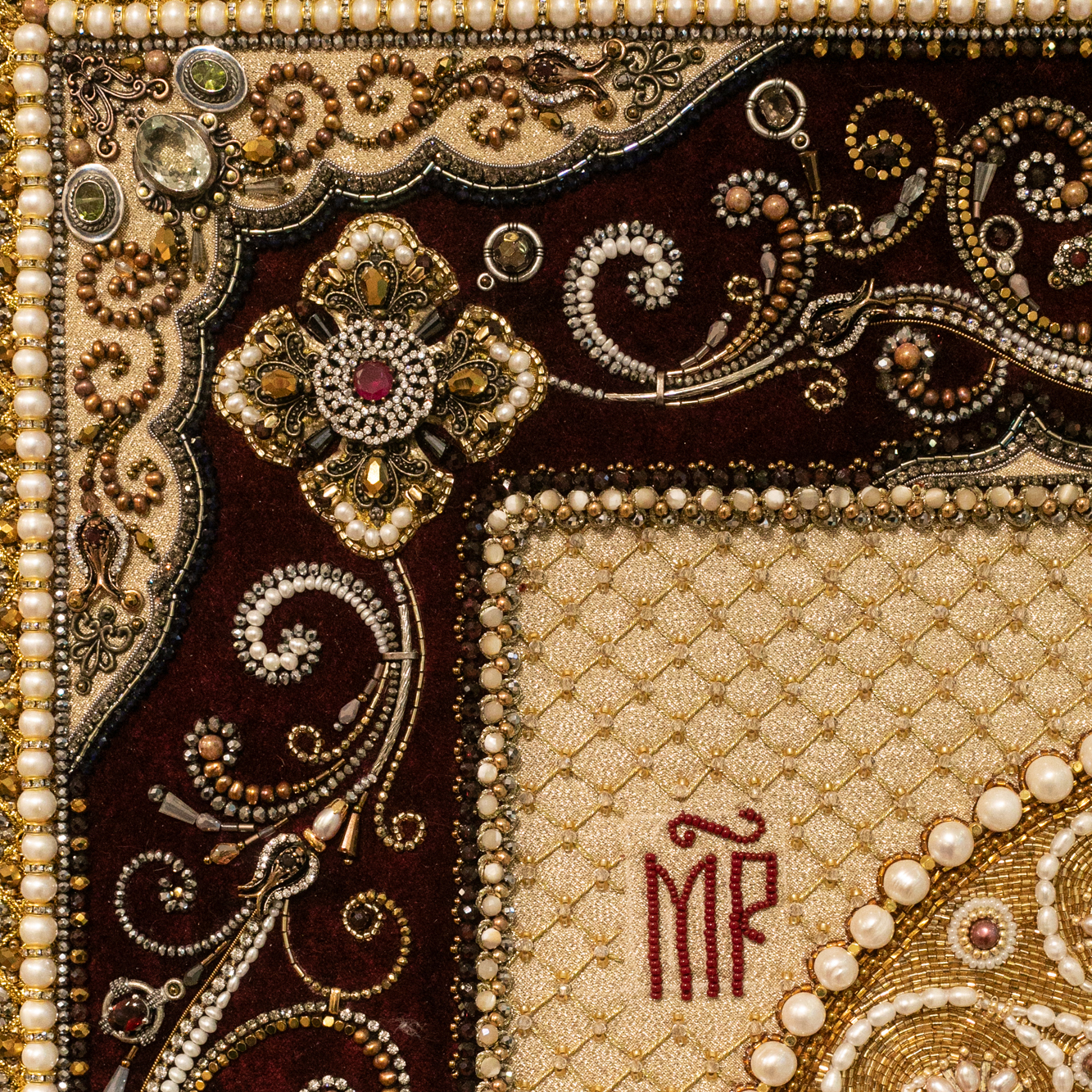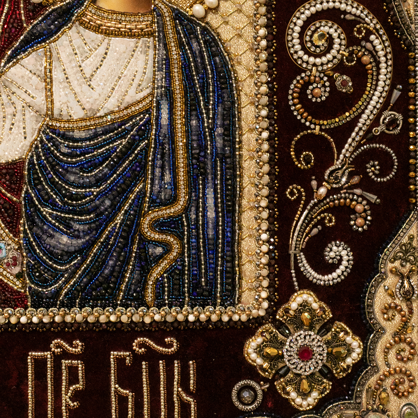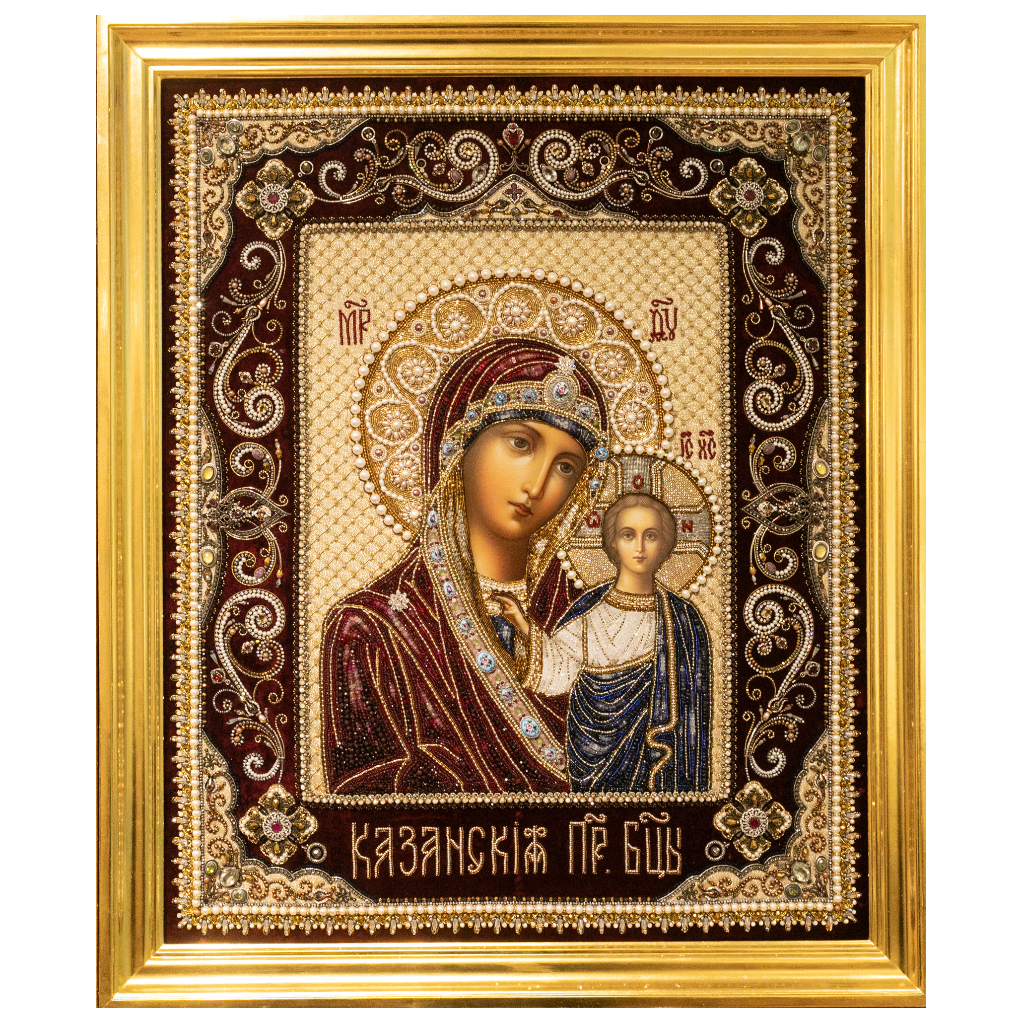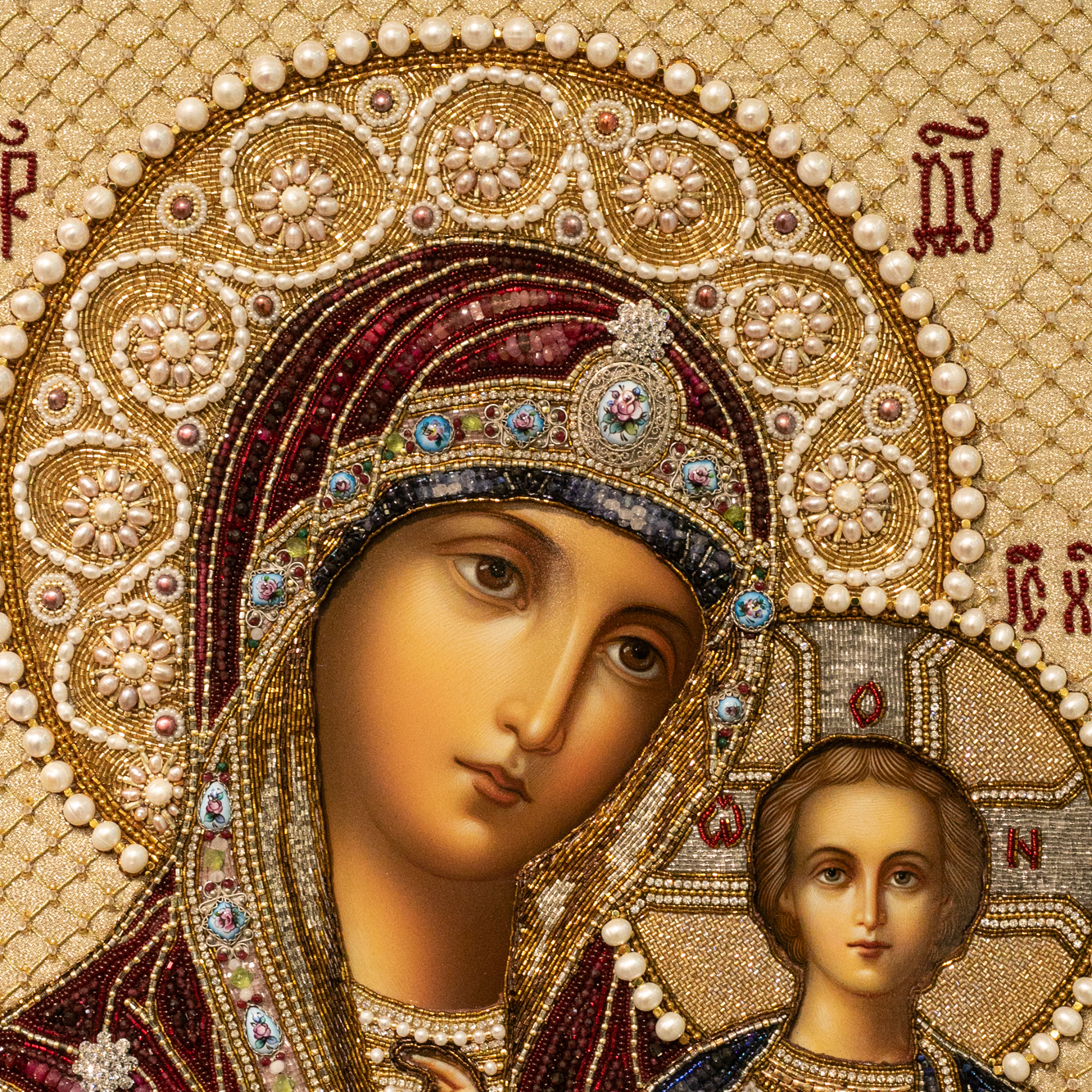 В образе Богоматери Казанской соединяются земная нежность и божественная сила, воплощенные в искусстве, достигшем совершенства. Этот лик, сотканный из золота, драгоценных камней и бисера, словно оживает в сиянии рамы, подчеркивающей благоговейную торжественность иконы. Каждая деталь вышивки, созданная руками мастеров XIX века, являет собой гимн вере и надежде.
