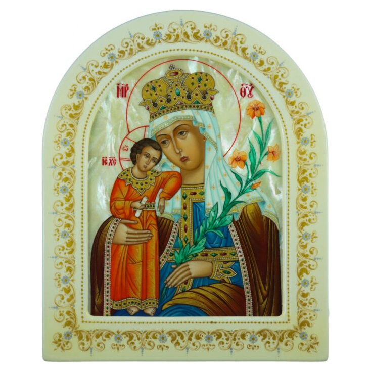 Icon "Our Lady of Unfading Color" with mother of pearl in a white frame (arch)