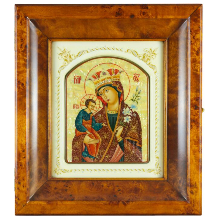 Icon in a white frame and a kiosk "Our Lady of Unfading Color" on natural mother of pearl