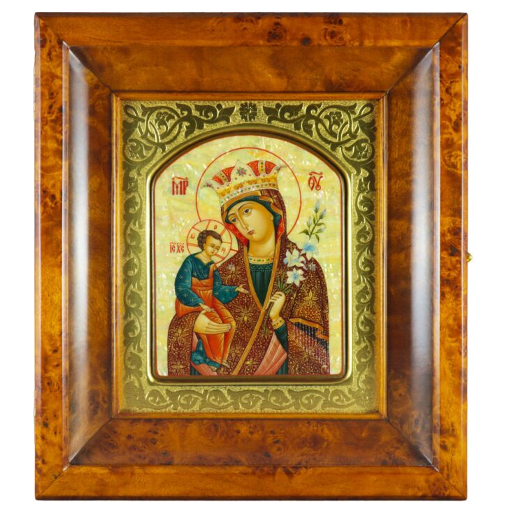 Icon in a gold frame and a kiosk "Our Lady of Unfading Color" on natural mother of pearl