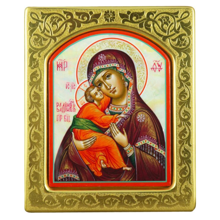 Mother-of-pearl icon "Our Lady of Vladimir" in a gold frame with embossing