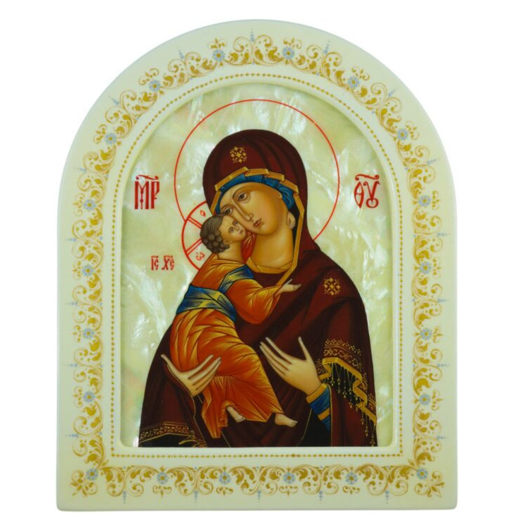 Icon of the Mother of Vladimir with mother of pearl in a white frame (arch)