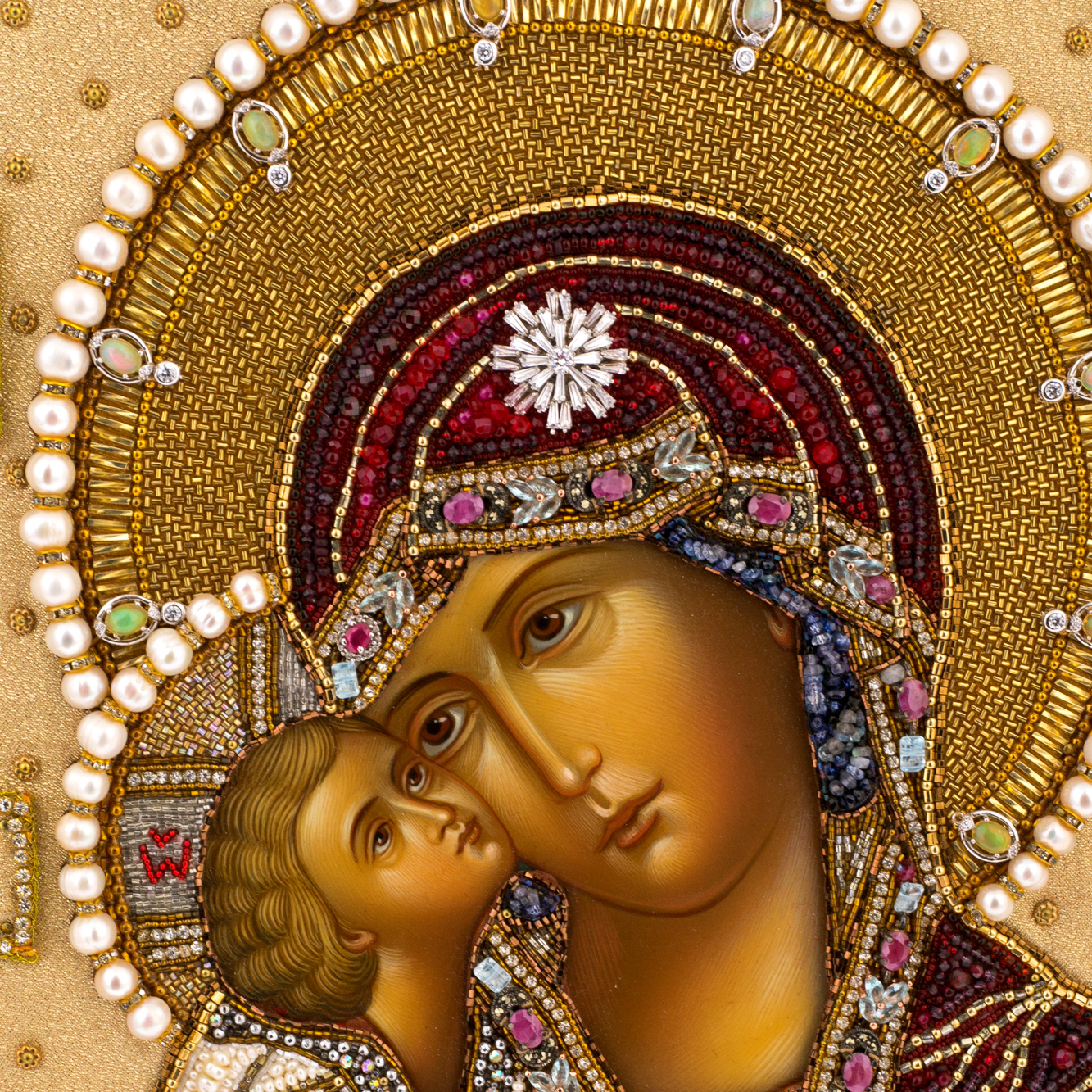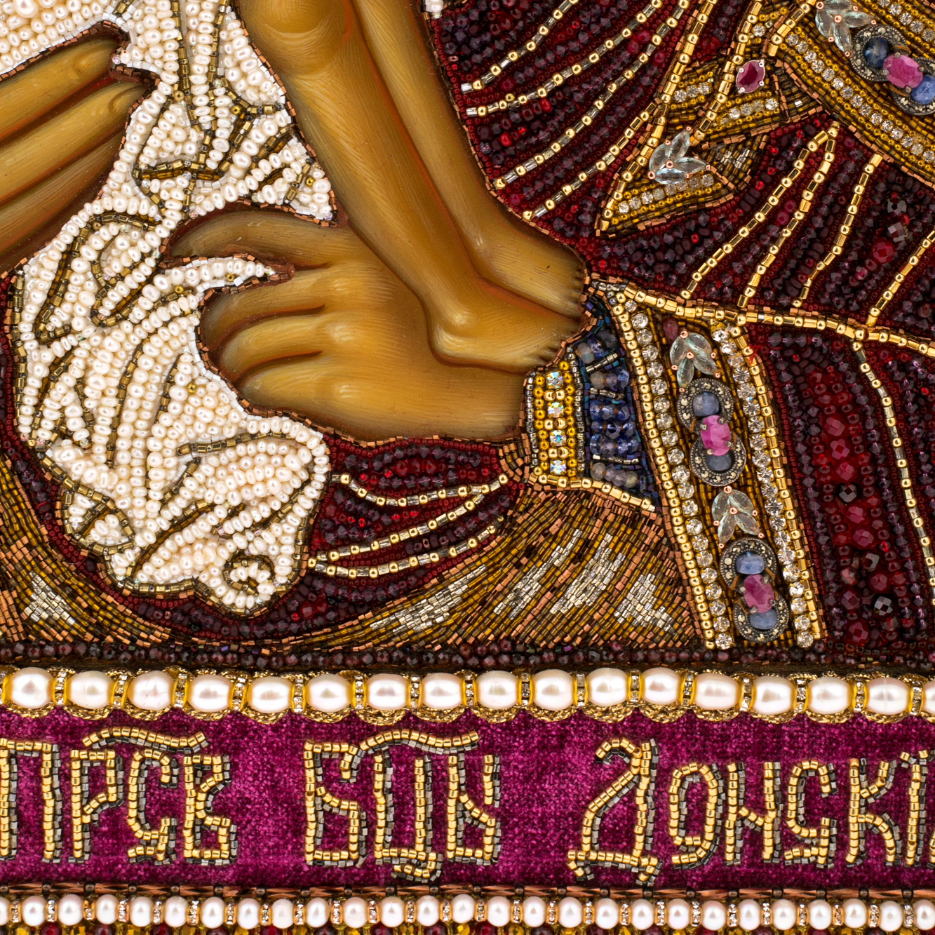 Hand embroidery, made in a mosaic facial technique, combines rubies, sapphires, amethysts, garnets and other precious stones, creating a play of light and shadow that enlivens the image. The golden thread, intertwined with velvet and linen elements, adds depth and nobility to the composition, emphasizing the solemnity of the scene. The halo, studded with pearls and crystal, resembles the light of heavenly glory, and the rich ornamental background tells about the great tradition of icon painting.
