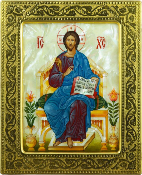 The icon of the Savior on the Throne on natural mother-of-pearl in a gold frame