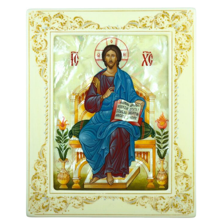 Icon of the Savior on the Throne with mother of pearl in a white frame
