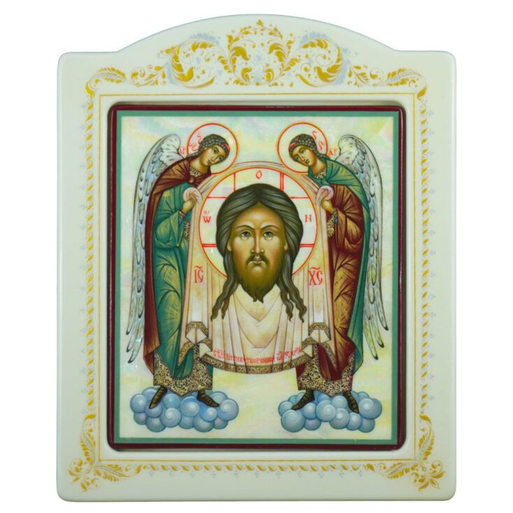 Icon with mother-of-pearl "Saved by Man-made" in a frame with an ornament