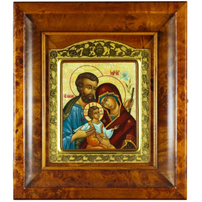 Icon of the Holy Family in a gold frame and a kiosk on natural mother-of-pearl