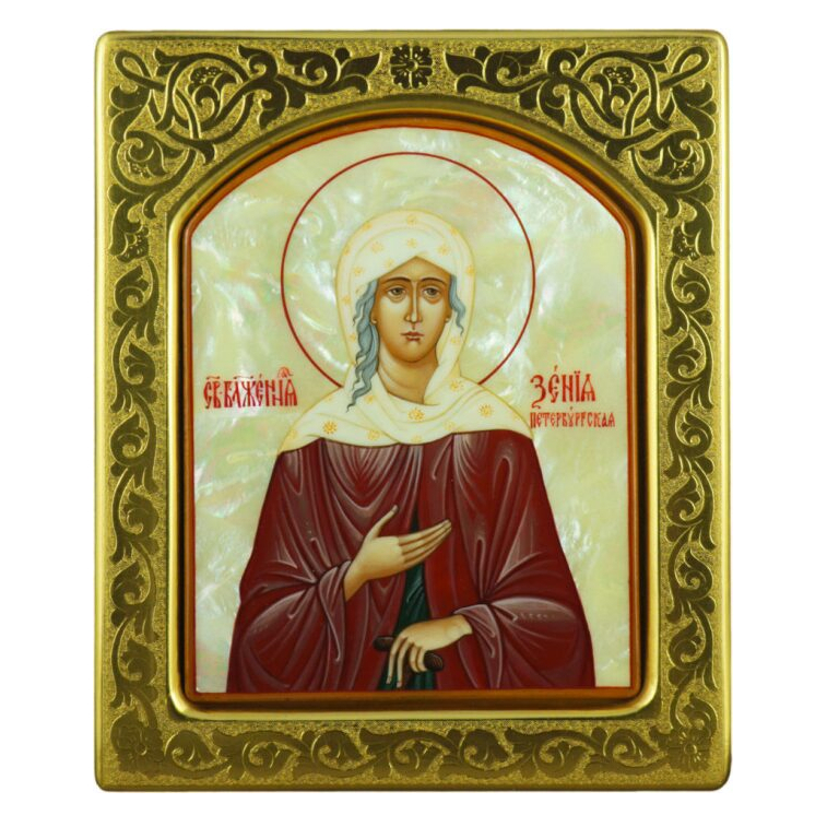 The icon with mother-of-pearl "Xenia of St. Petersburg" in a gold frame with embossing