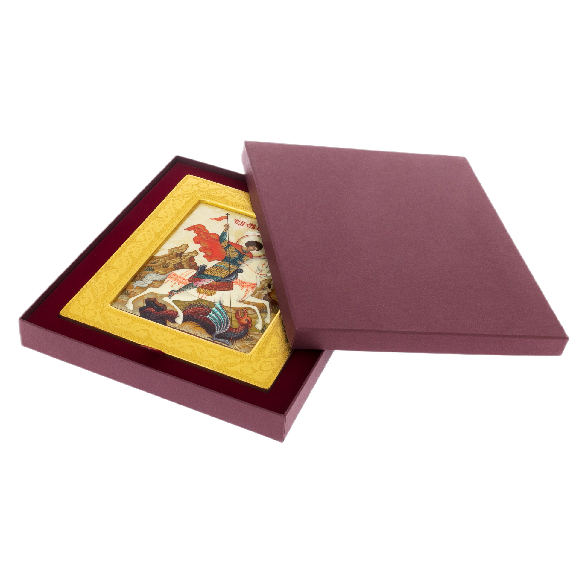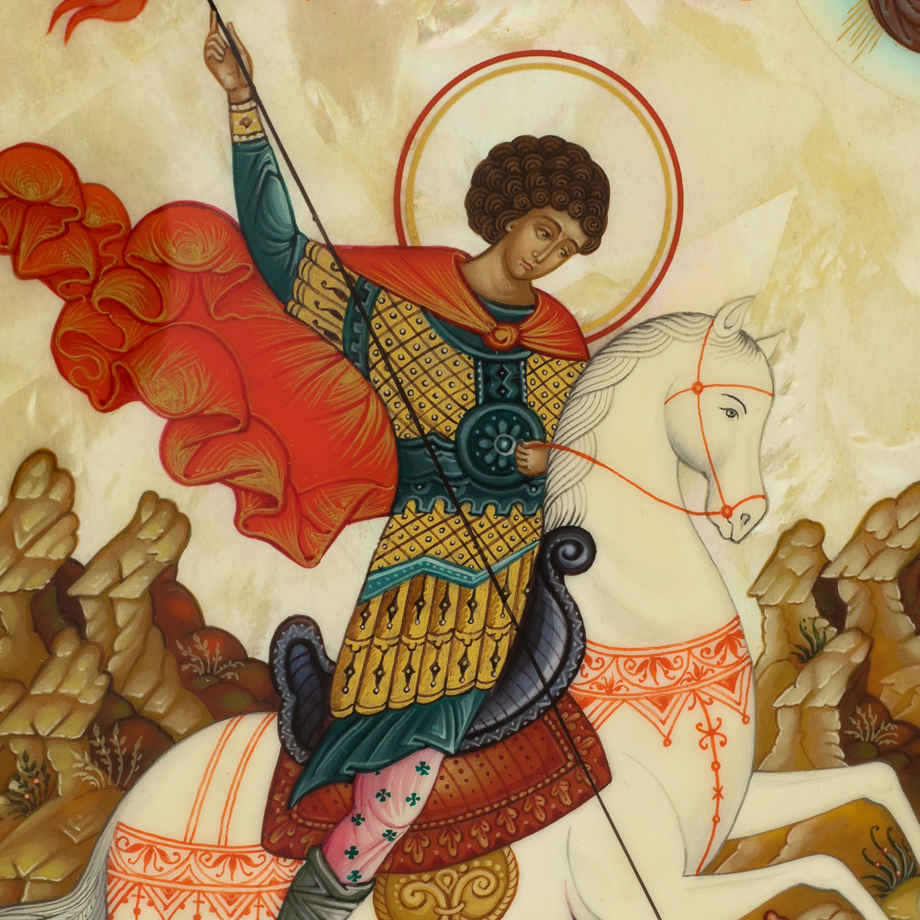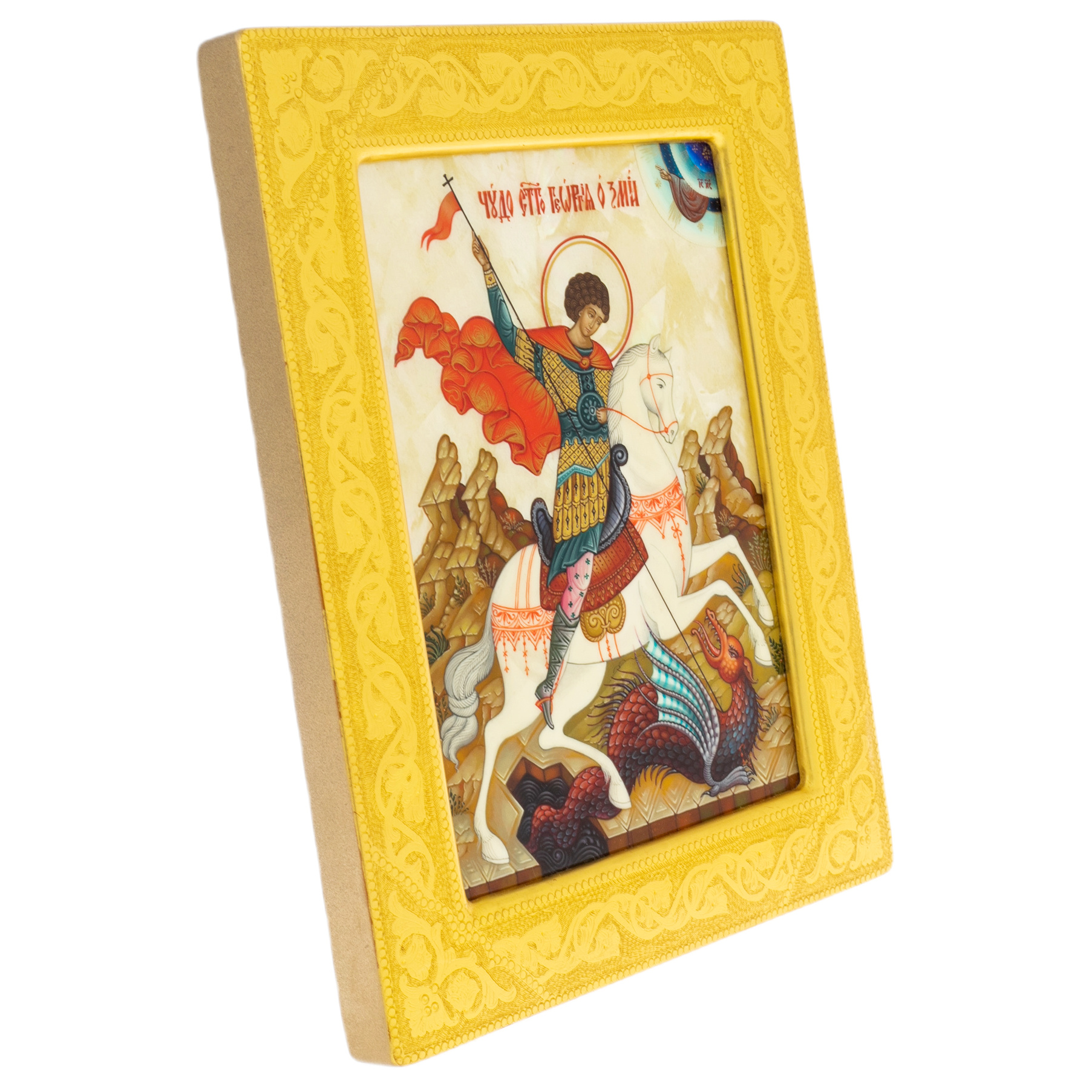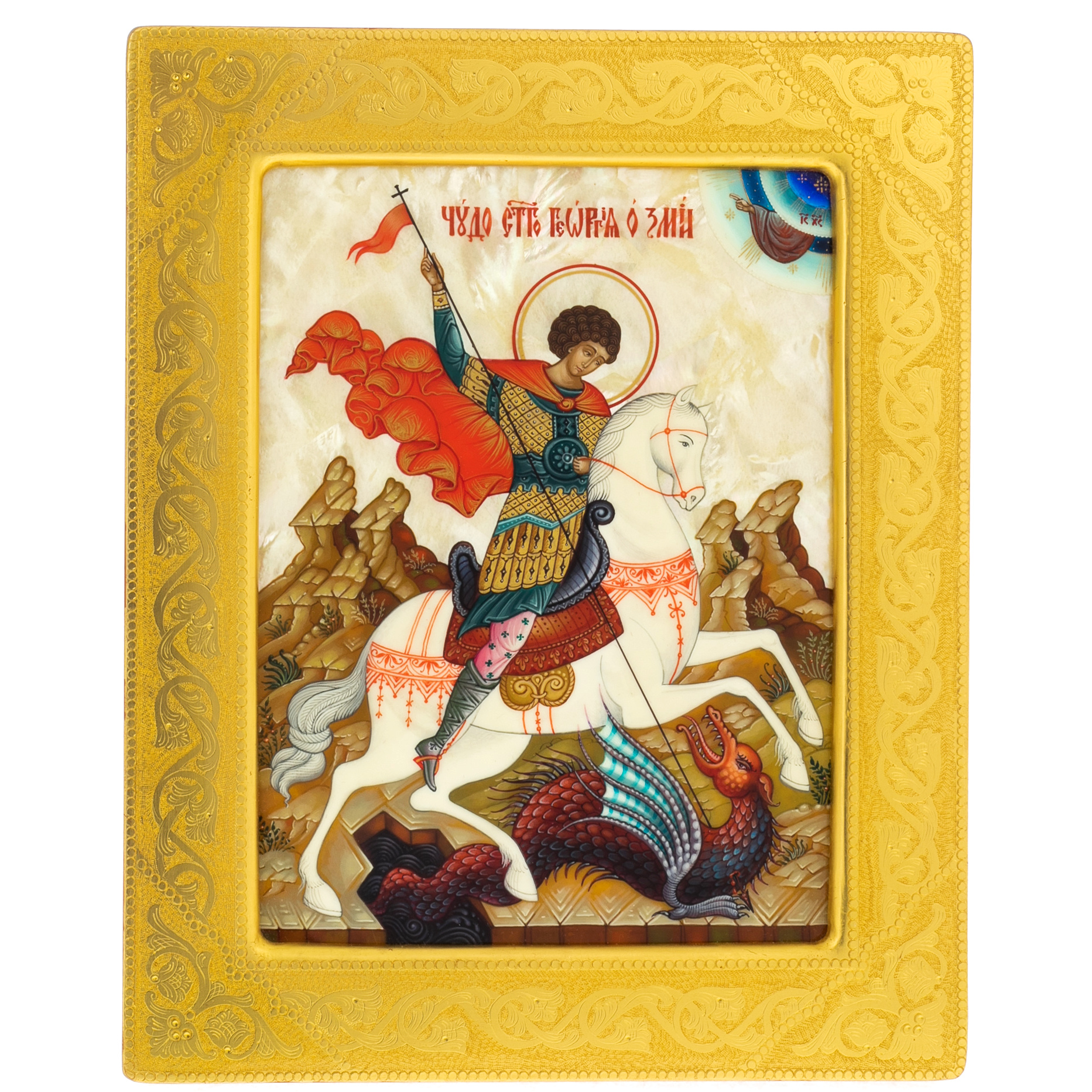The icon of St. George the Victorious on natural mother-of-pearl in a gold frame