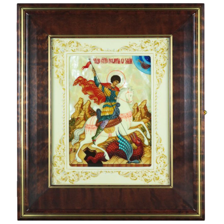 The icon of St. George the Victorious in a white frame and a kiosk on natural mother-of-pearl