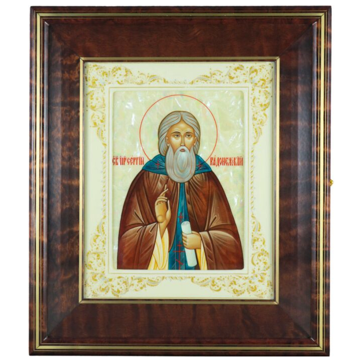 The icon "Sergius of Radonezh" in a white frame and a kiosk on natural mother-of-pearl