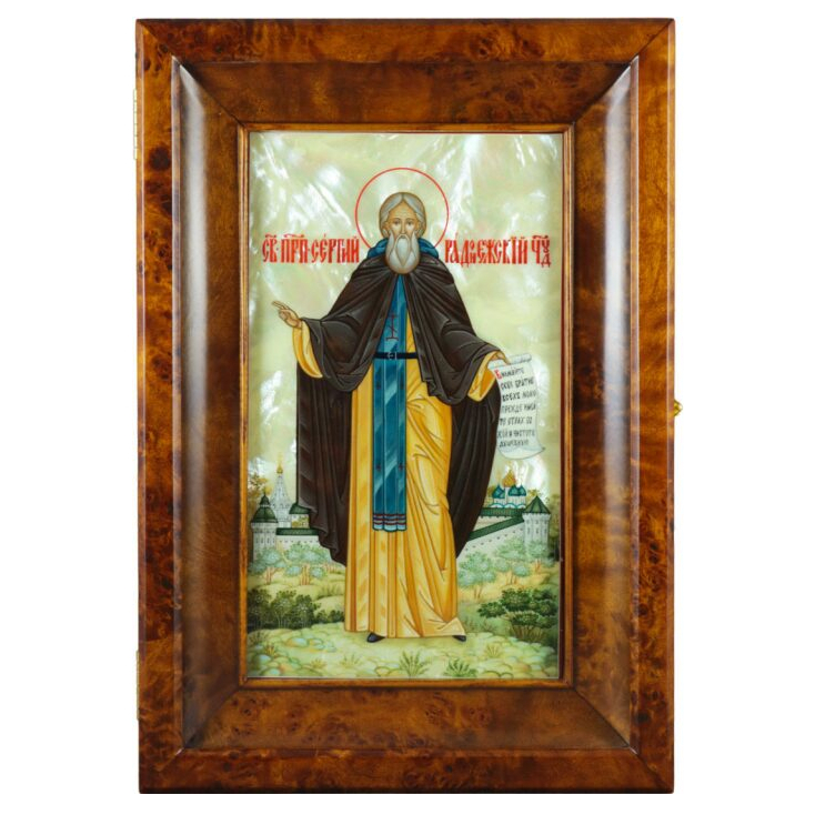Icon in the Sergius of Radonezh kiosk on natural mother-of-pearl