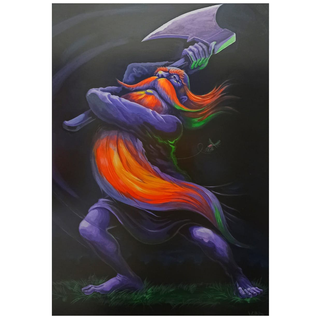 The author's painting "With an axe for a mosquito" is an ironic hymn to power and absurdity, in which the artist humorously depicts an epic scene played out in the silence of the night. A huge figure of a bearded hero with fluttering fiery hair, tightly clutching a massive axe, rushes to hunt for a tiny mosquito. The contrast between the hero's strength and his seemingly insignificant goal gives the painting a special charm and hidden meaning.