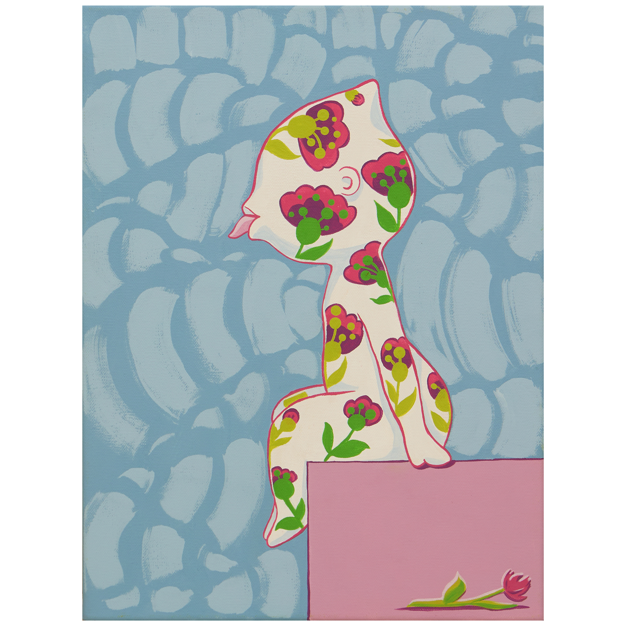 Фантазийная картина с героем Sinkini словно создана из нежных грёз и цветущих воспоминаний. Персонаж представлен на фоне светлого голубого неба, покрытого мягким абстрактным узором, как будто сотканным из лёгких облаков. Его тело украшено розовыми цветами с зелёными листьями, напоминающими старинный народный орнамент, придающий образу тепло, искренность и трогательную наивность. Он сидит на розовой плоскости, где нарисован одинокий бутон — символ надежды и будущего расцвета.