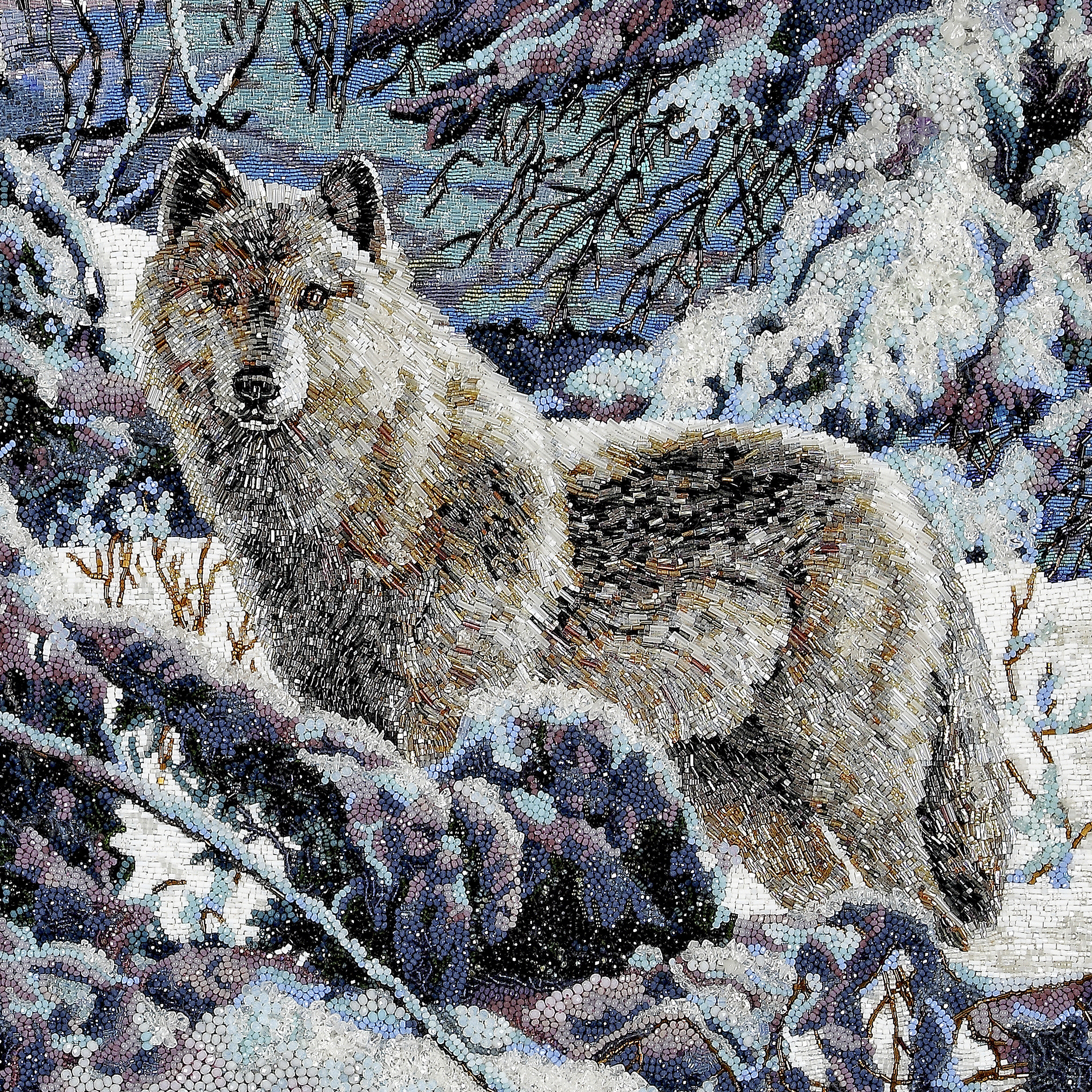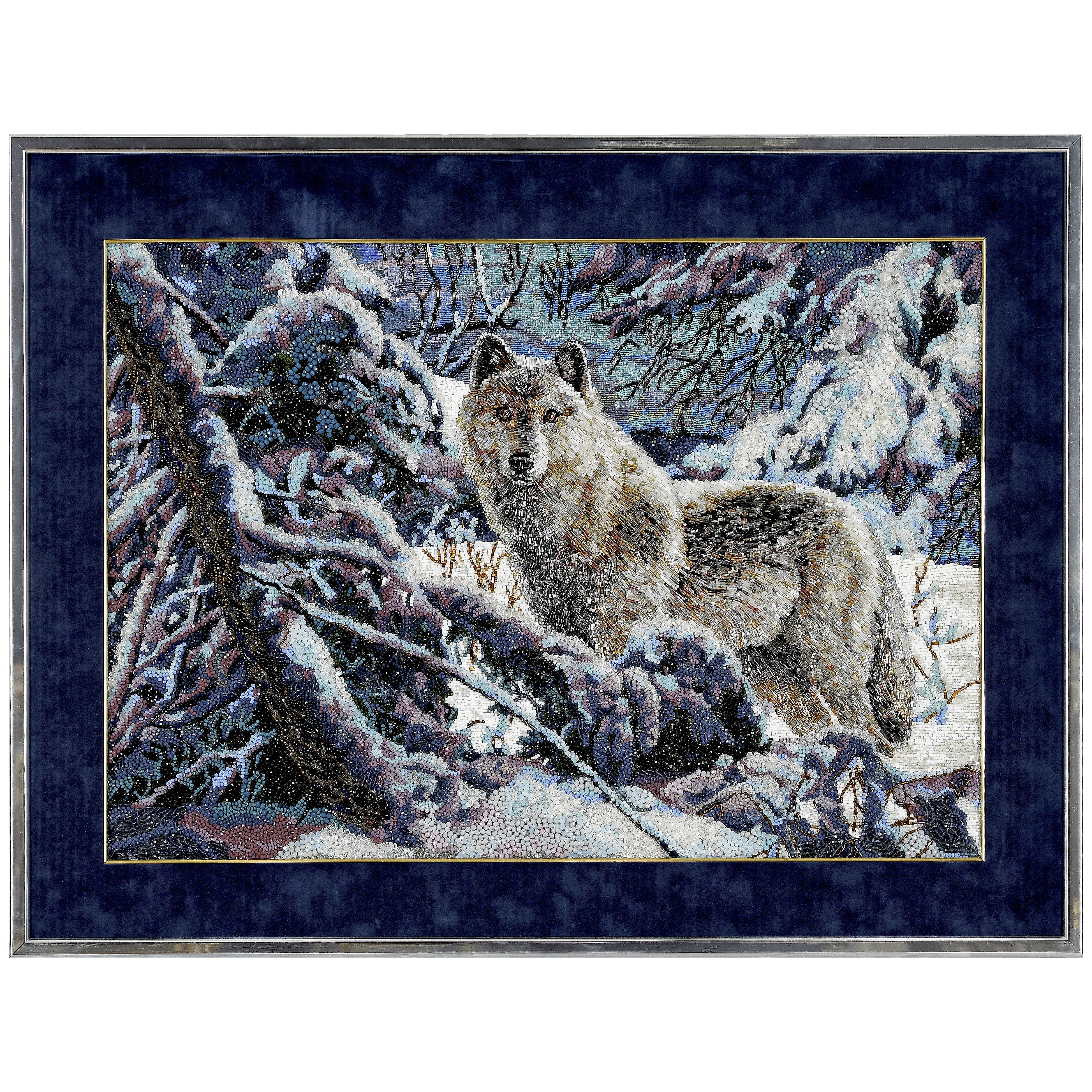 Decorative embroidered panel made of precious stones "Wolf in the winter forest" in a metal frame