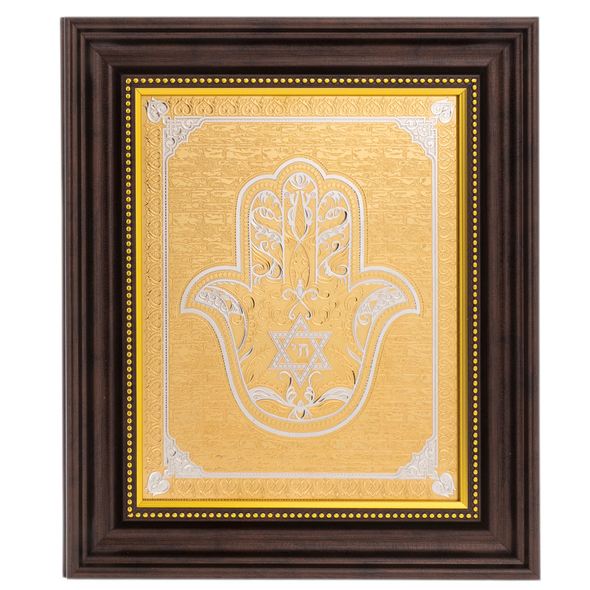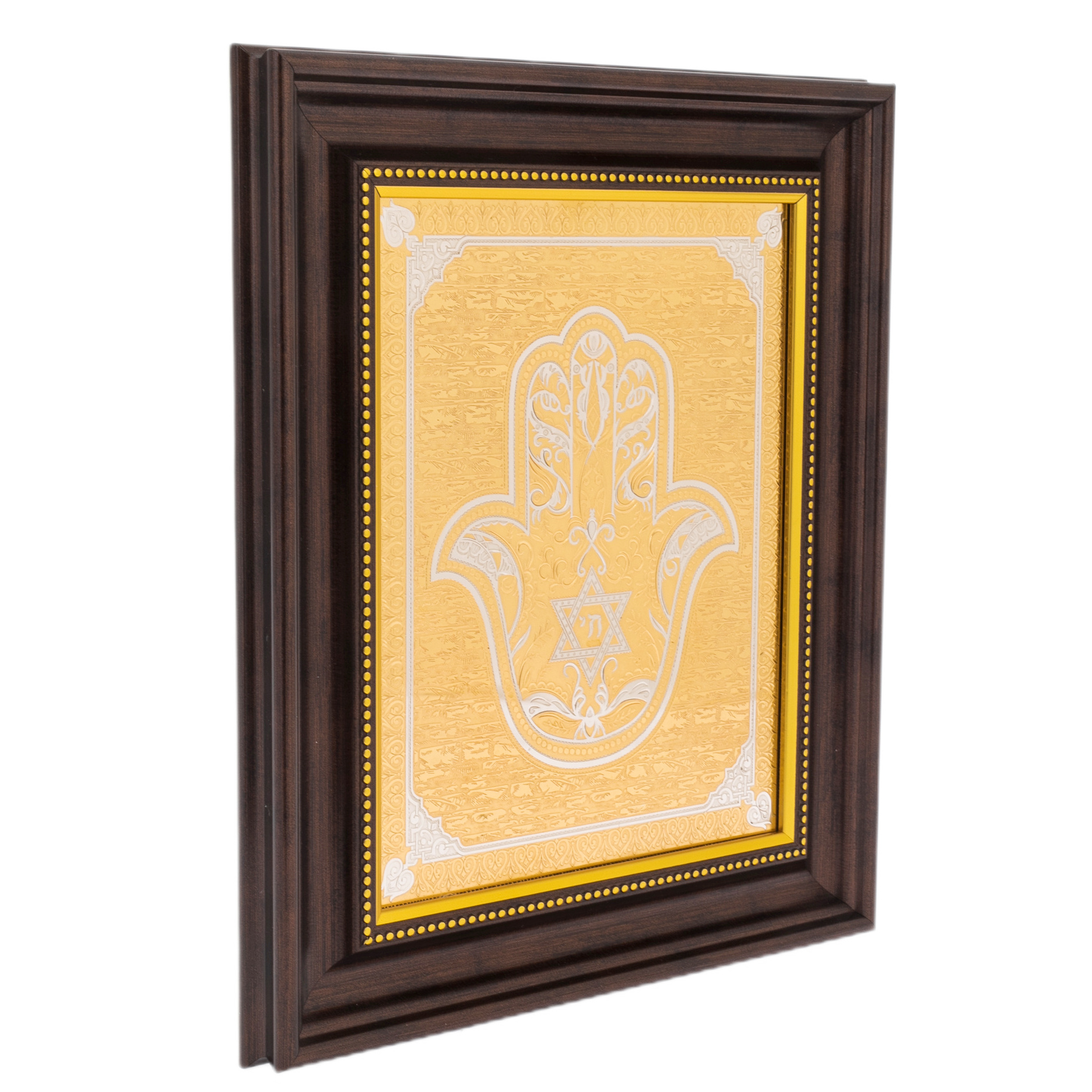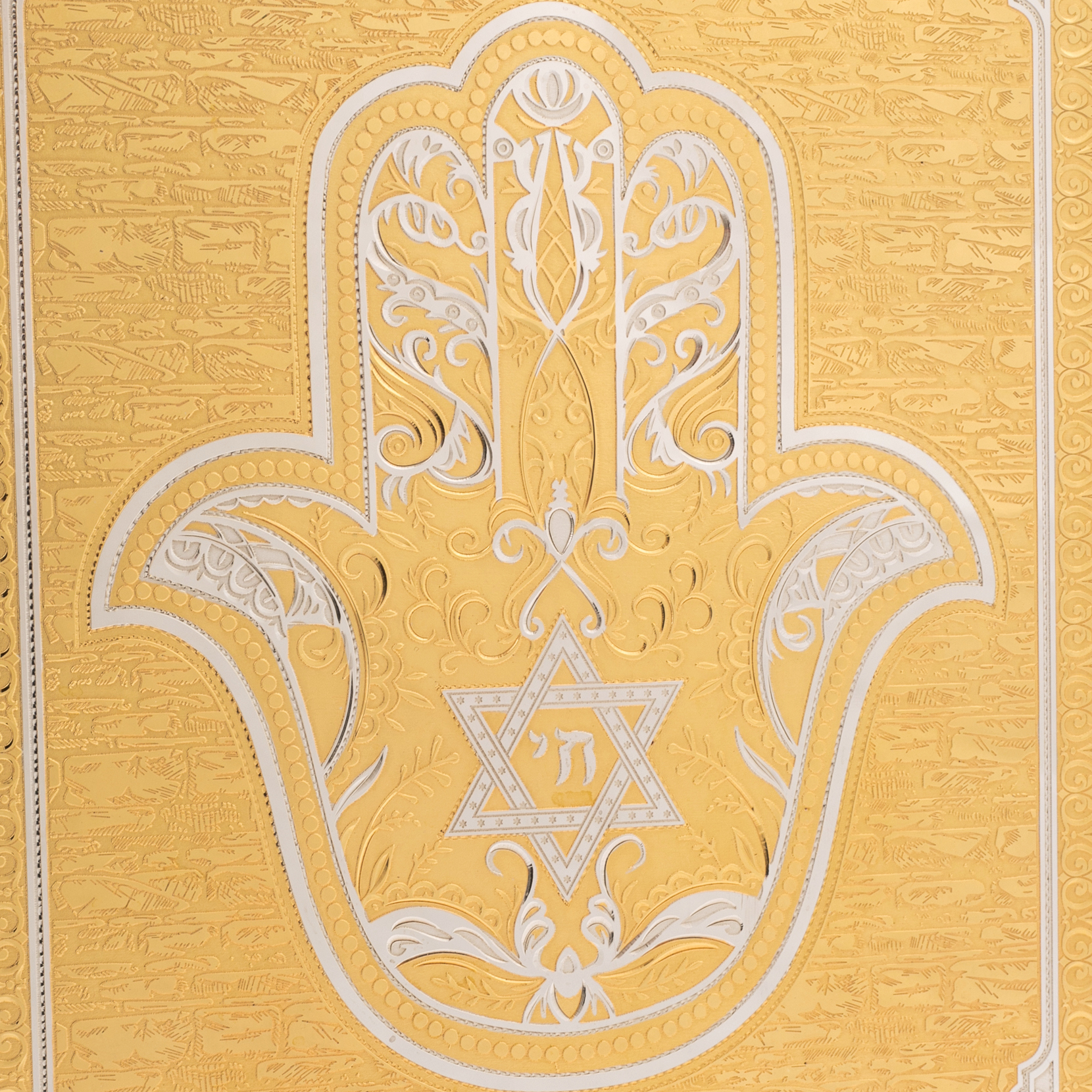 The central image is Fatima's hand, a centuries—old symbol of protection, strength and well-being, embodied in the refined lines of gold and silver engraving. Its outlines seem to glow, reflecting the warmth of precious metals, and the graceful floral motifs inside the palm create the illusion of a revived nature. In the center of the composition is a star of David with the Hebrew symbol “Hai”, which represents life, harmony and the pursuit of eternity. The lines and details are striking with precision, as if the hand itself was created not by tools, but by rays of light.