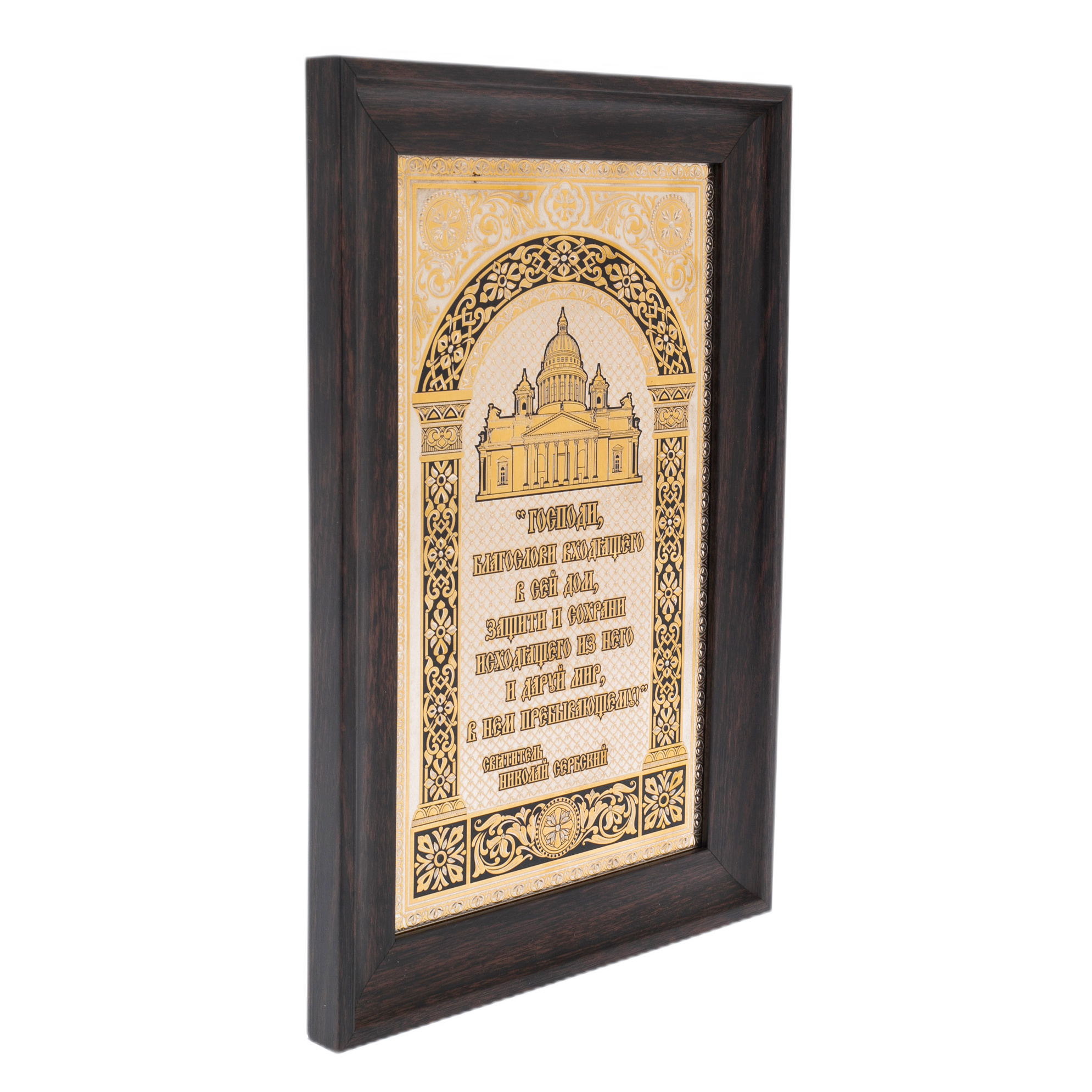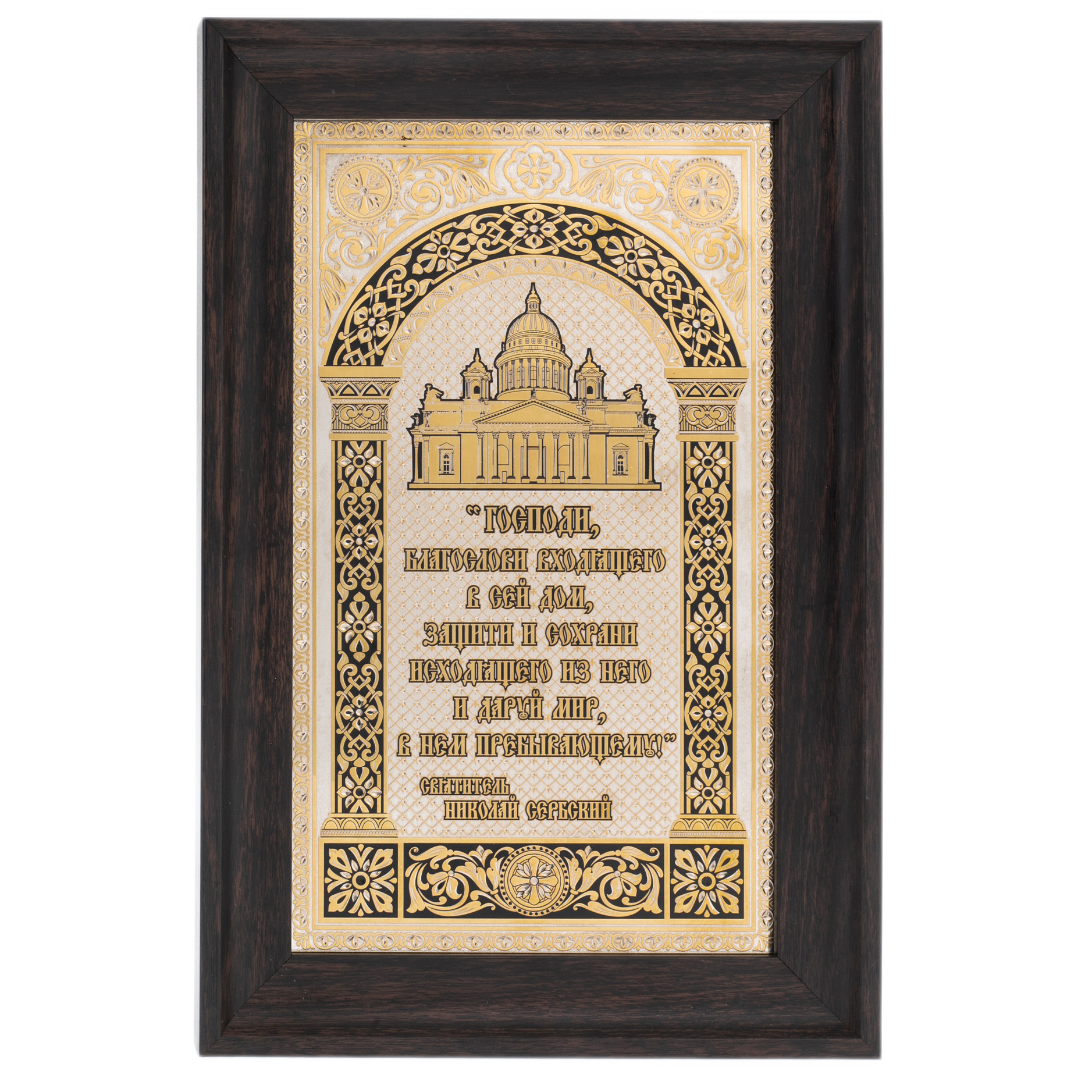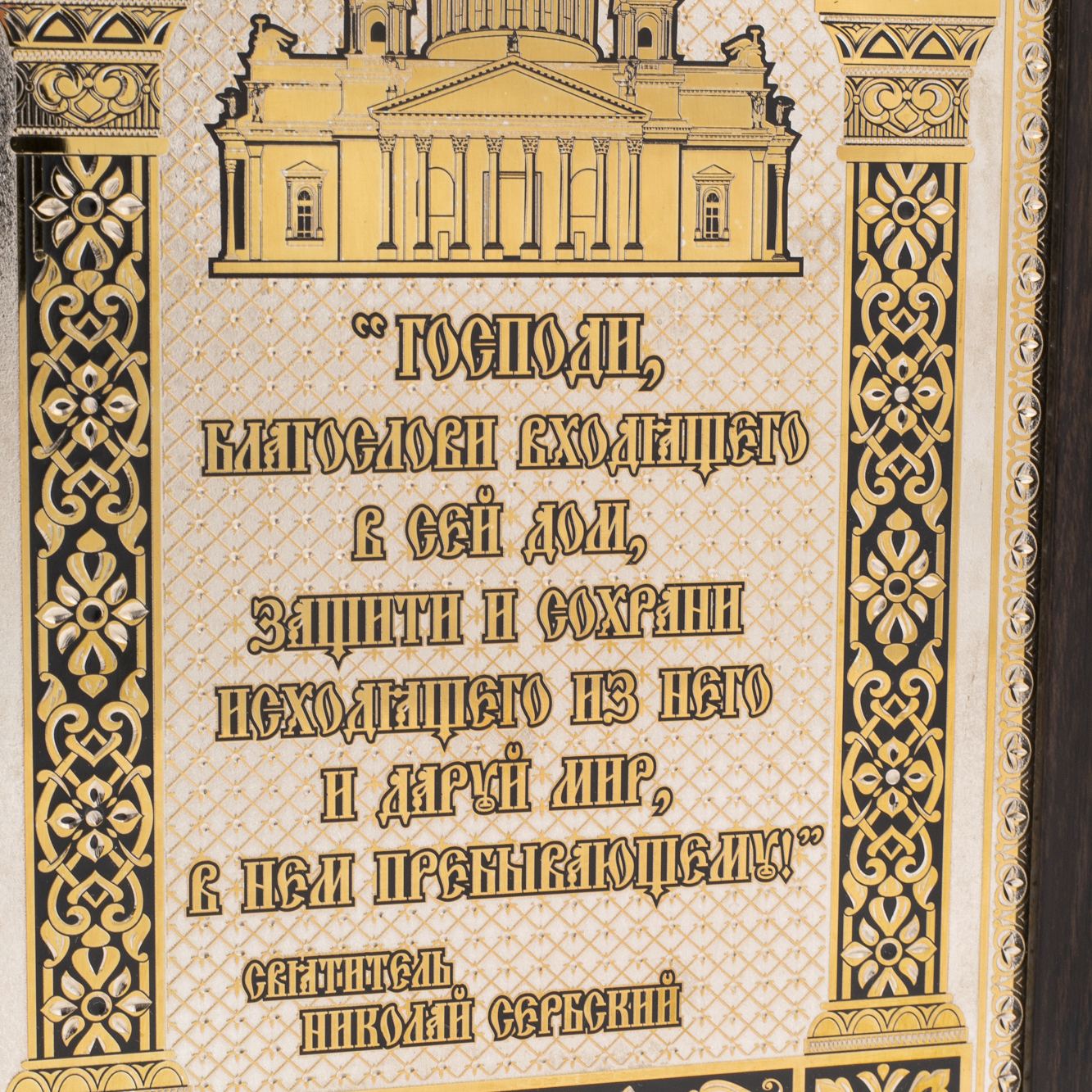 Панно-обегрег "В дом входящих" — это не просто декоративный элемент, а молитвенное напутствие, обращённое к каждому, кто переступает порог дома. В центре композиции — храм, венчающий арочную конструкцию, обрамлённую орнаментами в духе византийской геральдики. Под архитектурным силуэтом высечены слова святителя Николая Сербского, обращённые к Господу с просьбой благословить входящих, защитить, сохранить и даровать мир. Шрифт исполнен с канонической строгостью и подчёркнут позолоченной вязью, обрамлённой тонкими геометрическими плетениями. Глубокий чёрный фон рамки из благородного дерева оттеняет сияние металла, усиливая восприятие образа как оберега.