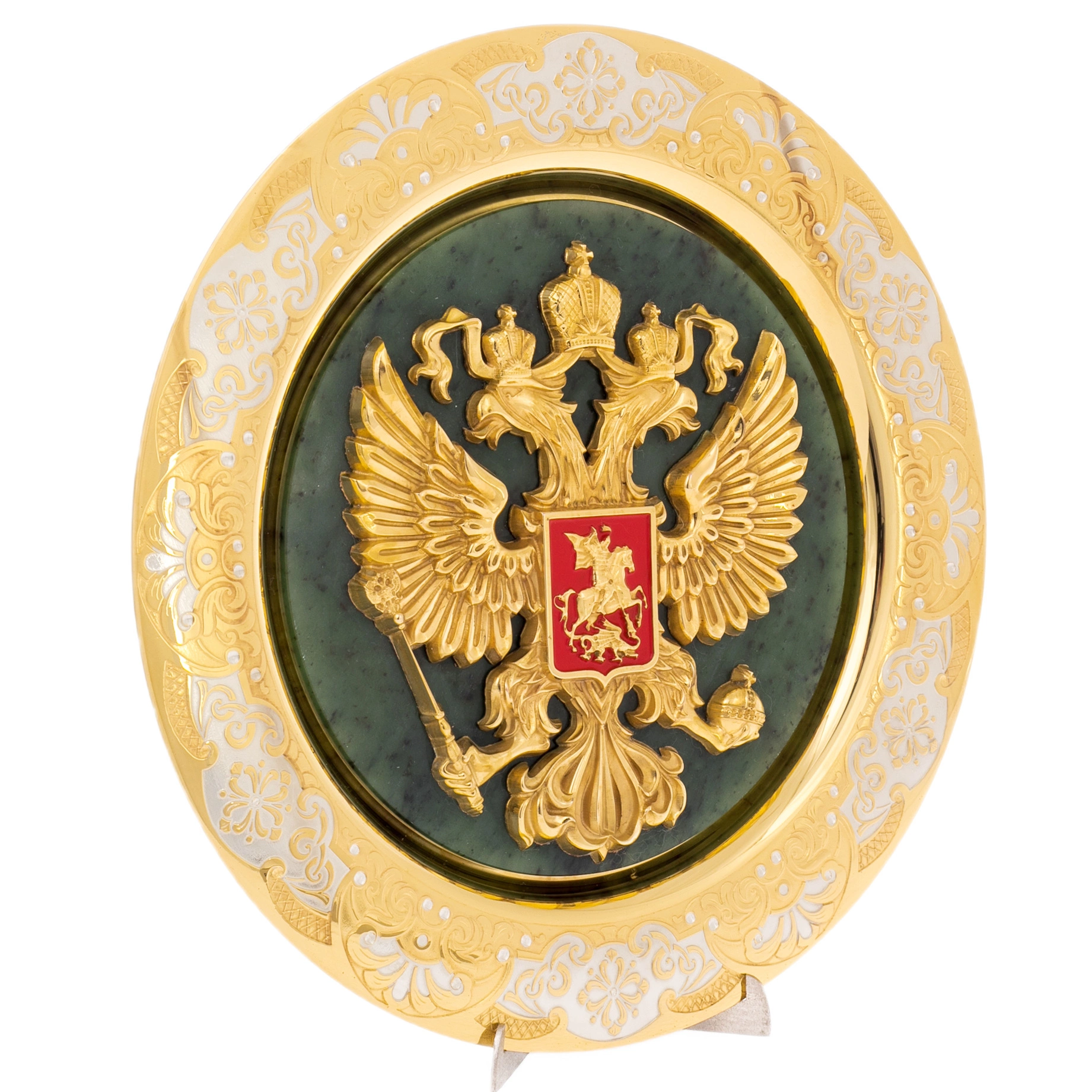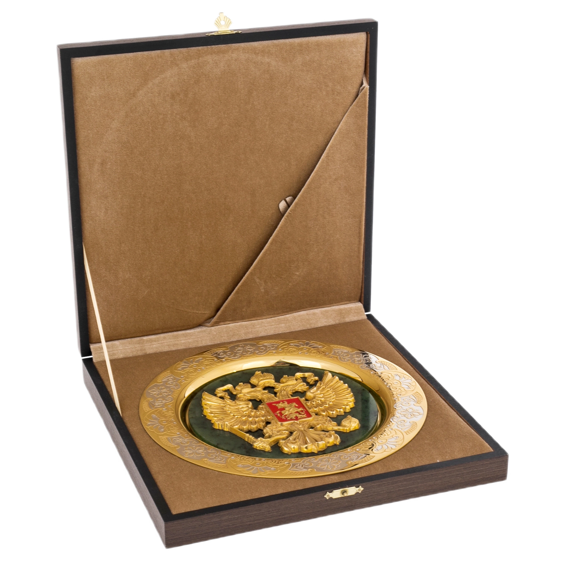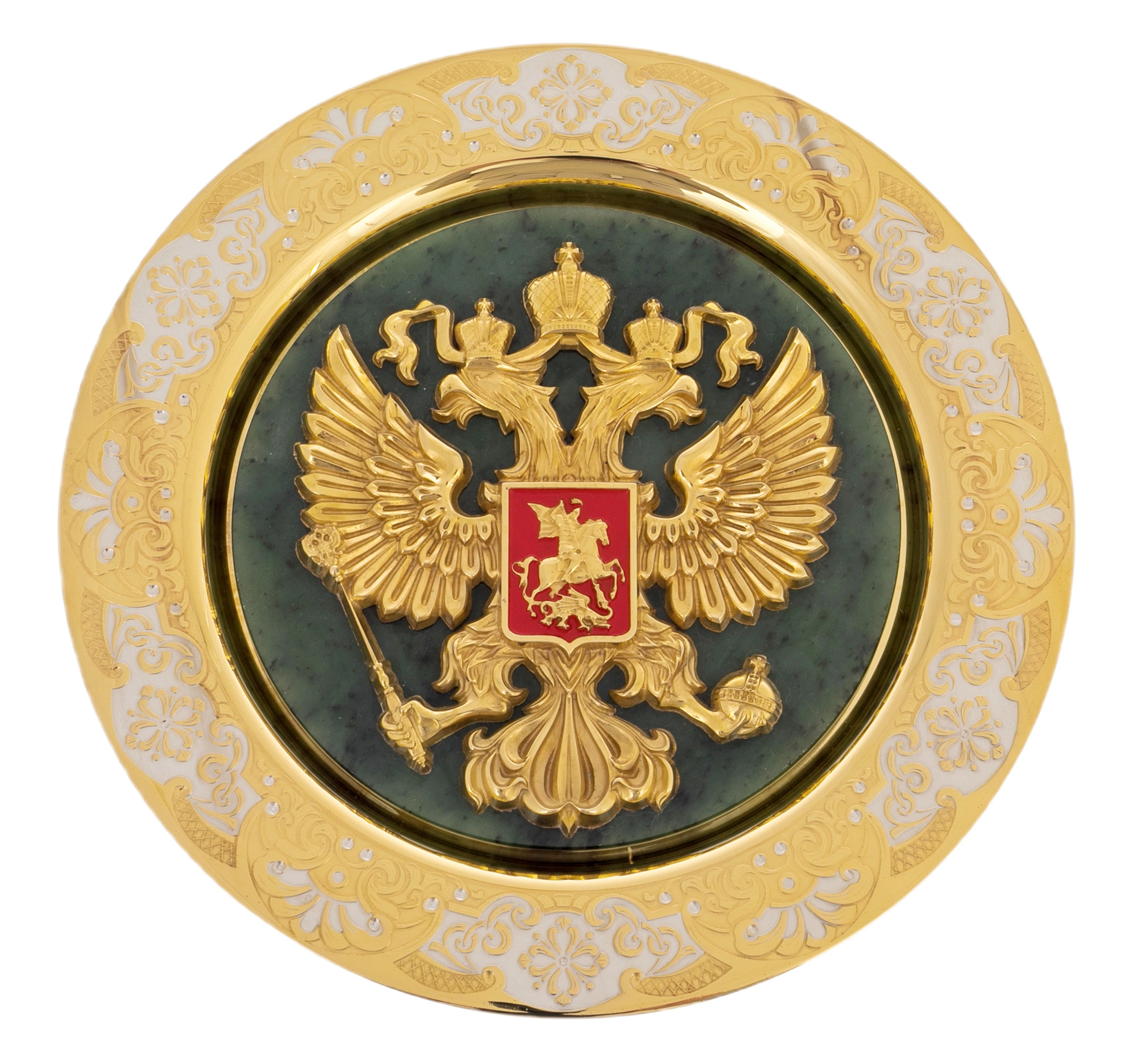 Декоративная тарель на нефрите «Герб РФ», выполненная мастерами Златоуста, — представительское изделие, сочетающее государственную символику и традиции художественной обработки металла. В центре композиции размещён объёмный рельеф двуглавого орла с регалиями, покрытый золочением, на фоне благородного зелёного нефрита. Контраст тёплого блеска металла и глубокого каменного оттенка создаёт выразительный и торжественный образ, рассчитанный на официальный интерьер.