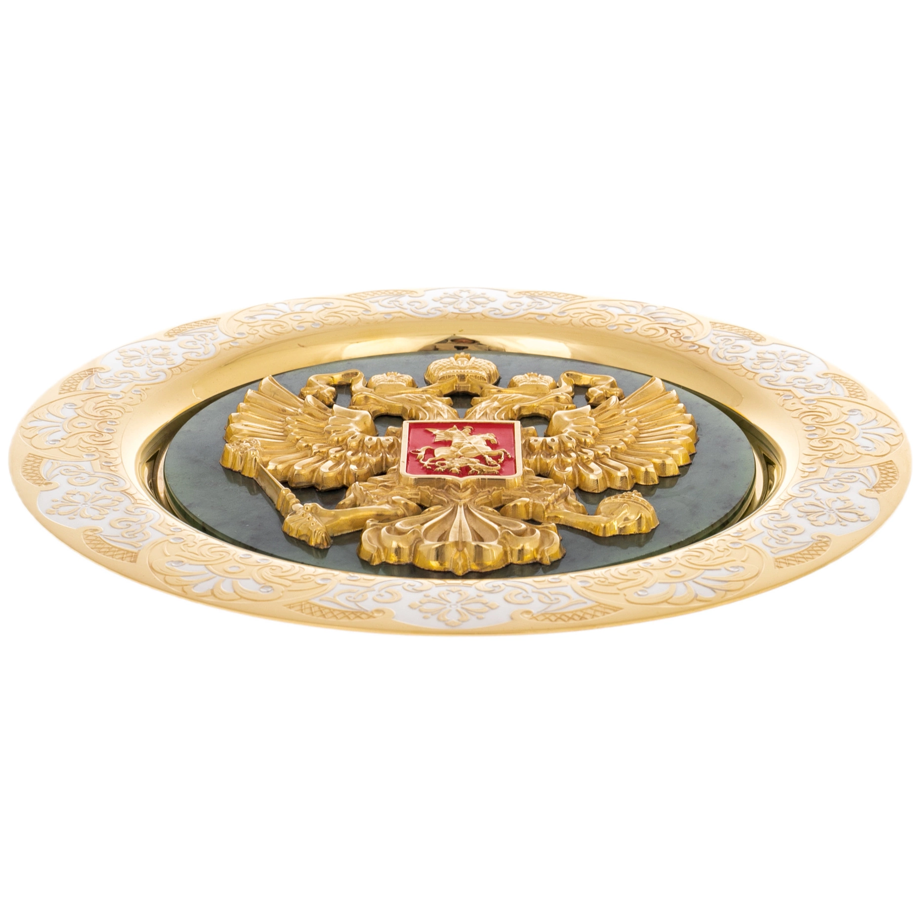 Герб проработан с высокой детализацией: чётко выделены перья крыльев, короны, скипетр и держава, а центральный щит с изображением святого Георгия выполнен в насыщенном красном цвете, усиливающем композиционный акцент. По периметру тарели расположена орнаментальная рамка с растительными мотивами, выполненная в технике гравировки и золочения. Чередование матовых и полированных участков усиливает игру света, подчёркивая глубину рельефа и сложность рисунка.