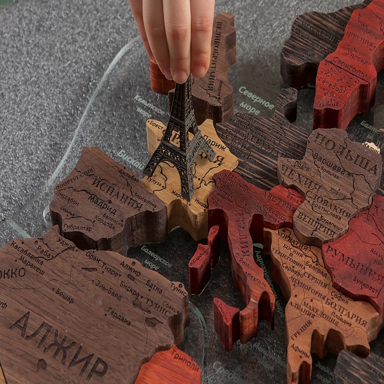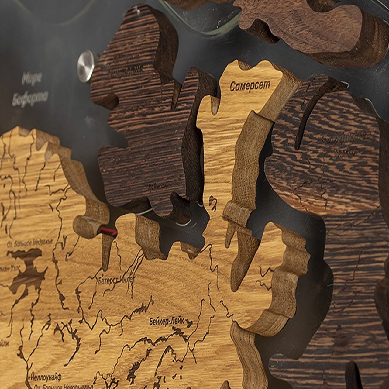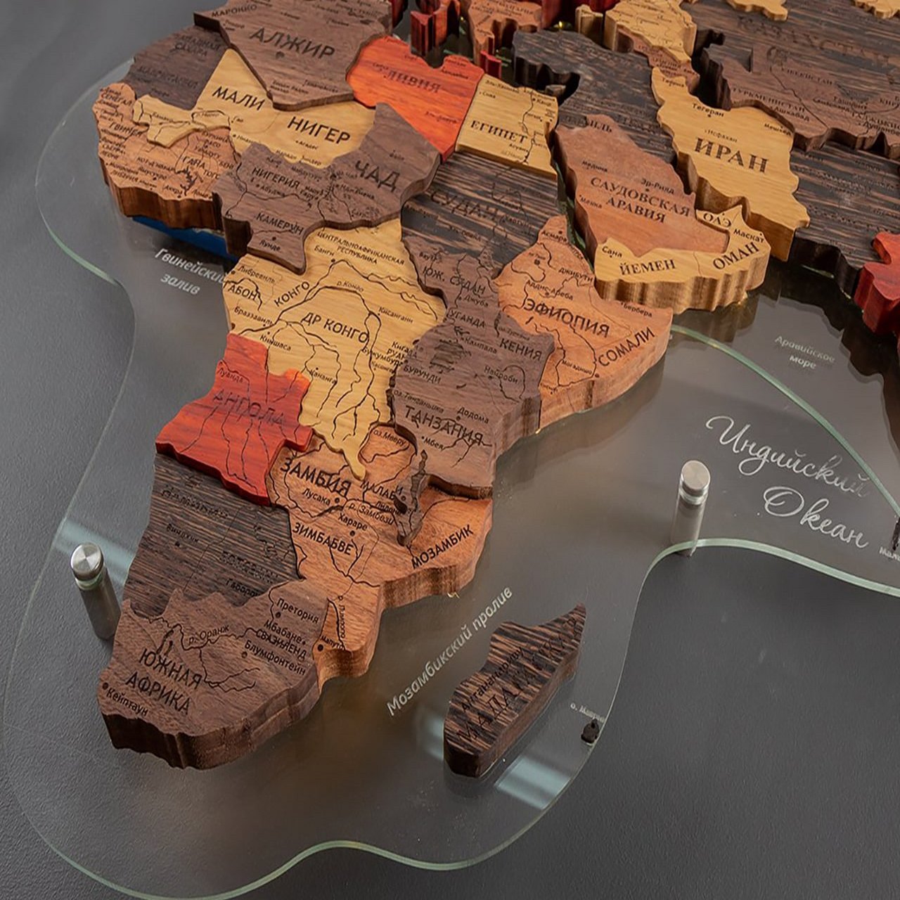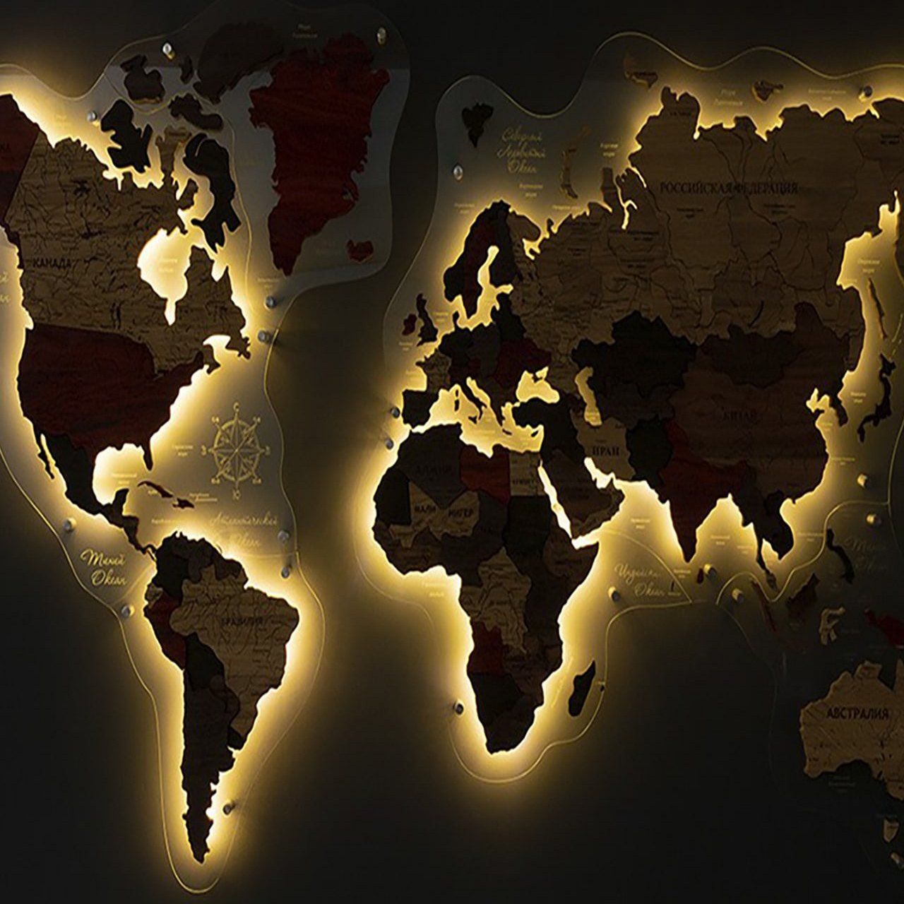 3D world maps made of precious woods amaze with a palette of bright shades. Each detail of the card is hand-sanded and coated with special hypoallergenic paints. Borders and country names are laser engraved. The contour light is provided by a special backlight, which is controlled by remote control.
