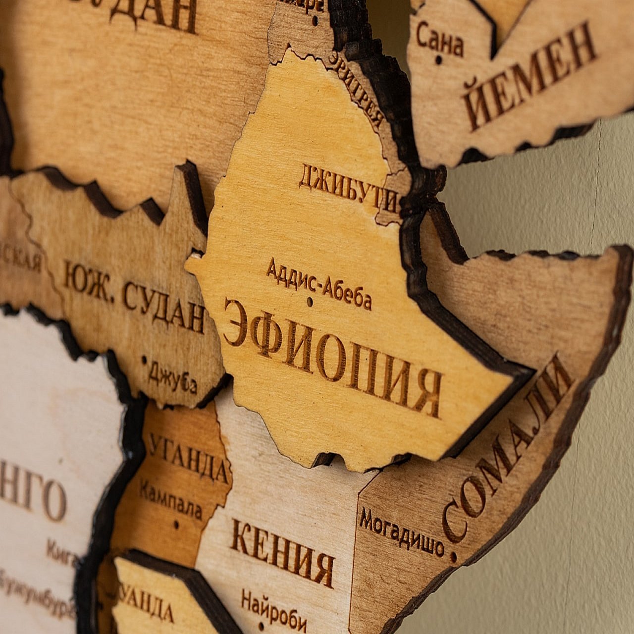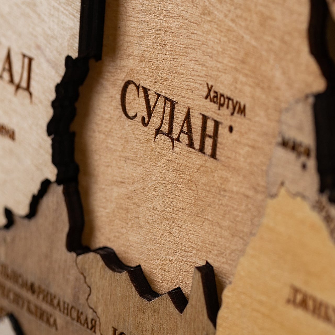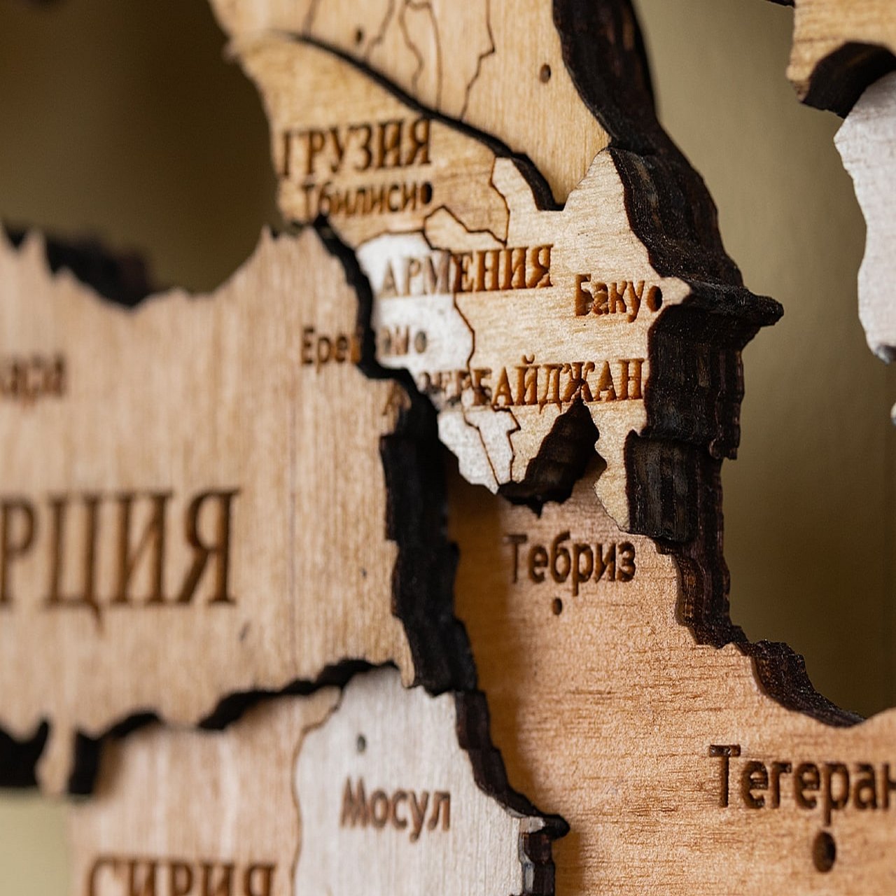 3D world maps made of precious woods amaze with a palette of bright shades. Each detail of the card is hand-sanded and coated with special hypoallergenic paints. Borders and country names are laser engraved. The contour light is provided by a special backlight, which is controlled by remote control.
