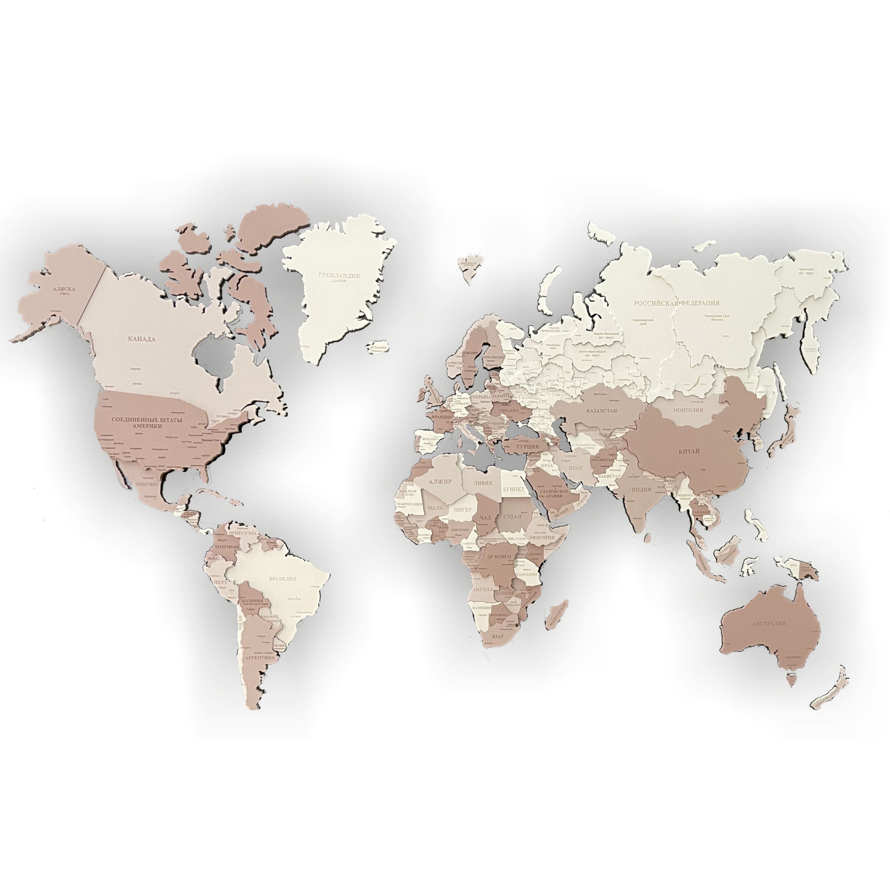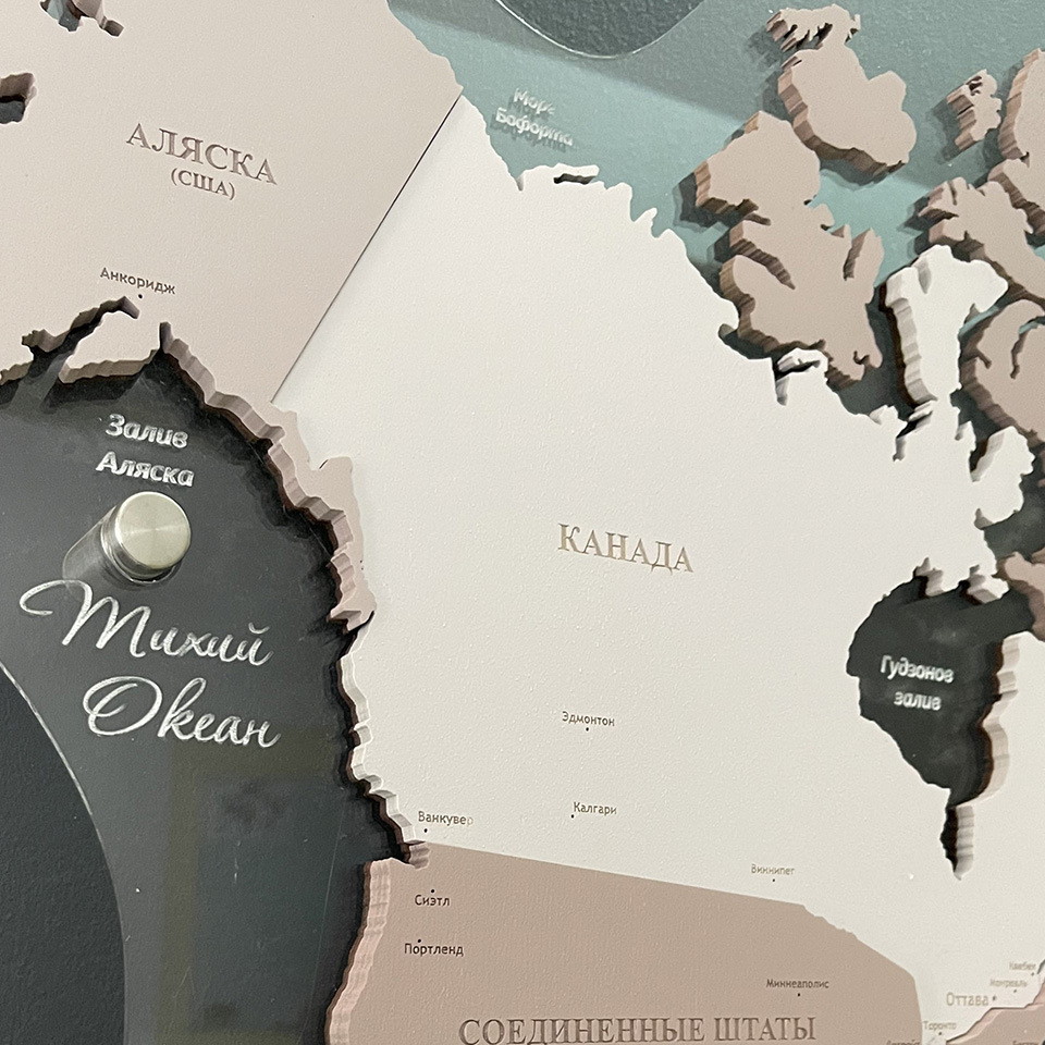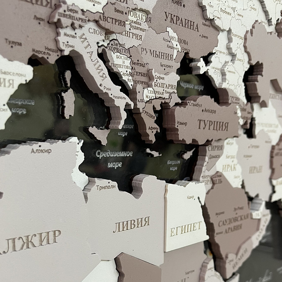 3D world maps made of precious woods amaze with a palette of bright shades. Each detail of the card is hand-sanded and coated with special hypoallergenic paints. Borders and country names are laser engraved. The contour light is provided by a special backlight, which is controlled by remote control.