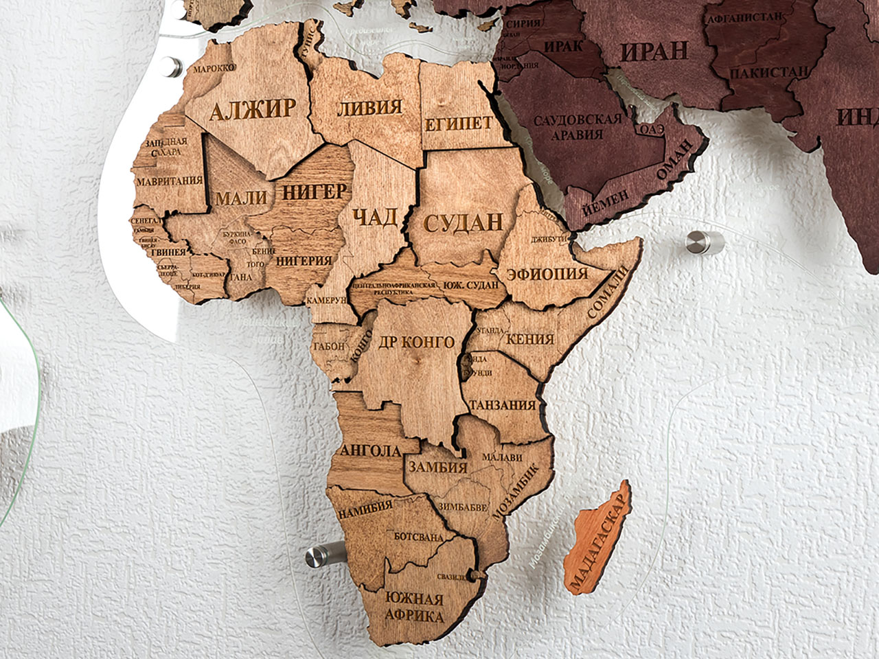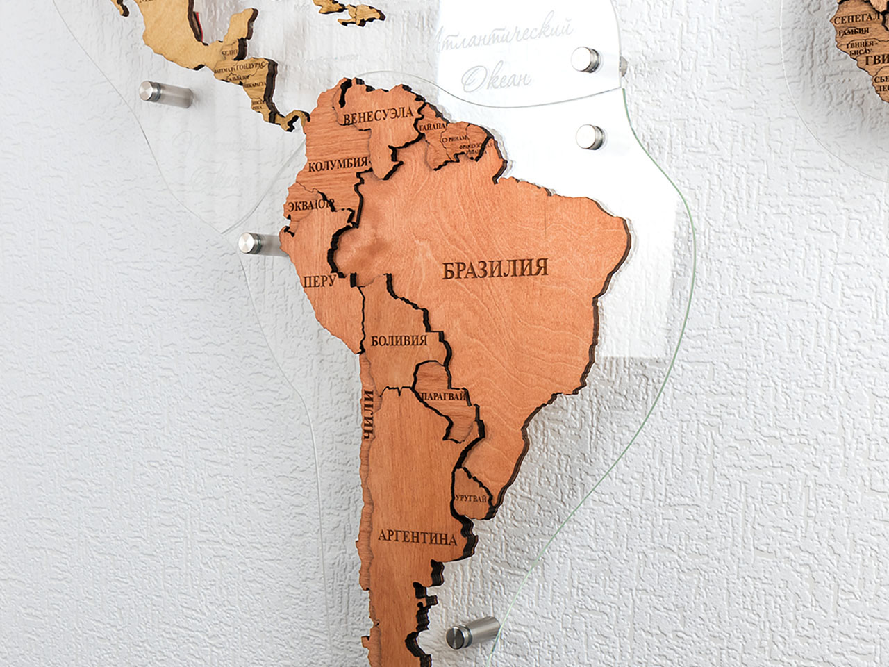 3D world maps made of precious woods amaze with a palette of bright shades. Each detail of the card is hand-sanded and coated with special hypoallergenic paints. Borders and country names are laser engraved. The contour light is provided by a special backlight, which is controlled by remote control.