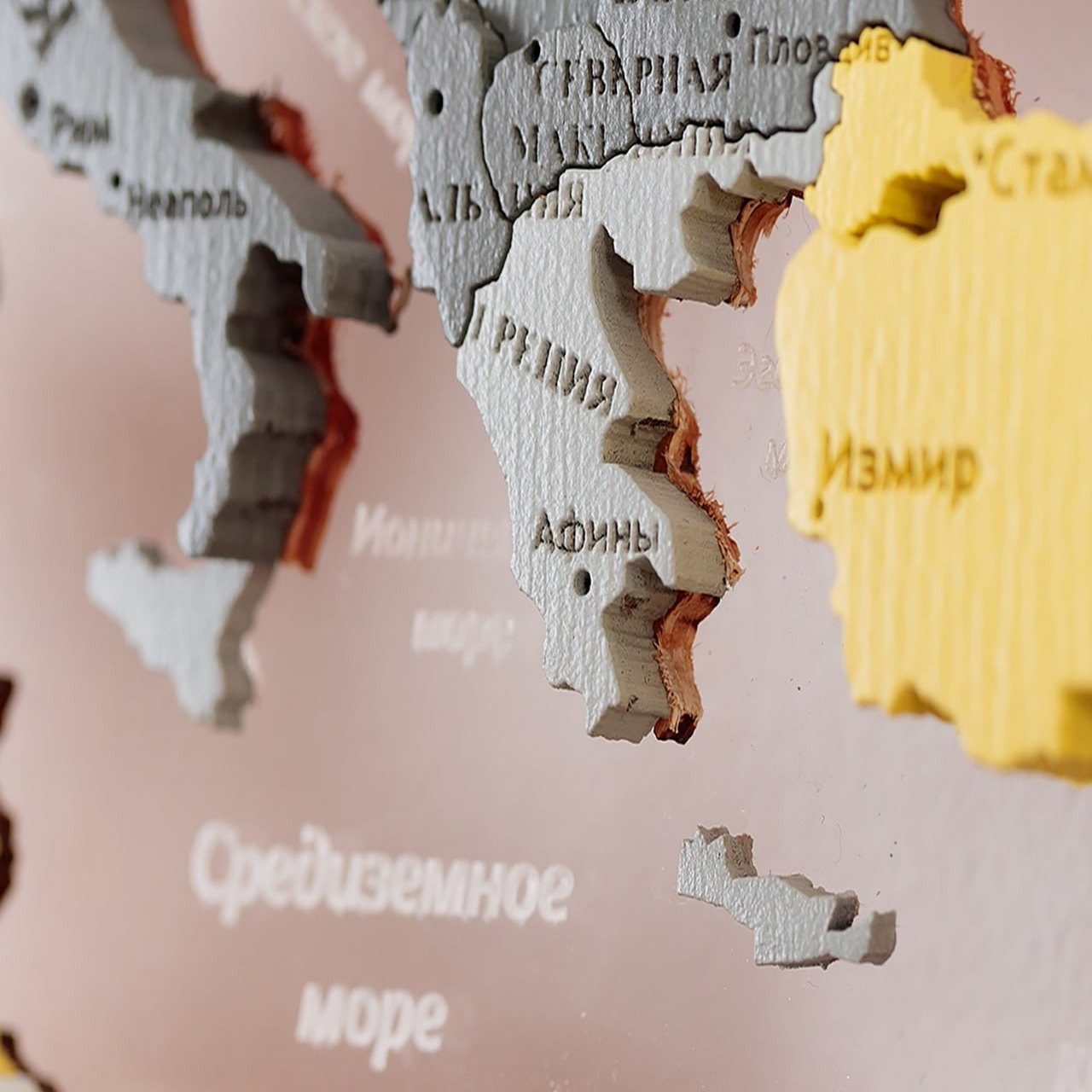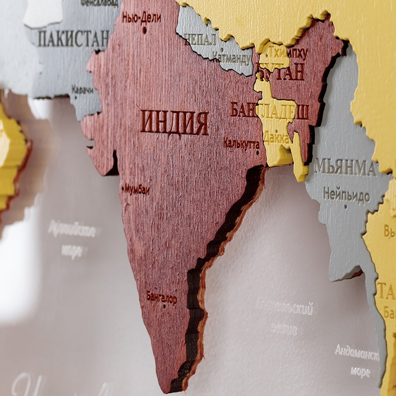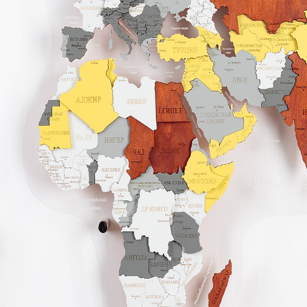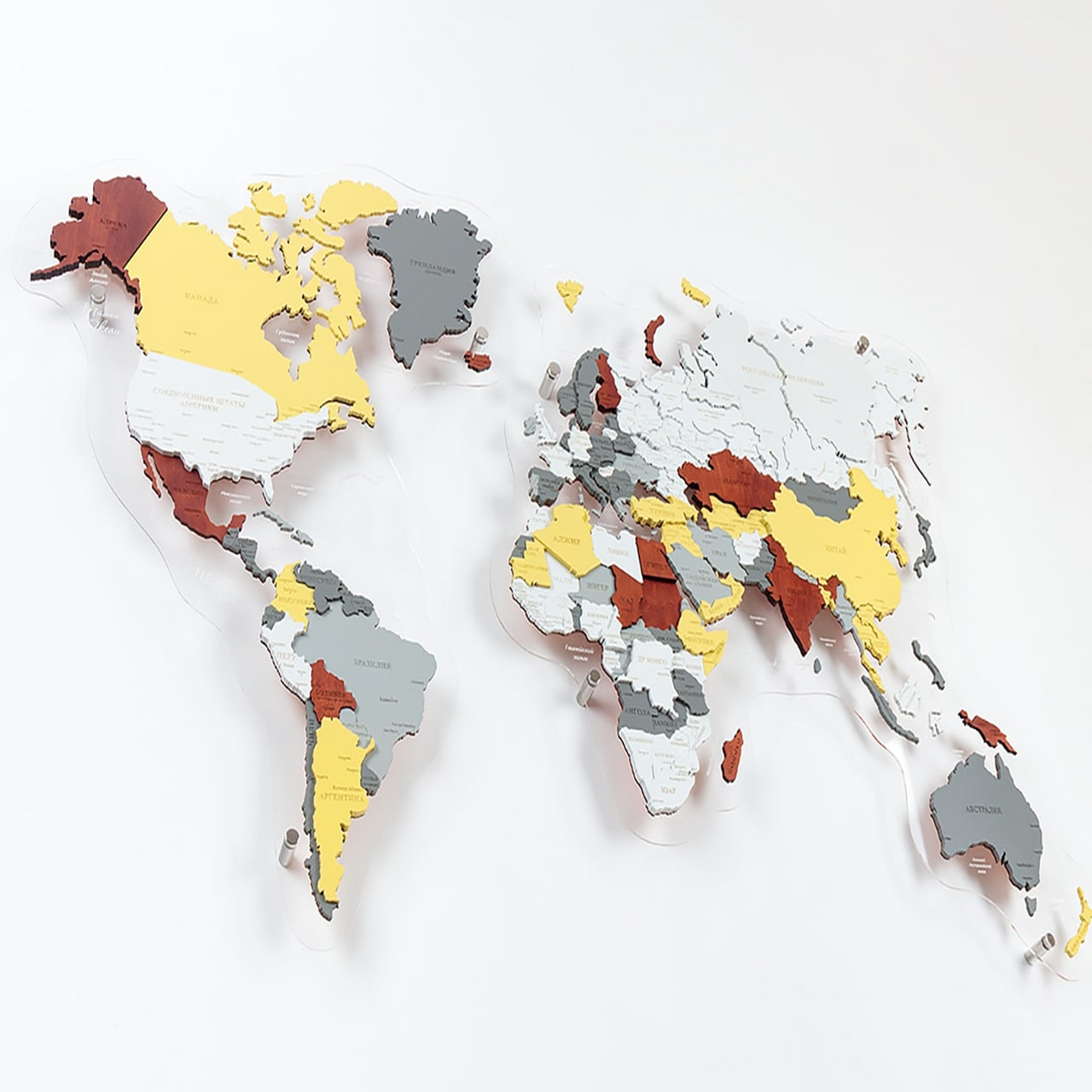 3D world maps made of precious woods amaze with a palette of bright shades. Each detail of the card is hand-sanded and coated with special hypoallergenic paints. Borders and country names are laser engraved. The contour light is provided by a special backlight, which is controlled by remote control.