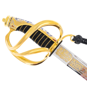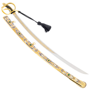The hilt of the saber is decorated with gilt and inlaid with cubic zirconia, giving it additional chic and luxury. The stones located at key points sparkle in the light, making the weapon even more attractive and unique. The ergonomic shape of the handle provides a comfortable and secure grip, which is especially important for combat weapons. Every element, from the crosshair to the pommel, is executed with the highest skill.