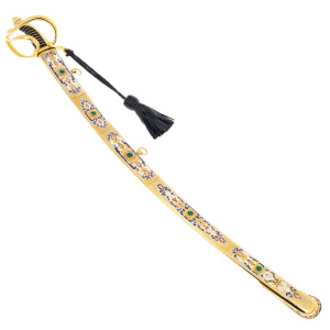 The blade of the saber reflects the classic oriental style with a slight bend, typical for sabers of this category. The hilt and scabbard of the saber are decorated with gold and cubic zirconia inserts, giving the product shine and status. These precious stones further emphasize the sophistication and luxury of the saber, making it a true piece of jewelry.