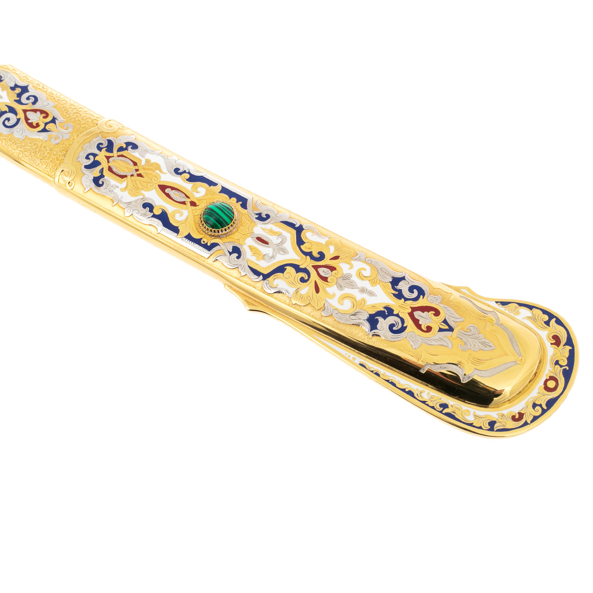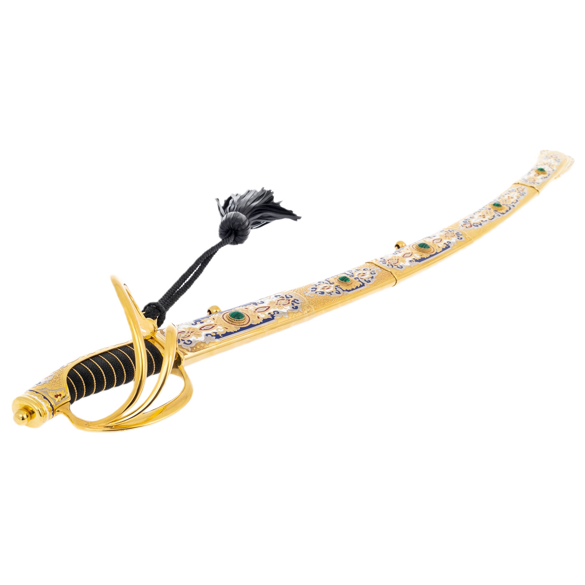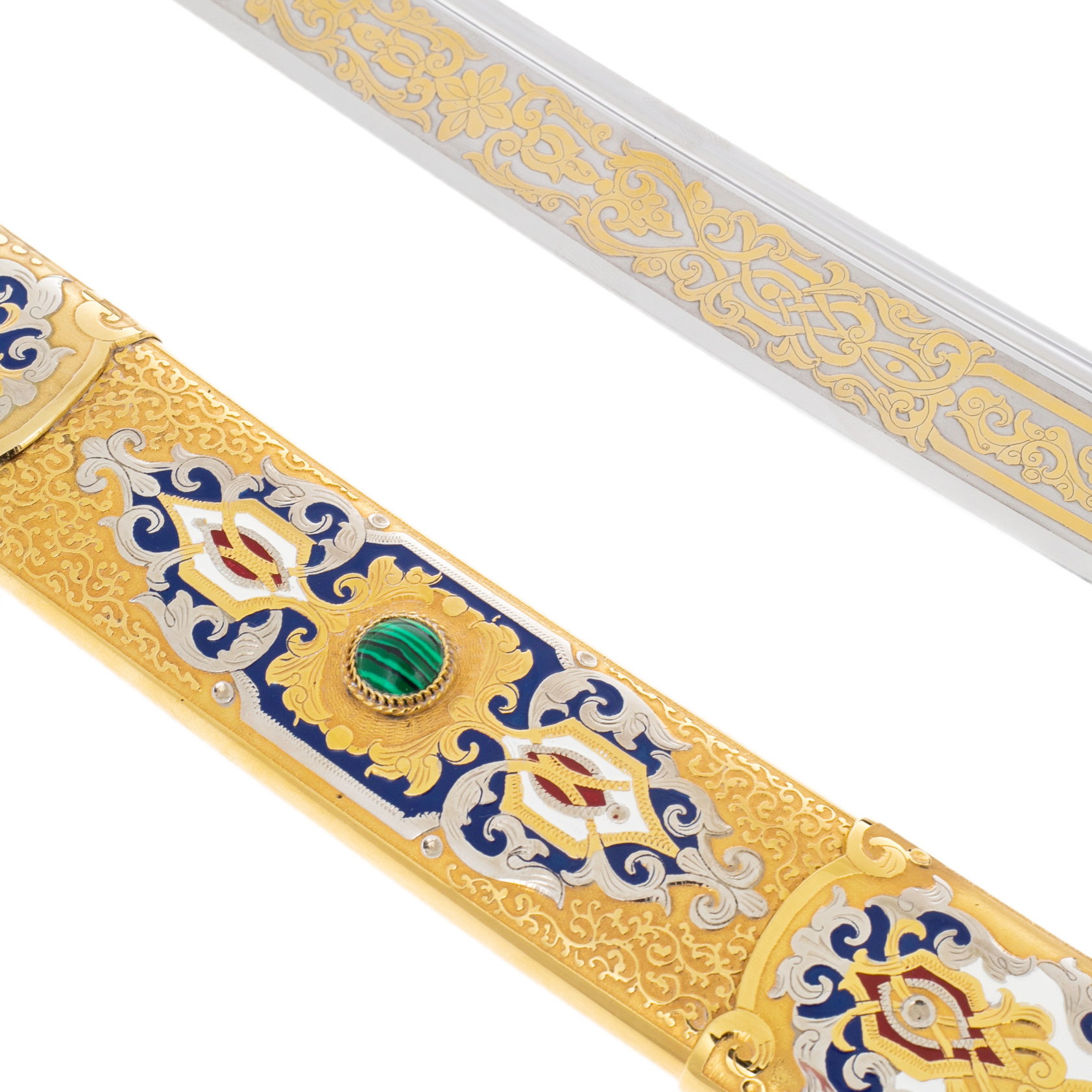 Златоустовская отделка считывается в каждом штрихе: на клинке видна тонкая орнаментальная гравировка, выполненная с ювелирной точностью и усиленная золотистыми акцентами. Ножны оформлены сложным декором — позолоченные поля, рельефные элементы, вставки эмали глубоких сине-белых тонов, выстроенные в строгий ритм, дополнены ограненными зелеными камнями, расставленными как знаки отличия. Контраст зеркальной стали и теплого золота, игра фактур — от гладкой полировки до матового зернения — создают ощущение предмета, рождённого не в потоке, а в мастерской, где ценят время, точность руки и культуру формы.