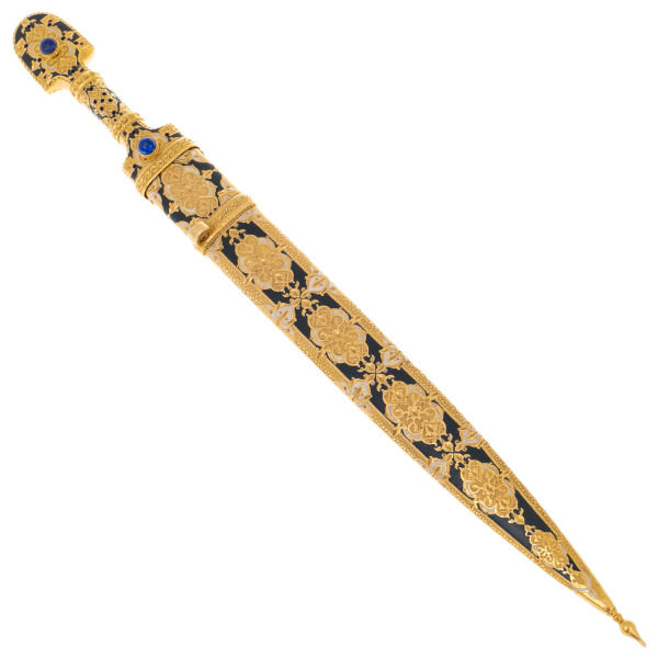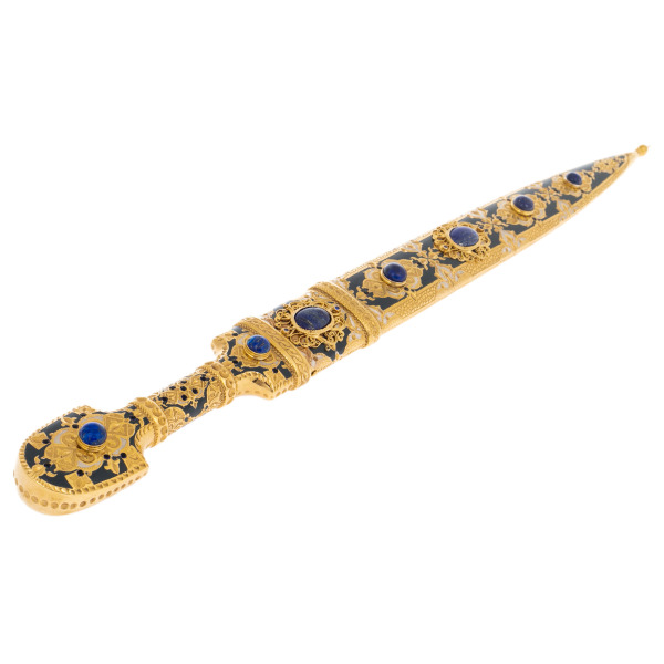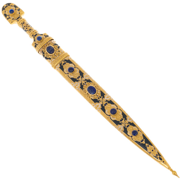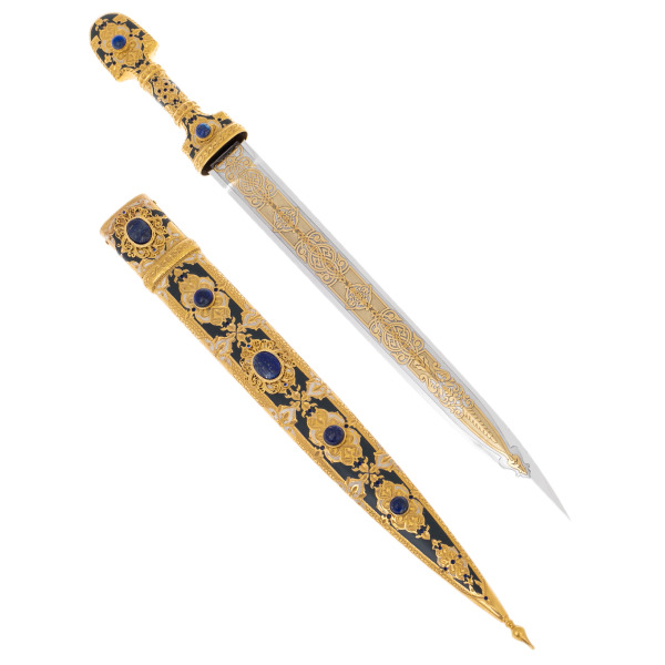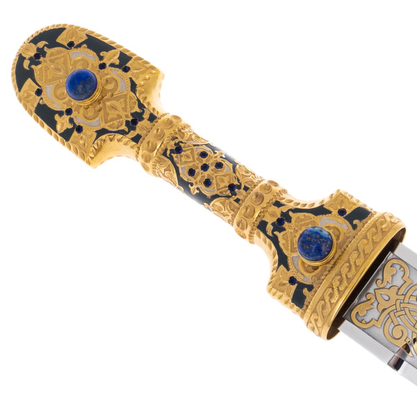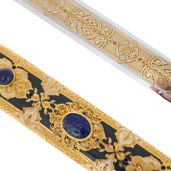 Рукоять и ножны оформлены сложным декоративным ансамблем, в котором золото, чернение и вставки из натурального лазурита соединяются в единую композицию, напоминающую о старинных драгоценных реликвиях. Сферические камни глубокого синего оттенка погружают взгляд в плоть минерала, будто насыщенного ночным небом, а окружающий их узор из растительных мотивов формирует впечатление старинной росписи, созданной в духе национального орнамента. Литьевые элементы, переходящие один в другой без видимых границ, завершают образ предмета, выполненного с ювелирной точностью.