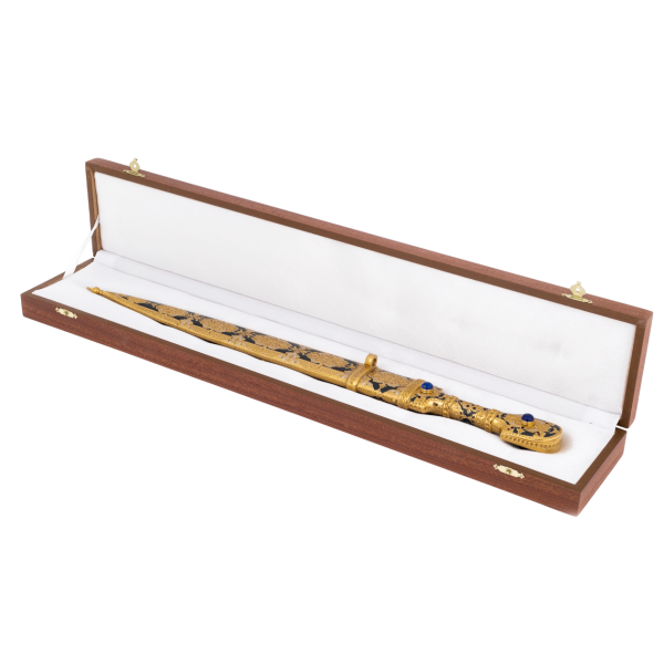Сувенирный кинжал златоустовской работы являет собой образец оружейного искусства, созданного в традициях кавказских мастеров. Лезвие из высококачественной стали, отполированное до зеркального блеска, украшено изящным орнаментом, выполненным методом гравировки и золочения. Рисунок, ложащийся на металл тончайшими линиями, подчёркивает строгую симметрию формы и создаёт ощущение оружия, предназначенного не для боя, а для созерцания и восхищения.
